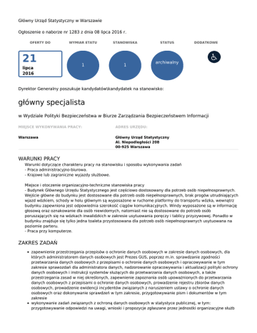 Główny Urząd Statystyczny w Warszawie Ogłoszenie o naborze nr 1283 z dnia 08 lipca 2016 r. OFERTY DO 21 lipca 2016 WYMIAR ETATU STANOWISKA 1 1 STATUS DODATKOWE archiwalny Dyrektor Generalny poszukuje kandydatów\kandydatek na stanowisko: główny specjalista w Wydziale Polityki Bezpieczeństwa w Biurze Zarządzania Bezpieczeństwem Informacji MIEJSCE WYKONYWANIA PRACY: ADRES URZĘDU: Warszawa Główny Urząd Statystyczny Al. Niepodległości 208 00-925 Warszawa WARUNKI PRACY Warunki dotyczące charakteru pracy na stanowisku i sposobu wykonywania zadań - Praca administracyjno-biurowa. - Krajowe lub zagraniczne wyjazdy służbowe. Miejsce i otoczenie organizacyjno-techniczne stanowiska pracy - Budynek Głównego Urzędu Statystycznego jest częściowo dostosowany dla potrzeb osób niepełnosprawnych. Wejście główne do budynku jest dostosowane dla potrzeb osób niepełnosprawnych, brak progów utrudniających wjazd wózkiem, schody w holu głównym są wyposażone w ruchome platformy do transportu wózka, wewnątrz budynku zapewniona jest odpowiednia szerokość ciągów komunikacyjnych. Windy wyposażone są w informację głosową oraz oznakowanie dla osób niewidomych, natomiast nie są dostosowane do potrzeb osób poruszających się na wózkach inwalidzkich w zakresie usytuowania poręczy i tablicy przyzywowej. Ponadto w budynku znajduje się tylko jedna toaleta przystosowana dla potrzeb osób niepełnosprawnych usytuowana na poziomie parteru. - Praca przy komputerze. ZAKRES ZADAŃ zapewnienie przestrzegania przepisów o ochronie danych osobowych w zakresie danych osobowych, dla których administratorem danych osobowych jest Prezes GUS, poprzez m.in. sprawdzanie zgodności przetwarzania danych osobowych z przepisami o ochronie danych osobowych i opracowywanie w tym zakresie sprawozdań dla administratora danych, nadzorowanie opracowywania i aktualizacji polityki ochrony danych osobowych i instrukcji systemów służących do przetwarzania danych osobowych, a także przestrzegania zasad w niej określonych, zapewnienie zapoznania osób upoważnionych do przetwarzania danych osobowych z przepisami o ochronie danych osobowych, prowadzenie rejestru zbiorów danych osobowych, prowadzenie ewidencji incydentów związanych z naruszeniem ustawy o ochronie danych osobowych oraz dokonywanie sprawdzeń w tym zakresie, przygotowywanie pism i dokumentów w tym zakresie wykonywanie zadań związanych z ochroną danych osobowych w statystyce publicznej, w tym: przygotowywanie odpowiedzi na uwagi, wnioski i propozycje zgłaszane przez jednostki organizacyjne służb statystyki publicznej z zakresu ochrony danych osobowych, nadzór nad procesami wydawania upoważnień do przetwarzania danych osobowych, koordynowanie prac w statystyce publicznej, w tym związanych z aktualizacją modelu ochrony danych osobowych wynikającego ze zmian przepisów wewnętrznych i zewnętrznych, współpraca z komórkami i jednostkami organizacyjnymi służb statystyki publicznej w zakresie ochrony danych osobowych obejmujące wyjazdy służbowe udział w pracach związanych z budową, utrzymaniem i rozwojem Systemu Zarządzania Bezpieczeństwem Informacji w statystyce publicznej, w tym w szczególności przygotowywanie rozwiązań oraz opracowanie Polityki Bezpieczeństwa Danych Osobowych i innych dokumentów dla tej grupy informacji chronionych współpraca z Generalnym Inspektorem Ochrony Danych Osobowych (GIODO), w tym: przeprowadzanie kontroli na zlecenie i opracowywanie sprawozdań z kontroli związane z ewentualnymi wyjazdami służbowymi, udział w kontrolach przeprowadzanych przez GIODO, przygotowywanie i przekazywanie wniosków o wpisanie zbiorów do rejestru GIODO, które nie są zwolnione z tego obowiązku analizowanie i opiniowanie projektów wewnętrznych i zewnętrznych przepisów prawa, monitorowanie zmian w dziedzinie ochrony danych osobowych krajowych i unijnych prace związane z procedurami przetargowymi i dostępem do informacji publicznej WYMAGANIA NIEZBĘDNE Wykształcenie: wyższe doświadczenie zawodowe: 3 lata w tym 2 lata doświadczenia związanego z wykonywaniem zadań z zakresu ochrony danych osobowych oraz co najmniej 1 rok pełnienia roli Administratora Bezpieczeństwa Informacji szkolenia z zakresu ochrony danych osobowych znajomość ustawy o statystyce publicznej znajomość ustawy o służbie cywilnej znajomość ustawy o ochronie danych osobowych wraz z rozporządzeniami wykonawczymi znajomość ustawy o informatyzacji podmiotów realizujących zadania publiczne umiejętność obsługi komputera (MS Office) wykorzystywanie wiedzy i doskonalenie zawodowe rzetelność organizacja pracy i orientacja na osiąganie celów komunikacja interpersonalna, komunikacja pisemna radzenie sobie w sytuacjach kryzysowych współpraca orientacja na klienta/interesanta Posiadanie obywatelstwa polskiego Korzystanie z pełni praw publicznych Nieskazanie prawomocnym wyrokiem za umyślne przestępstwo lub umyślne przestępstwo skarbowe WYMAGANIA DODATKOWE Wykształcenie: wyższe preferowany kierunek: informatyka lub prawo szkolenia dedykowane dla ABI z zakresu ochrony danych osobowych szkolenia z najlepszych praktyk w zakresie bezpieczeństwa informacji, w tym ISO 2700x znajomość norm z zakresu bezpieczeństwa informacji w tym norm ISO 2700x znajomość języka angielskiego na poziomie B2 doświadczenie z zakresu tworzenia lub rozwoju systemów zarządzania bezpieczeństwem informacji DOKUMENTY I OŚWIADCZENIA NIEZBĘDNE Życiorys/CV i list motywacyjny Kopie dokumentów potwierdzających spełnienie wymagania niezbędnego w zakresie wykształcenia kopie dokumentów potwierdzających spełnienie wymagania niezbędnego w zakresie doświadczenia zawodowego/stażu pracy w obszarze związanym z wykonywaniem zadań z zakresu ochrony danych osobowych i pełnienia roli Administratora Bezpieczeństwa Informacji kopie dokumentów potwierdzających odbycie szkolenia z zakresu ochrony danych osobowych Oświadczen