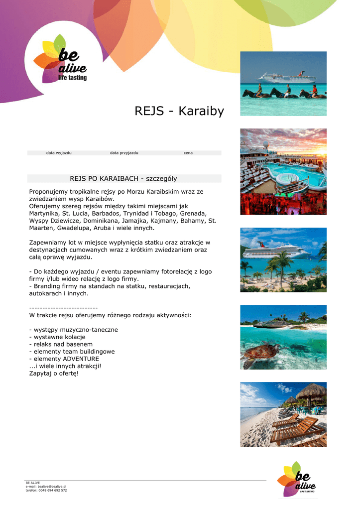 REJS - Karaiby data wyjazdu data przyjazdu cena REJS PO KARAIBACH - szczegóły Proponujemy tropikalne rejsy po Morzu Karaibskim wraz ze zwiedzaniem wysp Karaibów. Oferujemy szereg rejsów między takimi miejscami jak Martynika, St. Lucia, Barbados, Trynidad i Tobago, Grenada, Wyspy Dziewicze, Dominikana, Jamajka, Kajmany, Bahamy, St. Maarten, Gwadelupa, Aruba i wiele innych. Zapewniamy lot w miejsce wypłynięcia statku oraz atrakcje w destynacjach cumowanych wraz z krótkim zwiedzaniem oraz całą oprawę wyjazdu. - Do każdego wyjazdu / eventu zapewniamy fotorelację z logo firmy i/lub wideo relację z logo firmy. - Branding firmy na standach na statku, restauracjach, autokarach i innych. -------------------------W trakcie rejsu oferujemy różnego rodzaju aktywności: - występy muzyczno-taneczne - wystawne kolacje - relaks nad basenem - elementy team buildingowe - elementy ADVENTURE ...i wiele innych atrakcji! Zapytaj o ofertę! BE ALIVE e-mail: [email protected] telefon: 0048 694 692 572 Powered by TCPDF (www.tcpdf.org)