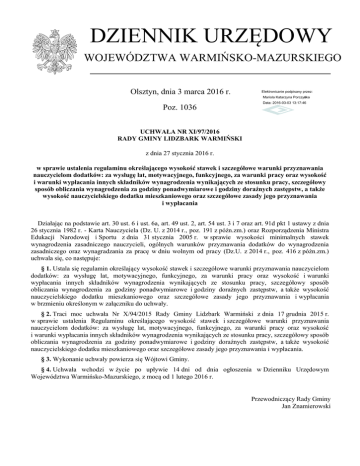 DZIENNIK URZĘDOWY WOJEWÓDZTWA WARMIŃSKO-MAZURSKIEGO Olsztyn, dnia 3 marca 2016 r. Elektronicznie podpisany przez: Mariola Katarzyna Porczyńska Poz. 1036 Data: 2016-03-03 13:17:46 UCHWAŁA NR XI/97/2016 RADY GMINY LIDZBARK WARMIŃSKI z dnia 27 stycznia 2016 r. w sprawie ustalenia regulaminu określającego wysokość stawek i szczegółowe warunki przyznawania nauczycielom dodatków: za wysługę lat, motywacyjnego, funkcyjnego, za warunki pracy oraz wysokość i warunki wypłacania innych składników wynagrodzenia wynikających ze stosunku pracy, szczegółowy sposób obliczania wynagrodzenia za godziny ponadwymiarowe i godziny doraźnych zastępstw, a także wysokość nauczycielskiego dodatku mieszkaniowego oraz szczegółowe zasady jego przyznawania i wypłacania Działając na podstawie art. 30 ust. 6 i ust. 6a, art. 49 ust. 2, art. 54 ust. 3 i 7 oraz art. 91d pkt 1 ustawy z dnia 26 stycznia 1982 r. - Karta Nauczyciela (Dz. U. z 2014 r., poz. 191 z późn.zm.) oraz Rozporządzenia Ministra Edukacji Narodowej i Sportu z dnia 31 stycznia 2005 r. w sprawie wysokości minimalnych stawek wynagrodzenia zasadniczego nauczycieli, ogólnych warunków przyznawania dodatków do wynagrodzenia zasadniczego oraz wynagradzania za pracę w dniu wolnym od pracy (Dz.U. z 2014 r., poz. 416 z późn.zm.) uchwala się, co następuje: § 1. Ustala się regulamin określający wysokość stawek i szczegółowe warunki przyznawania nauczycielom dodatków: za wysługę lat, motywacyjnego, funkcyjnego, za warunki pracy oraz wysokość i warunki wypłacania innych składników wynagrodzenia wynikających ze stosunku pracy, szczegółowy sposób obliczania wynagrodzenia za godziny ponadwymiarowe i godziny doraźnych zastępstw, a także wysokość nauczycielskiego dodatku mieszkaniowego oraz szczegółowe zasady jego przyznawania i wypłacania w brzmieniu określonym w załączniku do uchwały. § 2. Traci moc uchwała Nr X/94/2015 Rady Gminy Lidzbark Warmiński z dnia 17 grudnia 2015 r. w sprawie ustalenia Regulaminu określającego wysokość stawek i szczegółowe warunki przyznawania nauczycielom dodatków: za wysługę lat, motywacyjnego, funkcyjnego, za warunki pracy oraz wysokość i warunki wypłacania innych składników wynagrodzenia wynikających ze stosunku pracy, szczegółowy sposób obliczania wynagrodzenia za godziny ponadwymiarowe i godziny doraźnych zastępstw, a także wysokość nauczycielskiego dodatku mieszkaniowego oraz szczegółowe zasady jego przyznawania i wypłacania. § 3. Wykonanie uchwały powierza się Wójtowi Gminy. § 4. Uchwała wchodzi w życie po upływie 14 dni od dnia ogłoszenia w Dzienniku Urzędowym Województwa Warmińsko-Mazurskiego, z mocą od 1 lutego 2016 r. Przewodniczący Rady Gminy Jan Znamierowski Dziennik Urzędowy Województwa Warmińsko-Mazurskiego –2– Poz. 1036 Załącznik do Uchwały Nr XI/97/2016 Rady Gminy Lidzbark Warmiński z dnia 27 stycznia 2016 r. REGULAMIN określający wysokość stawek i szczegółowe warunki przyznawania nauczycielom dodatków: za wysługę lat, motywacyjnego, funkcyjnego, za warunki pracy oraz wysokość i warunki wypłacania innych składników wynagrodzenia wynikających ze stosunku pracy, szczegółowy sposób obliczania wynagrodzenia za godziny ponadwymiarowe i godziny doraźnych zastępstw. ROZDZIAŁ I POSTANOWIENIA WSTĘPNE § 1. 1. Regulamin stosuje się do nauczycieli zatrudnionych w szkołach podstawowych, gimnazjach prowadzonych przez Gminę Lidzbark Warmiński. 2. Regulamin określa dla nauczycieli poszczególnych stopni awansu zawodowego: 1) wysokość stawek oraz szczegółowe warunki przyznawania dodatków: a) za wysługę lat, b) motywacyjnego, c) funkcyjnego, d) za warunki pracy, 2) szczegółowy sposób obliczania wynagrodzenia za godziny ponadwymiarowe oraz za godziny doraźnych zastępstw, 3) wysokość i warunki wypłacania innych świadczeń wynikających ze stosunku pracy. § 2. Ilekroć w dalszych przepisach bez bliższego określenia jest mowa o: 1) regulaminie - rozumie się przez to regulamin określający wysokość oraz szczegółowe warunki przyznawania nauczycielom dodatków: za wysługę lat, motywacyjnego, funkcyjnego, za warunki pracy, i niektóre inne składniki wynagrodzenia, zasady wynagrodzenia za godziny ponadwymiarowe oraz za godziny doraźnych zastępstw, a także wysokość oraz szczegółowe zasady przyznawania i wypłacania dodatku mieszkaniowego, 2) Karcie Nauczyciela - rozumie się przez to ustawę z dnia 26 stycznia 1982 r. - Karta Nauczyciela (Dz. U. z 2014 r. poz. 191 z późn. zm.), 3) rozporządzeniu - należy przez to rozumieć rozporządzenie Ministra Edukacji Narodowej i Sportu z dnia 31 stycznia 2005 r. w sprawie wysokości minimalnych stawek wynagrodzenia zasadniczego nauczycieli, ogólnych warunków przyznawania dodatków do wynagrodzenia zasadniczego oraz wynagradzania za pracę w dniu wolnym od pracy (Dz. U. z 2014r., poz. 416 z późn. zm.), 4) organie prowadzącym szkołę, placówkę oświatową - rozumie się przez to Gminę Lidzbark Warmiński, 5) szkole - należy przez to rozumieć szkołę, gimnazjum lub placówkę, dla której organem prowadzącym jest Gmina Lidzbark Warmiński, 6) dyrektorze lub wicedyrektorze - należy rozumieć dyrektora lub wicedyrektora jednostki organizacyjnej samorządu terytorialnego, o której mowa w § 1 ust. 1 Regulaminu, 7) nauczycielach bez bliższego określenia - rozumie się przez to nauczycieli, o których mowa w § 1 ust. 1 Regulaminu, 8) roku szkolnym - należy przez to rozumieć okres pracy szkoły, placówki oświatowej od 1 września danego roku do 31 sierpnia roku następnego, 9) klasie - należy przez to rozumieć także oddział lub grupę, 10) uczniu - rozumie się przez to także wychowanka, Dziennik Urzędowy Województwa Warmińsko-Mazurskiego –3– Poz. 1036 11) tygodniowym obowiązkowym wymiarze godzin - należy przez to rozumieć tygodniowy obowiązkowy wymiar godzin, o którym mowa w art. 42 ust. 3 Ka
