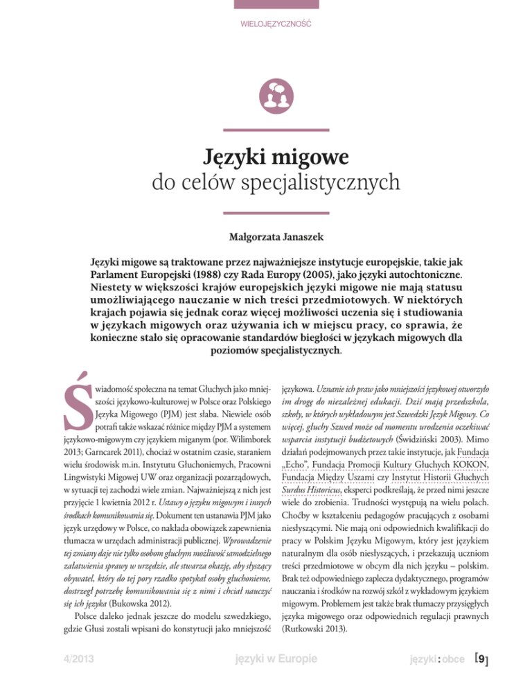 wielojęzyczność Języki migowe do celów specjalistycznych Małgorzata Janaszek Języki migowe są traktowane przez najważniejsze instytucje europejskie, takie jak Parlament Europejski (1988) czy Rada Europy (2005), jako języki autochtoniczne. Niestety w większości krajów europejskich języki migowe nie mają statusu umożliwiającego nauczanie w nich treści przedmiotowych. W niektórych krajach pojawia się jednak coraz więcej możliwości uczenia się i studiowania w językach migowych oraz używania ich w miejscu pracy, co sprawia, że konieczne stało się opracowanie standardów biegłości w językach migowych dla poziomów specjalistycznych. Ś wiadomość społeczna na temat Głuchych jako mniejszości językowo-kulturowej w Polsce oraz Polskiego Języka Migowego (PJM) jest słaba. Niewiele osób potrafi także wskazać różnice między PJM a systemem językowo-migowym czy językiem miganym (por. Wilimborek 2013; Garncarek 2011), chociaż w ostatnim czasie, staraniem wielu środowisk m.in. Instytutu Głuchoniemych, Pracowni Lingwistyki Migowej UW oraz organizacji pozarządowych, w sytuacji tej zachodzi wiele zmian. Najważniejszą z nich jest przyjęcie 1 kwietnia 2012 r. Ustawy o języku migowym i innych środkach komunikowania się. Dokument ten ustanawia PJM jako język urzędowy w Polsce, co nakłada obowiązek zapewnienia tłumacza w urzędach administracji publicznej. Wprowadzenie tej zmiany daje nie tylko osobom głuchym możliwość samodzielnego załatwienia sprawy w urzędzie, ale stwarza okazję, aby słyszący obywatel, który do tej pory rzadko spotykał osoby głuchonieme, dostrzegł potrzebę komunikowania się z nimi i chciał nauczyć się ich języka (Bukowska 2012). Polsce daleko jednak jeszcze do modelu szwedzkiego, gdzie Głusi zostali wpisani do konstytucji jako mniejszość 4/2013 językowa. Uznanie ich praw jako mniejszości językowej otworzyło im drogę do niezależnej edukacji. Dziś mają przedszkola, szkoły, w których wykładowym jest Szwedzki Język Migowy. Co więcej, głuchy Szwed może od momentu urodzenia oczekiwać wsparcia instytucji budżetowych (Świdziński 2003). Mimo działań podejmowanych przez takie instytucje, jak Fundacja „Echo”, Fundacja Promocji Kultury Głuchych KOKON, Fundacja Między Uszami czy Instytut Historii Głuchych Surdus Historicus, eksperci podkreślają, że przed nimi jeszcze wiele do zrobienia. Trudności występują na wielu polach. Choćby w kształceniu pedagogów pracujących z osobami niesłyszącymi. Nie mają oni odpowiednich kwalifikacji do pracy w Polskim Języku Migowym, który jest językiem naturalnym dla osób niesłyszących, i przekazują uczniom treści przedmiotowe w obcym dla nich języku – polskim. Brak też odpowiedniego zaplecza dydaktycznego, programów nauczania i środków na rozwój szkół z wykładowym językiem migowym. Problemem jest także brak tłumaczy przysięgłych języka migowego oraz odpowiednich regulacji prawnych (Rutkowski 2013). języki w Europie [ 9 ] wielojęzyczność Kontekst europejski Duże znacznie dla profesjonalnego podejścia do języków migowych mają międzynarodowe konsultacje i projekty z udziałem ekspertów. Tego typu spotkania są prowadzone w Europie od wielu lat. W ramach takich programów, jak Leonardo da Vinci czy Grundtvig, w ostatnich latach zostały opracowane materiały oraz rozwiązania wykorzystywane do dzisiaj. Warto wspomnieć o najważniejszych z nich: yy DSigns – to dwuletni projekt finansowany z programu Leonardo da Vinci (opracowanie zakończone w 2009 r.). W ramach projektu powstały e-learningowe kursy doskonalenia służące do nauki języka migowego w miejscu pracy. Moduły szkoleniowe zostały opracowane dla brytyjskiego, irlandzkiego, czeskiego, greckiego i cypryjskiego języka migowego. Obecnie projekt jest testowany i dostosowywany do potrzeb użytkowników. yySignAll – finansowany z programu Leonardo da Vinci. Celem projektu jest opracowanie i dostosowanie treści kursu Postrzeganie głuchoty (Perspectives on Deafness), realizowanego przez Centrum Badań Niesłyszących Trinity College w Dublinie w ramach studiów licencjackich, do realiów każdego kraju. Kurs jest spojrzeniem na historię, współczesność, lokalne i międzynarodowe postrzeganie osób niesłyszących oraz ich tożsamości. Raport z realizacji projektu jest kompendium wiedzy na ten temat. yy Medisigns – celem projektu jest upowszechnienie zastosowania języka migowego w medycynie poprzez wyposażenie głuchych pacjentów, tłumaczy i personelu medycznego w umiejętności komunikacyjne i językowe. W ramach tego projektu powstały specjalistyczne materiały umożliwiające naukę języka migowego w celu nabycia umiejętności podstawowej komunikacji z pacjentami niesłyszącymi. Więcej informacji znajduje się w przewodniku po rezultatach projektu. yy DeafVoc2 – celem projektu było opracowanie materiałów w języku migowym dla potrzeb zawodowych. W ramach projektu powstało szczegółowe opracowanie materiałów dla fińskiego, słoweńskiego, irlandzkiego i austriackiego języka migowego. yy SignLEF: Sign Language European Frame – wspiera różnorodność oraz poprawia jakość nauczania języków migowych. Głównym rezultatem projektu ma być osiągnięcie podobnego traktowania języków migowych [ 10 ] w Europie, a także wzmocnienie praw i dostępu do równego ich traktowania. Ważnym punktem jest także przygotowanie wspólnych podstaw do studiowania języków migowych zgodnie ze wskazówkami Europejskiego systemu opisu kształcenia językowego oraz stworzenia opisu biegłości językowej dla austriackiego, katalońskiego i włoskiego języka migowego. yy SignGram – propozycja teoretycznego ujęcia problemu języka migowego. Na stronie internetowej został umieszczony bogaty zbiór publikacji i sugestie kierunków, w których powinny rozwijać się badania nad językiem migowym. PROSign – projekt Rady Europy Instytucją, któ