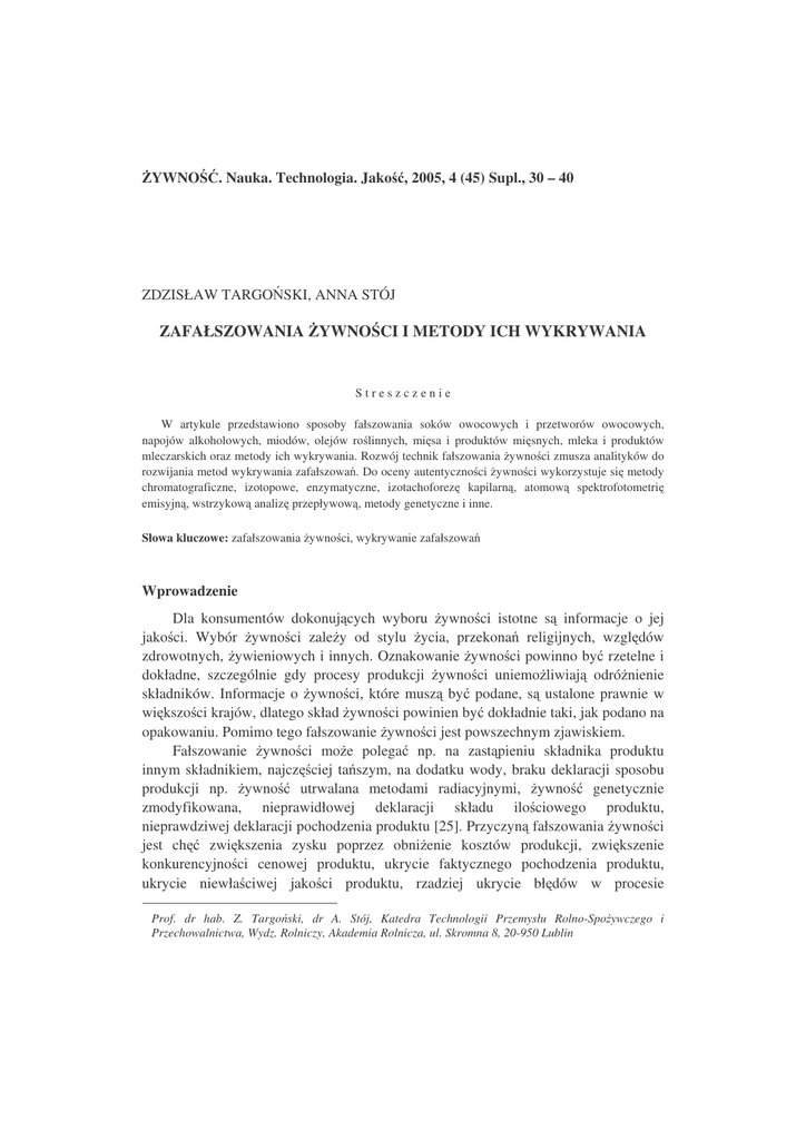 YWNO . Nauka. Technologia. Jako , 2005, 4 (45) Supl., 30 – 40 ZDZISŁAW TARGO SKI, ANNA STÓJ ZAFAŁSZOWANIA YWNO CI I METODY ICH WYKRYWANIA Streszczenie W artykule przedstawiono sposoby fałszowania soków owocowych i przetworów owocowych, napojów alkoholowych, miodów, olejów ro linnych, mi sa i produktów mi snych, mleka i produktów mleczarskich oraz metody ich wykrywania. Rozwój technik fałszowania ywno ci zmusza analityków do rozwijania metod wykrywania zafałszowa . Do oceny autentyczno ci ywno ci wykorzystuje si metody chromatograficzne, izotopowe, enzymatyczne, izotachoforez kapilarn , atomow spektrofotometri emisyjn , wstrzykow analiz przepływow , metody genetyczne i inne. Słowa kluczowe: zafałszowania ywno ci, wykrywanie zafałszowa Wprowadzenie Dla konsumentów dokonuj cych wyboru ywno ci istotne s informacje o jej jako ci. Wybór ywno ci zale y od stylu ycia, przekona religijnych, wzgl dów zdrowotnych, ywieniowych i innych. Oznakowanie ywno ci powinno by rzetelne i dokładne, szczególnie gdy procesy produkcji ywno ci uniemo liwiaj odró nienie składników. Informacje o ywno ci, które musz by podane, s ustalone prawnie w wi kszo ci krajów, dlatego skład ywno ci powinien by dokładnie taki, jak podano na opakowaniu. Pomimo tego fałszowanie ywno ci jest powszechnym zjawiskiem. Fałszowanie ywno ci mo e polega np. na zast pieniu składnika produktu innym składnikiem, najcz ciej ta szym, na dodatku wody, braku deklaracji sposobu produkcji np. ywno utrwalana metodami radiacyjnymi, ywno genetycznie zmodyfikowana, nieprawidłowej deklaracji składu ilo ciowego produktu, nieprawdziwej deklaracji pochodzenia produktu [25]. Przyczyn fałszowania ywno ci jest ch zwi kszenia zysku poprzez obni enie kosztów produkcji, zwi kszenie konkurencyjno ci cenowej produktu, ukrycie faktycznego pochodzenia produktu, ukrycie niewła ciwej jako ci produktu, rzadziej ukrycie bł dów w procesie Prof. dr hab. Z. Targo ski, dr A. Stój, Katedra Technologii Przemysłu Rolno-Spo ywczego i Przechowalnictwa, Wydz. Rolniczy, Akademia Rolnicza, ul. Skromna 8, 20-950 Lublin ZAFAŁSZOWANIA YWNO CI I METODY ICH WYKRYWANIA 31 technologicznym. Skutki fałszowania ywno ci odczuwaj zarówno konsumenci, gdy kupuj produkty niepełnowarto ciowe, nieautentyczne, jak i uczciwi producenci przegrywaj cy w nieuczciwej konkurencji. Niektóre zafałszowane produkty mog by szkodliwe dla zdrowia np. glikol etylowy w winach. Ujawnienie zafałszowania ywno ci szkodzi firmie, nara a na utrat rynków zbytu i kary finansowe. Zafałszowaniom mo e podlega wi kszo produktów spo ywczych: soki owocowe i przetwory owocowe, napoje alkoholowe, miody, oleje ro linne, mi so i produkty mi sne oraz mleko i produkty mleczarskie. Soki owocowe i przetwory owocowe Do najcz stszych zafałszowa soków owocowych nale : dodatek cukru, dodatek kwasów organicznych, rozcie czanie wod , niewła ciwy skład, dodatek soku pochodz cego z cz ci owoców (wytłoki, skórki), dodatek niedeklarowanego, ta szego soku oraz nieprawdziwa deklaracja pochodzenia soku. W wielu krajach funkcjonuj organizacje zajmuj ce si badaniem autentyczno ci soków owocowych. Wykorzystuj c nowoczesne techniki analizy instrumentalnej i statystycznej ustalaj one zawarto standardow poszczególnych składników soków owocowych, uwzgl dniaj c fakt, e skład soków owocowych podlega wpływom wielu czynników, takich jak: odmiana owoców, stopie ich dojrzało ci, warunki klimatyczno-glebowe oraz przebieg procesu technologicznego. Stowarzyszenie Przemysłu Soków i Nektarów z Owoców i Warzyw Unii Europejskiej (AIJN) opracowało Kodeks Post powania (Codex of Practice) przy ocenie autentyczno ci soków owocowych. Podstawowym sposobem wykrywania niewła ciwego składu soków owocowych jest porównywanie ich składu chemicznego z ustalonymi warto ciami standardowymi (ekstrakt ogólny, glukoza, fruktoza, sacharoza, kwas cytrynowy, kwas D-izocytrynowy, kwas D- i L-jabłkowy, składniki mineralne lub popiół ogółem, indeks formolowy, wolne aminokwasy, kwas fumarowy, kwas mlekowy, kwas winowy, sorbitol, hydroksymetylofurfural i inne) [5, 20, 21]. Soki znajduj ce si w handlu s przede wszystkim otrzymywane przez rozcie czenie koncentratów soków owocowych do naturalnych st e . W pewnych przypadkach producenci mog dodawa wi cej wody ni to wynika z przyj tych norm. W celu maskowania rozcie czenia wod , do soków dodaj cukier i kwasy organiczne pochodzenia przemysłowego. W celu wykrycia tego rodzaju zafałszowa stosuje si metody izotopowe SIRA-MS pozwalaj ce okre li stosunki izotopów w gla 13C/12C, tlenu 18O/16O i wodoru 2H/1H za pomoc spektrometru masowego, gdy znana jest prawidłowo , e udział poszczególnych izotopów w przyrodzie jest stały. W celu odró nienia cukru naturalnego od cukru dodanego stosuje si metod analizy stosunku izotopów w gla (SCIRA-MS). Ro liny nale ce do ró nych szlaków metabolicznych: C3, C4, CAM w czasie fotosyntezy wytwarzaj cukry ró ni ce si stosunkami izotopów 32 Zdzisław Targo ski, Anna Stój w gla. Metoda SCIRA-MS jest stosowana do wykrywania dodatku cukru trzcinowego i kukurydzianego (C4) do soków owocowych (C3), ale t metod nie mo na wykry dodatku cukru buraczanego do soków owocowych, gdy zarówno burak cukrowy, jak i owoce, z których otrzymuje si soki, nale do tego samego szlaku metabolicznego (C3). Wówczas stosuje si metod izotopow SNIF-NMR, czyli metod wyznaczenia wzgl dnego obsadzenia frakcji izotopów przy wykorzystaniu j drowego rezonansu magnetycznego. W tej metodzie wykorzystano kolejn prawidłowo , e zawarto deuteru w specyficznych miejscach cz steczki cukru naturalnego jest wi ksza ani eli w cukrze buraczanym. Soki owocowe poddaje si fermentacji alkoholowej, a otrzymany etanol destyluje si ilo ciowo i analizuje technik NMR (rys. 1). Dodatek cukru inwertowanego mo na po rednio wykry poprzez analiz oligosacharydów metod wysokoci nieniowej chromatografii anionowymiennej z detekcj amperometryczn (HPAEC-PAD). Oligosacharydy s