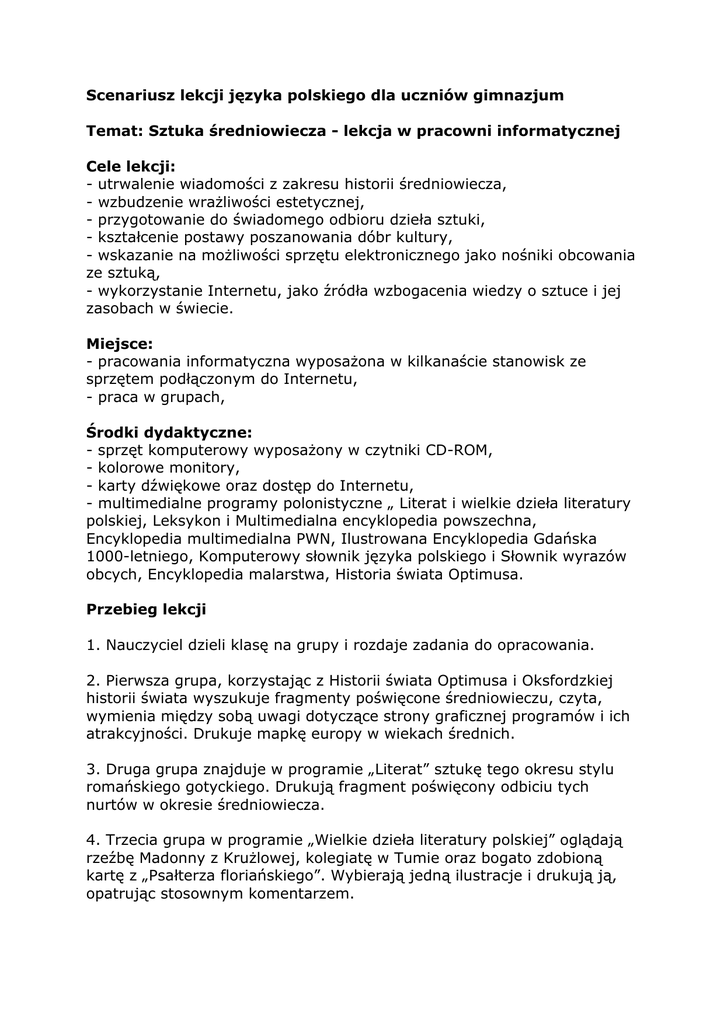Scenariusz lekcji języka polskiego dla uczniów gimnazjum Temat: Sztuka średniowiecza - lekcja w pracowni informatycznej Cele lekcji: - utrwalenie wiadomości z zakresu historii średniowiecza, - wzbudzenie wrażliwości estetycznej, - przygotowanie do świadomego odbioru dzieła sztuki, - kształcenie postawy poszanowania dóbr kultury, - wskazanie na możliwości sprzętu elektronicznego jako nośniki obcowania ze sztuką, - wykorzystanie Internetu, jako źródła wzbogacenia wiedzy o sztuce i jej zasobach w świecie. Miejsce: - pracowania informatyczna wyposażona w kilkanaście stanowisk ze sprzętem podłączonym do Internetu, - praca w grupach, Środki dydaktyczne: - sprzęt komputerowy wyposażony w czytniki CD-ROM, - kolorowe monitory, - karty dźwiękowe oraz dostęp do Internetu, - multimedialne programy polonistyczne „ Literat i wielkie dzieła literatury polskiej, Leksykon i Multimedialna encyklopedia powszechna, Encyklopedia multimedialna PWN, Ilustrowana Encyklopedia Gdańska 1000-letniego, Komputerowy słownik języka polskiego i Słownik wyrazów obcych, Encyklopedia malarstwa, Historia świata Optimusa. Przebieg lekcji 1. Nauczyciel dzieli klasę na grupy i rozdaje zadania do opracowania. 2. Pierwsza grupa, korzystając z Historii świata Optimusa i Oksfordzkiej historii świata wyszukuje fragmenty poświęcone średniowieczu, czyta, wymienia między sobą uwagi dotyczące strony graficznej programów i ich atrakcyjności. Drukuje mapkę europy w wiekach średnich. 3. Druga grupa znajduje w programie „Literat” sztukę tego okresu stylu romańskiego gotyckiego. Drukują fragment poświęcony odbiciu tych nurtów w okresie średniowiecza. 4. Trzecia grupa w programie „Wielkie dzieła literatury polskiej” oglądają rzeźbę Madonny z Krużlowej, kolegiatę w Tumie oraz bogato zdobioną kartę z „Psałterza floriańskiego”. Wybierają jedną ilustracje i drukują ją, opatrując stosownym komentarzem. 5. Grupa zapoznaje się ze sposobami kompletowania danych za pomocą wyszukiwarek internetowych. Uczniowie wpisują nazwisko twórcy do wyszukiwarki, a następnie przeglądają odnalezione w sieci strony, które mu poświęcono. Dokonują selekcji materiału, porządkują go i budują własną bazę danych na jego temat. Są to nazwiska twórców okresu średniowiecza. 6. Kolejnym krokiem jest poszukiwanie galerii malarstwa w Internecie. Po odnalezieniu odpowiednich stron uczniowie przeglądają zawartość (najczęściej nazwiska ułożone są w układzie alfabetycznym) lub wybierają okres (w naszym przypadku – średniowiecze). Galerii malarstwa w Internecie jest bardzo wiele, ale zainteresowani sztuką średniowiecza powinni koniecznie odwiedzić te pod adresem http://sredniowiecze.vlo.krakow.pl/sztuka.html 7. Ostatnim ćwiczeniem w tej części zajęć będzie kompletowanie haseł związanych ze średniowieczem umieszczonych w dwóch multimedialnych encyklopediach ogólnych - PWN i wydawnictwa Fogra. Jak poprzednio, dzielimy klasę na dwie grupy i przystępujemy do pracy. Po jej zakończeniu każda z grup prezentuje spostrzeżenia, ilość odnalezionych hasłem jakość ich opracowania, dostępną ikonografie. Wszyscy zapisują wnioski. 8. Praca domowa Przygotuj prezentację sylwetki wybranego twórcy okresu średniowiecza wraz z charakterystyką jego twórczości i wybraną ikonografią.