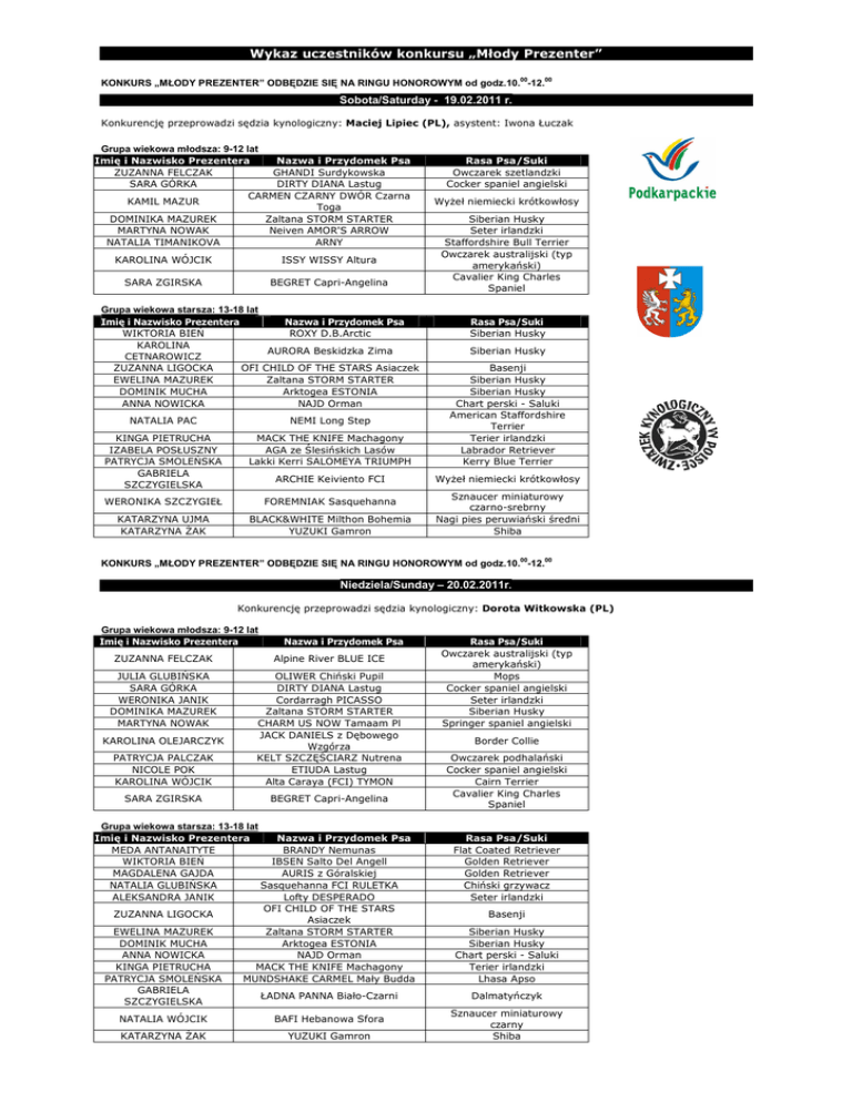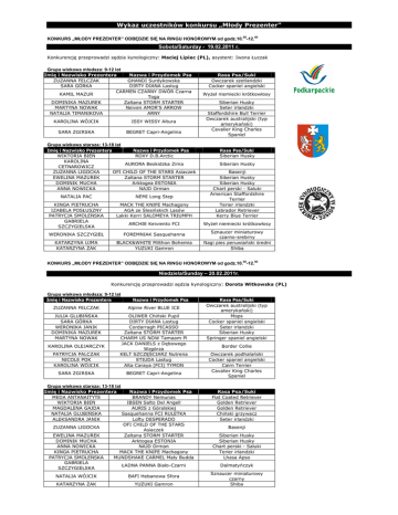 Wykaz uczestników konkursu „Młody Prezenter” 00 00 KONKURS „MŁODY PREZENTER” ODBĘDZIE SIĘ NA RINGU HONOROWYM od godz.10. -12. Sobota/Saturday - 19.02.2011 r. Konkurencję przeprowadzi sędzia kynologiczny: Maciej Lipiec (PL), asystent: Iwona Łuczak Grupa wiekowa młodsza: 9-12 lat Imię i Nazwisko Prezentera Nazwa i Przydomek Psa ZUZANNA FELCZAK GHANDI Surdykowska SARA GÓRKA DIRTY DIANA Lastug CARMEN CZARNY DWÓR Czarna KAMIL MAZUR Toga DOMINIKA MAZUREK Zaltana STORM STARTER MARTYNA NOWAK Neiven AMOR'S ARROW NATALIA TIMANIKOVA ARNY KAROLINA WÓJCIK ISSY WISSY Altura SARA ZGIRSKA BEGRET Capri-Angelina Grupa wiekowa starsza: 13-18 lat Imię i Nazwisko Prezentera Nazwa i Przydomek Psa WIKTORIA BIEŃ ROXY D.B.Arctic KAROLINA AURORA Beskidzka Zima CETNAROWICZ ZUZANNA LIGOCKA OFI CHILD OF THE STARS Asiaczek EWELINA MAZUREK Zaltana STORM STARTER DOMINIK MUCHA Arktogea ESTONIA ANNA NOWICKA NAJD Orman Rasa Psa/Suki Owczarek szetlandzki Cocker spaniel angielski WyŜeł niemiecki krótkowłosy Siberian Husky Seter irlandzki Staffordshire Bull Terrier Owczarek australijski (typ amerykański) Cavalier King Charles Spaniel Rasa Psa/Suki Siberian Husky Siberian Husky NATALIA PAC NEMI Long Step KINGA PIETRUCHA IZABELA POSŁUSZNY PATRYCJA SMOLEŃSKA GABRIELA SZCZYGIELSKA MACK THE KNIFE Machagony AGA ze Ślesińskich Lasów Lakki Kerri SALOMEYA TRIUMPH Basenji Siberian Husky Siberian Husky Chart perski - Saluki American Staffordshire Terrier Terier irlandzki Labrador Retriever Kerry Blue Terrier ARCHIE Keiviento FCI WyŜeł niemiecki krótkowłosy WERONIKA SZCZYGIEŁ FOREMNIAK Sasquehanna KATARZYNA UJMA KATARZYNA śAK BLACK&WHITE Milthon Bohemia YUZUKI Gamron Sznaucer miniaturowy czarno-srebrny Nagi pies peruwiański średni Shiba KONKURS „MŁODY PREZENTER” ODBĘDZIE SIĘ NA RINGU HONOROWYM od godz.10.00-12.00 Niedziela/Sunday – 20.02.2011r. Konkurencję przeprowadzi sędzia kynologiczny: Dorota Witkowska (PL) Grupa wiekowa młodsza: 9-12 lat Imię i Nazwisko Prezentera Nazwa i Przydomek Psa ZUZANNA FELCZAK Alpine River BLUE ICE JULIA GLUBIŃSKA SARA GÓRKA WERONIKA JANIK DOMINIKA MAZUREK MARTYNA NOWAK PATRYCJA PALCZAK NICOLE POK KAROLINA WÓJCIK OLIWER Chiński Pupil DIRTY DIANA Lastug Cordarragh PICASSO Zaltana STORM STARTER CHARM US NOW Tamaam Pl JACK DANIELS z Dębowego Wzgórza KELT SZCZĘŚCIARZ Nutrena ETIUDA Lastug Alta Caraya (FCI) TYMON SARA ZGIRSKA BEGRET Capri-Angelina KAROLINA OLEJARCZYK Grupa wiekowa starsza: 13-18 lat Imię i Nazwisko Prezentera Nazwa i Przydomek Psa MEDA ANTANAITYTE BRANDY Nemunas WIKTORIA BIEŃ IBSEN Salto Del Angell MAGDALENA GAJDA AURIS z Góralskiej NATALIA GLUBIŃSKA Sasquehanna FCI RULETKA ALEKSANDRA JANIK Lofty DESPERADO OFI CHILD OF THE STARS ZUZANNA LIGOCKA Asiaczek EWELINA MAZUREK Zaltana STORM STARTER DOMINIK MUCHA Arktogea ESTONIA ANNA NOWICKA NAJD Orman KINGA PIETRUCHA MACK THE KNIFE Machagony PATRYCJA SMOLEŃSKA MUNDSHAKE CARMEL Mały Budda GABRIELA ŁADNA PANNA Biało-Czarni SZCZYGIELSKA NATALIA WÓJCIK BAFI Hebanowa Sfora KATARZYNA śAK YUZUKI Gamron Rasa Psa/Suki Owczarek australijski (typ amerykański) Mops Cocker spaniel angielski Seter irlandzki Siberian Husky Springer spaniel angielski Border Collie Owczarek podhalański Cocker spaniel angielski Cairn Terrier Cavalier King Charles Spaniel Rasa Psa/Suki Flat Coated Retriever Golden Retriever Golden Retriever Chiński grzywacz Seter irlandzki Basenji Siberian Husky Siberian Husky Chart perski - Saluki Terier irlandzki Lhasa Apso Dalmatyńczyk Sznaucer miniaturowy czarny Shiba