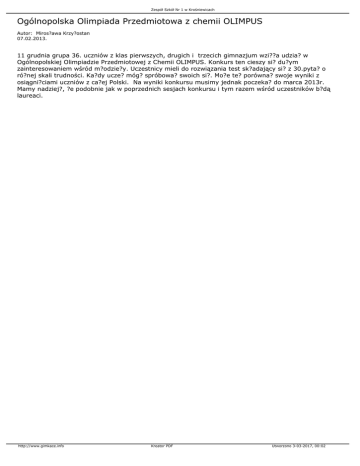 Zespół Szkół Nr 1 w Krośniewicach Ogólnopolska Olimpiada Przedmiotowa z chemii OLIMPUS Autor: Miros?awa Krzy?ostan 07.02.2013. 11 grudnia grupa 36. uczniów z klas pierwszych, drugich i trzecich gimnazjum wzi??a udzia? w Ogólnopolskiej Olimpiadzie Przedmiotowej z Chemii OLIMPUS. Konkurs ten cieszy si? du?ym zainteresowaniem wśród m?odzie?y. Uczestnicy mieli do rozwiązania test sk?adający si? z 30.pyta? o ró?nej skali trudności. Ka?dy ucze? móg? spróbowa? swoich si?. Mo?e te? porówna? swoje wyniki z osiągni?ciami uczniów z ca?ej Polski. Na wyniki konkursu musimy jednak poczeka? do marca 2013r. Mamy nadziej?, ?e podobnie jak w poprzednich sesjach konkursu i tym razem wśród uczestników b?dą laureaci. http://www.gimkace.info Kreator PDF Utworzono 3-03-2017, 00:02