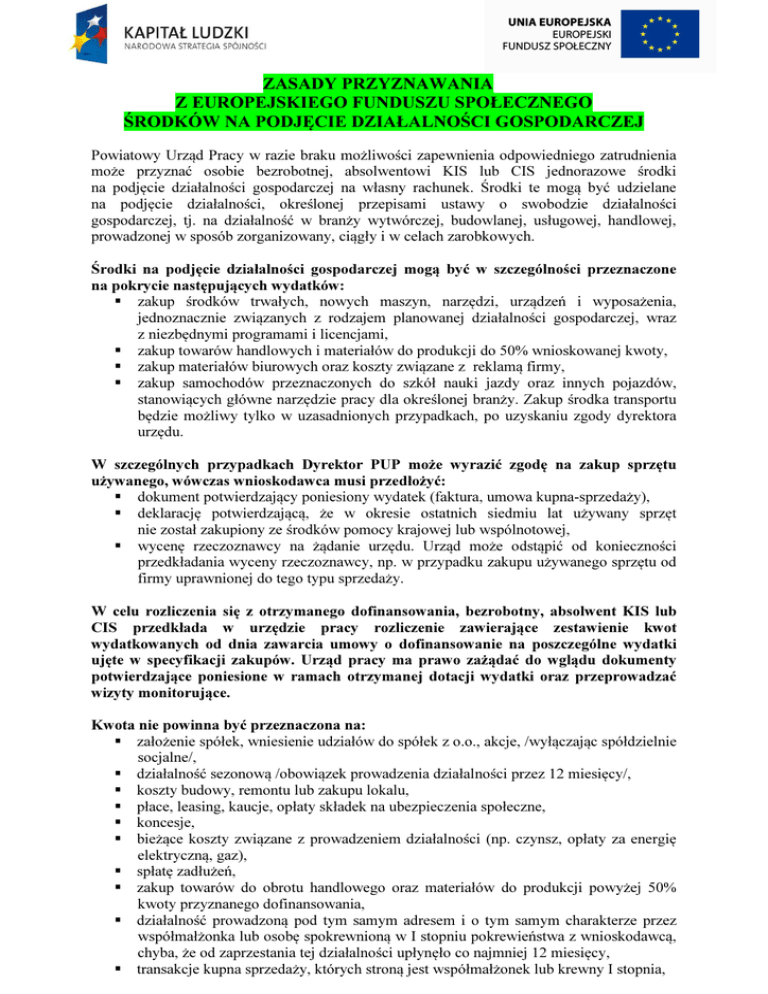 ZASADY PRZYZNAWANIA Z EUROPEJSKIEGO FUNDUSZU SPOŁECZNEGO ŚRODKÓW NA PODJĘCIE DZIAŁALNOŚCI GOSPODARCZEJ Powiatowy Urząd Pracy w razie braku możliwości zapewnienia odpowiedniego zatrudnienia może przyznać osobie bezrobotnej, absolwentowi KIS lub CIS jednorazowe środki na podjęcie działalności gospodarczej na własny rachunek. Środki te mogą być udzielane na podjęcie działalności, określonej przepisami ustawy o swobodzie działalności gospodarczej, tj. na działalność w branży wytwórczej, budowlanej, usługowej, handlowej, prowadzonej w sposób zorganizowany, ciągły i w celach zarobkowych. Środki na podjęcie działalności gospodarczej mogą być w szczególności przeznaczone na pokrycie następujących wydatków: zakup środków trwałych, nowych maszyn, narzędzi, urządzeń i wyposażenia, jednoznacznie związanych z rodzajem planowanej działalności gospodarczej, wraz z niezbędnymi programami i licencjami, zakup towarów handlowych i materiałów do produkcji do 50% wnioskowanej kwoty, zakup materiałów biurowych oraz koszty związane z reklamą firmy, zakup samochodów przeznaczonych do szkół nauki jazdy oraz innych pojazdów, stanowiących główne narzędzie pracy dla określonej branży. Zakup środka transportu będzie możliwy tylko w uzasadnionych przypadkach, po uzyskaniu zgody dyrektora urzędu. W szczególnych przypadkach Dyrektor PUP może wyrazić zgodę na zakup sprzętu używanego, wówczas wnioskodawca musi przedłożyć: dokument potwierdzający poniesiony wydatek (faktura, umowa kupna-sprzedaży), deklarację potwierdzającą, że w okresie ostatnich siedmiu lat używany sprzęt nie został zakupiony ze środków pomocy krajowej lub wspólnotowej, wycenę rzeczoznawcy na żądanie urzędu. Urząd może odstąpić od konieczności przedkładania wyceny rzeczoznawcy, np. w przypadku zakupu używanego sprzętu od firmy uprawnionej do tego typu sprzedaży. W celu rozliczenia się z otrzymanego dofinansowania, bezrobotny, absolwent KIS lub CIS przedkłada w urzędzie pracy rozliczenie zawierające zestawienie kwot wydatkowanych od dnia zawarcia umowy o dofinansowanie na poszczególne wydatki ujęte w specyfikacji zakupów. Urząd pracy ma prawo zażądać do wglądu dokumenty potwierdzające poniesione w ramach otrzymanej dotacji wydatki oraz przeprowadzać wizyty monitorujące. Kwota nie powinna być przeznaczona na: założenie spółek, wniesienie udziałów do spółek z o.o., akcje, /wyłączając spółdzielnie socjalne/, działalność sezonową /obowiązek prowadzenia działalności przez 12 miesięcy/, koszty budowy, remontu lub zakupu lokalu, płace, leasing, kaucje, opłaty składek na ubezpieczenia społeczne, koncesje, bieżące koszty związane z prowadzeniem działalności (np. czynsz, opłaty za energię elektryczną, gaz), spłatę zadłużeń, zakup towarów do obrotu handlowego oraz materiałów do produkcji powyżej 50% kwoty przyznanego dofinansowania, działalność prowadzoną pod tym samym adresem i o tym samym charakterze przez współmałżonka lub osobę spokrewnioną w I stopniu pokrewieństwa z wnioskodawcą, chyba, że od zaprzestania tej działalności upłynęło co najmniej 12 miesięcy, transakcje kupna sprzedaży, których stroną jest współmałżonek lub krewny I stopnia, działalność, której funkcjonowanie może mieć negatywny wpływ społeczny (np. sklepy monopolowe, sprzedaż używek), działalność w branży, w której występuje duże nasycenie lokalnego rynku, co rokuje małe szanse na przetrwanie firmy. działalność, której siedziba oraz miejsce wykonywania w przypadku punktu stacjonarnego znajdować się będą w obrębie przekraczającym 100km od powiatu nowodworskiego, z wyłączeniem województwa pomorskiego. Powyższa lista wyłączeń nie jest zamknięta. Dyrektor kierując się zasadą racjonalności wydatkowania środków publicznych, może uwzględnić inne kryteria, nie uwzględnione w powyższym katalogu. Bezrobotny, absolwent CIS lub KIS zamierzający podjąć działalność gospodarczą może złożyć do starosty właściwego ze względu na miejsce zamieszkania lub pobytu, albo ze względu na miejsce prowadzenia działalności wniosek o przyznanie ze środków EFS jednorazowo środków na jej podjęcie, w tym kosztów pomocy prawnej, konsultacji i doradztwa dotyczących tej działalności. Wniosek o przyznanie środków może być uwzględniony po spełnieniu przez bezrobotnego, absolwenta KIS lub CIS następujących warunków: w okresie 12 miesięcy bezpośrednio poprzedzających dzień złożenie wniosku: nie odmówił bez uzasadnionej przyczyny przyjęcia propozycji odpowiedniej pracy lub innej formy pomocy określonej w ustawie z dnia 20 kwietnia 2004r. o promocji zatrudnienia i instytucjach rynku pracy, zwanej dalej „ustawą” oraz udziału w działaniach w ramach Programu Aktywizacja i Integracja, o którym mowa w art. 62a ustawy, z własnej winy nie przerwał szkolenia, stażu, realizacji indywidualnego planu działania, udziału w działaniach w ramach Programu Aktywizacja i Integracja, o którym mowa w art. 62a ustawy, wykonywania prac społecznie użytecznych lub innej formy pomocy określonej w ustawie, po skierowaniu podjął szkolenie, przygotowanie zawodowe dorosłych, staż, prace społecznie użyteczne lub inną formę pomocy określoną w ustawie. nie otrzymał dotychczas bezzwrotnych środków Funduszu Pracy lub innych bezzwrotnych środków publicznych na podjęcie działalności gospodarczej lub rolniczej, założenie lub przystąpienie do spółdzielni socjalnej, zobowiązanie się do prowadzenia działalności przez okres 12 miesięcy od dnia jej rozpoczęcia oraz nieskładania w tym okresie wniosku o zawieszenie jej wykonywania, zobowiązanie do nie podejmowania zatrudnienia w okresie 12 miesięcy od dnia rozpoczęcia prowadzenia działalności gospodarczej, nie posiadanie wpisu do ewidencji działalności gospodarczej, a w przypadku jego posiadan