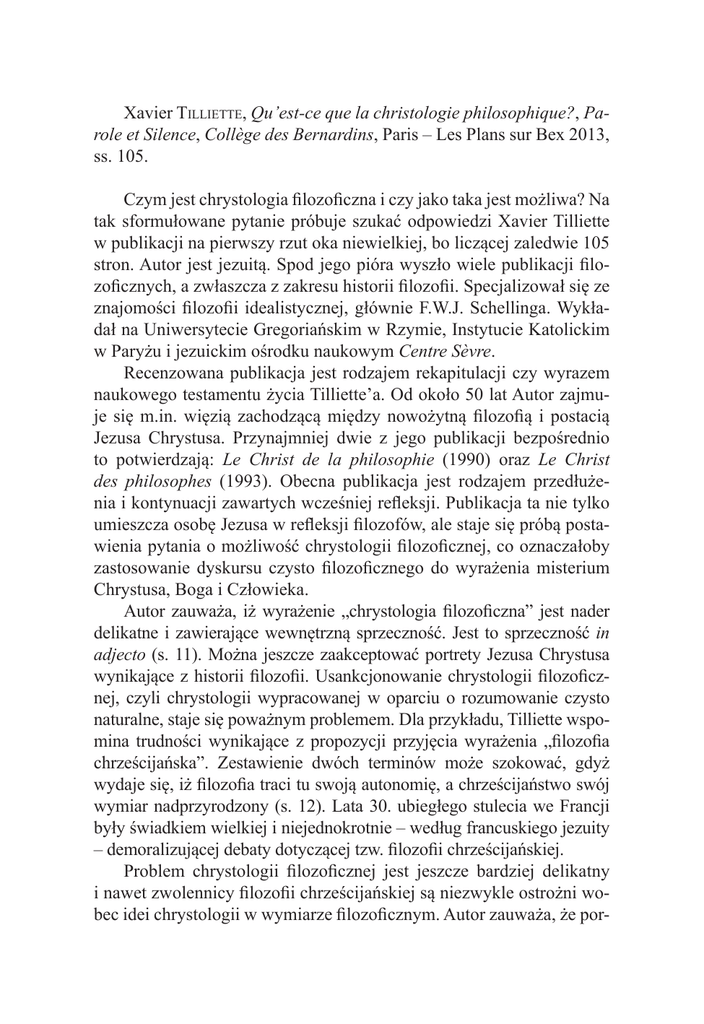 Xavier Tilliette, Qu’est-ce que la christologie philosophique?, Parole et Silence, Collège des Bernardins, Paris – Les Plans sur Bex 2013, ss. 105. Czym jest chrystologia filozoficzna i czy jako taka jest możliwa? Na tak sformułowane pytanie próbuje szukać odpowiedzi Xavier Tilliette w publikacji na pierwszy rzut oka niewielkiej, bo liczącej zaledwie 105 stron. Autor jest jezuitą. Spod jego pióra wyszło wiele publikacji filozoficznych, a zwłaszcza z zakresu historii filozofii. Specjalizował się ze znajomości filozofii idealistycznej, głównie F.W.J. Schellinga. Wykładał na Uniwersytecie Gregoriańskim w Rzymie, Instytucie Katolickim w Paryżu i jezuickim ośrodku naukowym Centre Sèvre. Recenzowana publikacja jest rodzajem rekapitulacji czy wyrazem naukowego testamentu życia Tilliette’a. Od około 50 lat Autor zajmuje się m.in. więzią zachodzącą między nowożytną filozofią i postacią Jezusa Chrystusa. Przynajmniej dwie z jego publikacji bezpośrednio to potwierdzają: Le Christ de la philosophie (1990) oraz Le Christ des philosophes (1993). Obecna publikacja jest rodzajem przedłużenia i kontynuacji zawartych wcześniej refleksji. Publikacja ta nie tylko umieszcza osobę Jezusa w refleksji filozofów, ale staje się próbą postawienia pytania o możliwość chrystologii filozoficznej, co oznaczałoby zastosowanie dyskursu czysto filozoficznego do wyrażenia misterium Chrystusa, Boga i Człowieka. Autor zauważa, iż wyrażenie „chrystologia filozoficzna” jest nader delikatne i zawierające wewnętrzną sprzeczność. Jest to sprzeczność in adjecto (s. 11). Można jeszcze zaakceptować portrety Jezusa Chrystusa wynikające z historii filozofii. Usankcjonowanie chrystologii filozoficznej, czyli chrystologii wypracowanej w oparciu o rozumowanie czysto naturalne, staje się poważnym problemem. Dla przykładu, Tilliette wspomina trudności wynikające z propozycji przyjęcia wyrażenia „filozofia chrześcijańska”. Zestawienie dwóch terminów może szokować, gdyż wydaje się, iż filozofia traci tu swoją autonomię, a chrześcijaństwo swój wymiar nadprzyrodzony (s. 12). Lata 30. ubiegłego stulecia we Francji były świadkiem wielkiej i niejednokrotnie – według francuskiego jezuity – demoralizującej debaty dotyczącej tzw. filozofii chrześcijańskiej. Problem chrystologii filozoficznej jest jeszcze bardziej delikatny i nawet zwolennicy filozofii chrześcijańskiej są niezwykle ostrożni wobec idei chrystologii w wymiarze filozoficznym. Autor zauważa, że por- 470 Veritati et Caritati trety filozoficzne Chrystusa, które ogólnie się akceptuje, są już wstępnymi chrystologiami filozoficznymi, są pewnego rodzaju pieczęciami filozoficznymi (l’estampille philosophique, s. 12). Może się również zdarzyć, że chrystologia filozoficzna przewyższy portret, tak jak w przypadku Kanta. Autor przypomina jednocześnie, iż nie ma filozofii w stanie czystym (à l’état pure, s. 12). Filozofie są zawsze nieodłączne od historii i przyjętych założeń. Chrystologia filozoficzna nie jest sformułowana jak dyscyplina naukowa, wystarczająco zaprogramowana. Jest ona zawarta w szkicach, esejach, próbach naukowych. Publikacja składa się z przedsłowia, dziesięciu różnej długości tekstów, podsumowania oraz indeksu nazwisk. Książka nie ma struktury rozdziałów, lecz wspomnianych dziesięć tekstów porusza kwestię bezpośrednio lub pośrednio związaną z zagadnieniem chrystologii filozoficznej. W przedsłowiu Autor wprowadził i uwrażliwił czytelnika na specyfikę wyrażenia chrystologia filozoficzna. Jednocześnie zaprezentował niektóre pryncypia, niezbędne w podejmowanej problematyce. Pierwszy tekst odpowiada na pytanie, czym jest chrystologia filozoficzna. Chrystologia filozoficzna jest wyrażeniem lub syntagmą, która przyjęła się od około 50 lat. Jeśli przyjmie się filozoficzną poprawność filozofii chrześcijańskiej, to otwiera to zarazem drogę do chrystologii filozoficznej. Pod wpływem Chrystusa filozofia staje się chrystologią, różną od chrystologii teologicznej i przygotowującej do niej. Chrystologia filozoficzna stoi wobec dwóch zagrożeń: od strony teologicznej tym zagrożeniem jest racjonalizm, natomiast od strony filozoficznej pojawia się niepokój alienacji jej wolności (s. 16) oraz pomieszanie porządków. Podobnie jak można mówić o filozofiach chrześcijańskich (w liczbie mnogiej), tak można również rozpatrywać chrystologie filozoficzne według ich autorów: Kanta, Fichtego, Hegla, Nietzschego, Bergsona, Teilharda de Chardin, Blondela itd. Każda z tych propozycji zastanawia się nad jednym z aspektów czy wymiarów, które zostały wyakcentowane. Autor zastanawia się, czy można używać terminu filozofia chrześcijańska czy też chrystologia filozoficzna bez jakiegokolwiek innego uzupełnienia. Następny tekst stawia kolejne pytanie dotyczące istnienia filozofii chrześcijańskiej. Autor wspomina tu głośną i sławną dyskusję z lat 30. ubiegłego stulecia, dotyczącą słuszności wyrażenia „filozofia chrześcijańska”. Wspomina tu wielkiego zwolennika filozofii chrześcijańskiej Recenzje i Sprawozdania 471 Etienne’a Gilsona. Swoją obronę takiego rozumienia filozofii poczynił z punktu widzenia historyka filozofii średniowiecznej, ukazując, jak chrześcijaństwo i teologia lub jeszcze szerzej – Objawienie judeo-chrześcijańskie – stało się dla filozofii źródłem inspiracji i ubogacenia. To właśnie w tej epoce pojawił się model ontoteologii, który zdominował sposób myślenia metafizycznego aż do Heideggera. Jacques Maritain z kolei rozumiał pojęcie filozofii chrześcijańskiej inaczej. Jego sposób myślenia cechuje się wielkim zaufaniem do rozumu i zgodnością czy komplementarnością wiary i rozumu. Według Maritaina filozofia chrześcijańska nie jest prawdziwą filozofią. Wejście chrześcijaństwa na obszar filozofii ją dezorie