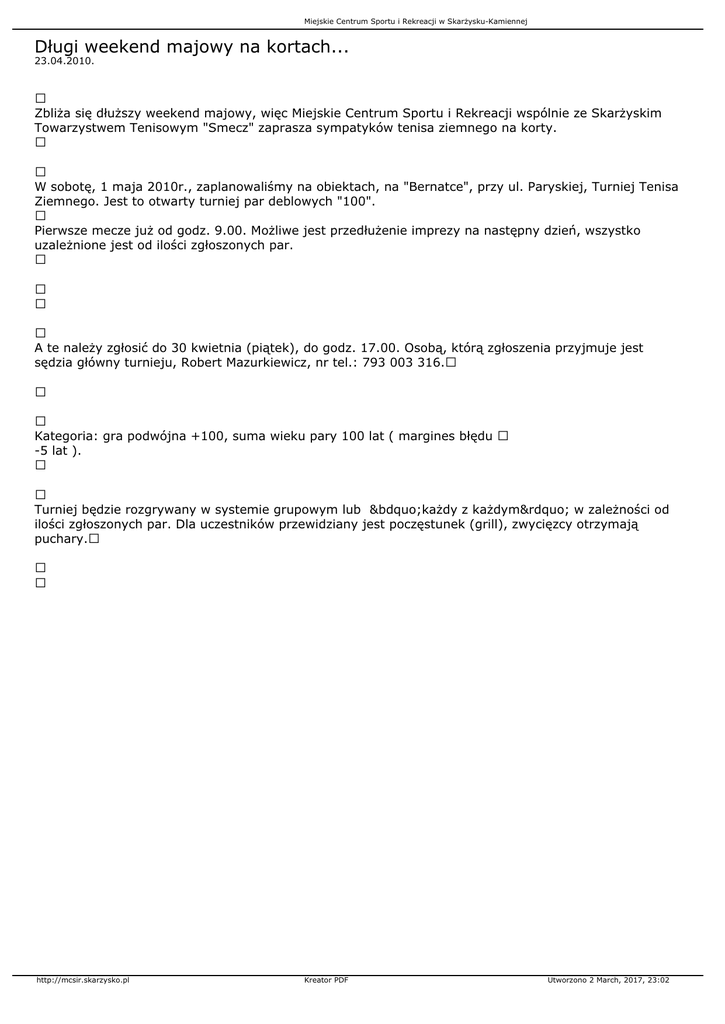 Miejskie Centrum Sportu i Rekreacji w Skarżysku-Kamiennej Długi weekend majowy na kortach... 23.04.2010. Zbliża się dłuższy weekend majowy, więc Miejskie Centrum Sportu i Rekreacji wspólnie ze Skarżyskim Towarzystwem Tenisowym "Smecz" zaprasza sympatyków tenisa ziemnego na korty. W sobotę, 1 maja 2010r., zaplanowaliśmy na obiektach, na "Bernatce", przy ul. Paryskiej, Turniej Tenisa Ziemnego. Jest to otwarty turniej par deblowych "100". Pierwsze mecze już od godz. 9.00. Możliwe jest przedłużenie imprezy na następny dzień, wszystko uzależnione jest od ilości zgłoszonych par. A te należy zgłosić do 30 kwietnia (piątek), do godz. 17.00. Osobą, którą zgłoszenia przyjmuje jest sędzia główny turnieju, Robert Mazurkiewicz, nr tel.: 793 003 316. Kategoria: gra podwójna +100, suma wieku pary 100 lat ( margines błędu -5 lat ). Turniej będzie rozgrywany w systemie grupowym lub „każdy z każdym” w zależności od ilości zgłoszonych par. Dla uczestników przewidziany jest poczęstunek (grill), zwycięzcy otrzymają puchary. http://mcsir.skarzysko.pl Kreator PDF Utworzono 2 March, 2017, 23:02