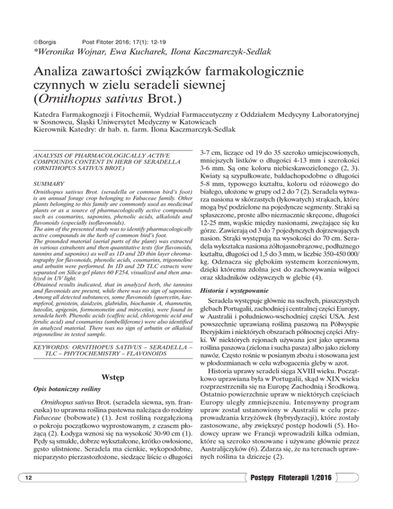 Borgis Post Fitoter 2016; 17(1): 12-19 *Weronika Wojnar, Ewa Kucharek, Ilona Kaczmarczyk-Sedlak Analiza zawartości związków farmakologicznie czynnych w zielu seradeli siewnej (Ornithopus sativus Brot.) Katedra Farmakognozji i Fitochemii, Wydział Farmaceutyczny z Oddziałem Medycyny Laboratoryjnej w Sosnowcu, Śląski Uniwersytet Medyczny w Katowicach Kierownik Katedry: dr hab. n. farm. Ilona Kaczmarczyk-Sedlak ANALYSIS OF PHARMACOLOGICALLY ACTIVE COMPOUNDS CONTENT IN HERB OF SERADELLA (ORNITHOPUS SATIVUS BROT.) SUMMARY Ornithopus sativus Brot. (seradella or common bird’s foot) is an annual forage crop belonging to Fabaceae family. Other plants belonging to this family are commonly used as medicinal plants or as a source of pharmacologically active compounds such as coumarins, saponins, phenolic acids, alkaloids and flavonoids (especially isoflavonoids). The aim of the presented study was to identify pharmacologically active compounds in the herb of common bird’s foot. The grounded material (aerial parts of the plant) was extracted in various extrahents and then quantitative tests (for flavonoids, tannins and saponins) as well as 1D and 2D thin layer chromatography for flavonoids, phenolic acids, coumarins, trigonneline and arbutin were performed. In 1D and 2D TLC extracts were separated on Silica-gel plates 60 F254, visualized and then analyzed in UV light. Obtained results indicated, that in analyzed herb, the tannins and flavonoids are present, while there was no sign of saponins. Among all detected substances, some flavonoids (quercetin, kaempferol, genistein, daidzein, glabridin, biochanin A, rhamnetin, luteolin, apigenin, formononetin and mirycetin), were found in seradela herb. Phenolic acids (caffeic acid, chlorogenic acid and ferulic acid) and coumarins (umbelliferone) were also identified in analyzed material. There was no sign of arbutin or alkaloid trigonneline in tested sample. KEYWORDS: ORNITHOPUS SATIVUS – SERADELLA – TLC – PHYTOCHEMISTRY – FLAVONOIDS Wstęp Opis botaniczny rośliny Ornithopus sativus Brot. (seradela siewna, syn. francuska) to uprawna roślina pastewna należąca do rodziny Fabaceae (bobowate) (1). Jest rośliną rozgałęzioną o pokroju początkowo wyprostowanym, z czasem płożącą (2). Łodyga wznosi się na wysokość 30-90 cm (1). Pędy są smukłe, dobrze wykształcone, krótko owłosione, gęsto ulistnione. Seradela ma cienkie, wykopodobne, nieparzysto pierzastozłożone, siedzące liście o długości 12 3-7 cm, liczące od 19 do 35 szeroko umiejscowionych, mniejszych listków o długości 4-13 mm i szerokości 3-6 mm. Są one koloru niebieskawozielonego (2, 3). Kwiaty są szypułkowate, baldachopodobne o długości 5-8 mm, typowego kształtu, koloru od różowego do białego, ułożone w grupy od 2 do 7 (2). Seradela wytwarza nasiona w skórzastych (łykowatych) strąkach, które mogą być podzielone na pojedyncze segmenty. Strąki są spłaszczone, proste albo nieznacznie skręcone, długości 12-25 mm, wąskie między nasionami, zwężające się ku górze. Zawierają od 3 do 7 pojedynczych dojrzewających nasion. Strąki występują na wysokości do 70 cm. Seradela wykształca nasiona żółtojasnobrązowe, podłużnego kształtu, długości od 1,5 do 3 mm, w liczbie 350-450 000/ kg. Odznacza się głębokim systemem korzeniowym, dzięki któremu zdolna jest do zachowywania wilgoci oraz składników odżywczych w glebie (4). Historia i występowanie Seradela występuje głównie na suchych, piaszczystych glebach Portugalii, zachodniej i centralnej części Europy, w Australii i południowo-wschodniej części USA. Jest powszechnie uprawianą rośliną paszową na Półwyspie Iberyjskim i niektórych obszarach północnej części Afryki. W niektórych rejonach używana jest jako uprawna roślina paszowa (zielona i sucha pasza) albo jako zielony nawóz. Często rośnie w posianym zbożu i stosowana jest w płodozmianach w celu wzbogacenia gleby w azot. Historia uprawy seradeli sięga XVIII wieku. Początkowo uprawiana była w Portugalii, skąd w XIX wieku rozprzestrzeniła się na Europę Zachodnią i Środkową. Ostatnio powierzchnie upraw w niektórych częściach Europy uległy zmniejszeniu. Intensywny program upraw został ustanowiony w Australii w celu przeprowadzania krzyżówek (hybrydyzacji), które zostały zastosowane, aby zwiększyć postęp hodowli (5). Hodowcy upraw we Francji wprowadzili kilka odmian, które są szeroko stosowane i używane głównie przez Australijczyków (6). Zdarza się, że na terenach uprawnych roślina ta dziczeje (2). Postępy Fitoterapii 1/2016 Analiza zawartości związków farmakologicznie czynnych w zielu seradeli siewnej (Ornithopus sativus Brot.) Cel pracy Wiele roślin z rodziny Fabaceae, ze względu na bogactwo metabolitów wtórnych, wykazujących działanie farmakologiczne, jest używanych w medycynie konwencjonalnej oraz ludowej. Spośród substancji aktywnych, występujących w surowcach należących do tej rodziny, można wyróżnić: śluzy, alkaloidy, kumaryny, saponiny steroidowe i triterpenowe oraz w dużej ilości flawonoidy. Związki biologicznie aktywne występują w różnych częściach roślin z rodziny bobowatych. Można je znaleźć zarówno w kwiatach (Trifolii flos), korzeniach (Glycyrrhizae radix), nasionach (Glycine semen, Cytisi semen), jak również zielu (Meliloti herba, Trifolii herba, Genistae herba). Seradela siewna (Ornithopus sativus), należąca do rodziny Fabaceae, jest rośliną uprawną o zastosowaniu paszowym, dlatego można przypuszczać, że nie zawiera ona związków szkodliwych lub trujących dla organizmów zwierzęcych. Ze względu na fakt, że wiele roślin – przedstawicieli rodziny bobowatych jest stosowanych w lecznictwie, można sądzić, że seradela również może zawierać metabolity wtórne o znaczeniu farmakologicznym. Celem niniejszej pracy było opracowanie i zoptymalizowanie procesów izolacji substancji aktywnych z ziela Ornith