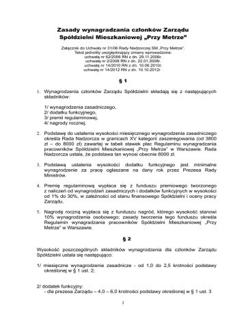 Zasady wynagradzania członków Zarządu Spółdzielni Mieszkaniowej „Przy Metrze” Załącznik do Uchwały nr 31/06 Rady Nadzorczej SM „Przy Metrze”. Tekst jednolity uwzględniający zmiany wprowadzone: uchwałą nr 62/2006 RN z dn. 29.11.2006r. uchwałą nr 2/2008 RN z dn. 22.01.2008r. uchwałą nr 14/2010 RN z dn. 10.06.2010r. uchwałą nr 14/2012 RN z dn. 10.10.2012r §1 1. Wynagrodzenia członków Zarządu Spółdzielni składają się z następujących składników: 1/ wynagrodzenia zasadniczego, 2/ dodatku funkcyjnego, 3/ premii regulaminowej, 4/ nagrody rocznej. 2. Podstawę do ustalenia wysokości miesięcznego wynagrodzenia zasadniczego określa Rada Nadzorcza w granicach XV kategorii zaszeregowania (od 3800 zł – do 8000 zł) zawartej w tabeli stawek płac Regulaminu wynagradzania pracowników Spółdzielni Mieszkaniowej „Przy Metrze” w Warszawie. Rada Nadzorcza ustala, że podstawa tan wynosi obecnie 6000 zł. 3. Podstawą ustalenia wysokości dodatku funkcyjnego jest minimalne wynagrodzenie za pracę ogłaszane na dany rok przez Prezesa Rady Ministrów. 4. Premię regulaminową wypłaca się z funduszu premiowego tworzonego z naliczeń od wynagrodzeń zasadniczych i dodatków funkcyjnych w wysokości od 1% do 30%, w zależności od stanu finansowego Spółdzielni i oceny pracy Zarządu. 5. Nagrodę roczną wypłaca się z funduszu nagród, którego wysokość stanowi 10% wynagrodzenia osobowego; zasady tworzenia tego funduszu określa Regulamin wynagradzania pracowników Spółdzielni Mieszkaniowej „Przy Metrze” w Warszawie. §2 Wysokość poszczególnych składników wynagrodzenia dla członków Zarządu Spółdzielni ustala się następująco: 1/ miesięczne wynagrodzenie zasadnicze - od 1,0 do 2,5 krotności podstawy określonej w § 1 ust. 2; 2/ dodatek funkcyjny: - dla prezesa Zarządu – 4,0 – 6,0 krotności podstawy określonej w § 1 ust. 3 1 - dla zastępców prezesa Zarządu - 2,5 – 4,0 krotności podstawy określonej w § 1 ust. 3, 3/ premia regulaminowa – w zależności od sytuacji finansowej Spółdzielni – na wniosek Prezydium Rady Nadzorczej, w oparciu o informację Prezesa Zarządu, 4/ nagroda roczna – jako procent funduszu nagród, określonego w § 1 ust. 5, w wysokości ustalonej przez Radę Nadzorczą. §3 1. Członkowi Zarządu, któremu powierzono wykonywanie czynności nieobjętych zakresem obowiązków przysługuje premia kwotowa, pod warunkiem, że nie otrzymał z tego tytułu wynagrodzenia. 2. Premia kwotowa może być przyznawana okresowo. Decyzję o przyznaniu premii podejmuje Rada Nadzorcza, a o uruchomieniu jej wypłaty Prezydium Rady. §4 1. Rada Nadzorcza może przyznać członkom Zarządu nagrodę specjalną. 2. Wysokość i termin przyznawania tej nagrody określa Rada Nadzorcza, indywidualnie dla każdego członka Zarządu. §5 1. Wysokość wynagrodzenia zasadniczego oraz dodatku funkcyjnego dla członka Zarządu określa Rada Nadzorcza, według zasad wskazanych w § 2, przy powoływaniu go na tę funkcję. 2. Przeszeregowań, polegających na przyznaniu wyższej kwoty wynagrodzenia zasadniczego dokonuje Rada Nadzorcza. §6 1. Premie regulaminowe przyznaje kwartalnie Rada Nadzorcza na wniosek Prezydium Rady Nadzorczej w wysokości opartej o informację Prezesa Zarządu i Prezydium Rady Nadzorczej o sytuacji finansowej Spółdzielni i udziale członków Zarządu w realizacji zadań wynikających z zakresu obowiązków oraz zadań zleconych przez Radę Nadzorczą. 2. Wypłata premii powinna nastąpić do 15. dnia miesiąca następującego po upływie danego kwartału. §7 1. Nagrodę roczną, o której mowa w § 2 pkt 4, przyznaje Rada Nadzorcza po dokonaniu pozytywnej oceny pracy członka Zarządu. 2 2. Nagroda roczna jest wypłacana do 31 marca za rok ubiegły. §8 1. Inne świadczenia pieniężne wynikające ze stosunku pracy, a mianowicie: a/ odprawy pieniężne w związku z przejściem na emeryturę lub rentę inwalidzką; b/ odprawa pośmiertna; c/ świadczenia z funduszu socjalnego; d/ nagroda jubileuszowa. Przysługują członkom Zarządu według zasad określonych w Regulaminie wynagradzania pracowników Spółdzielni Mieszkaniowej „Przy Metrze” w Warszawie. 2. Świadczenia pieniężne o charakterze obligatoryjnym wynikające ze stosunku pracy, a niewymienione w ust. 1 obowiązują na zasadach określonych w odrębnych przepisach. §9 1. Wynagrodzenie członków Zarządu niepozostających ze Spółdzielnią w stosunku pracy ustala się odpowiednio z wykorzystaniem zasad określonych w § 2. 2. Wynagrodzenia uznaniowe przyznaje Rada Nadzorcza, na zasadach określonych w niniejszych Zasadach. Wynagrodzenie to wypłaca się na podstawie aneksu do wiążącej Strony umowy. 3