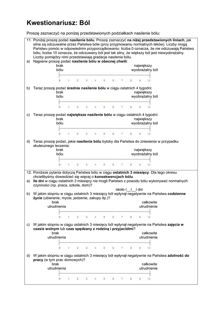 Kwestionariusz: Ból Proszę zaznaczyć na poniżej przedstawionych podziałkach nasilenie bólu: 11. Poniżej proszę podać nasilenie bólu. Proszę zaznaczyć na niżej przedstawionych liniach, jak silne są odczuwalne przez Państwa bóle (przy przyjmowaniu normalnych leków). Liczby mogą Państwu pomóc w odpowiednim przyporządkowaniu: liczba 0 oznacza, że nie odczuwają Państwo bólu, liczba 10 oznacza, że odczuwany ból jest tak silny, że większy ból jest niewyobrażalny. Liczby pomiędzy nimi przedstawiają gradacje nasilenia bólu. a) Najpierw proszę podać nasilenie bólu w obecnej chwili: brak największy bólu wyobrażalny ból b) Teraz proszę podać średnie nasilenie bólu w ciągu ostatnich 4 tygodni: brak największy bólu wyobrażalny ból c) Teraz proszę podać największe nasilenie bólu w ciągu ostatnich 4 tygodni: brak największy bólu wyobrażalny ból d) Teraz proszę podać, jakie nasilenie bólu byłoby dla Państwa do zniesienia w przypadku skutecznego leczenia: brak największy bólu wyobrażalny ból 12. Poniższe pytania dotyczą Państwa bólu w ciągu ostatnich 3 miesięcy. Dla tego okresu chcielibyśmy dowiedzieć się więcej o konsekwencjach bólu. a) Ile dni w ciągu ostatnich 3 miesięcy nie mogli Państwo z powodu bólu wykonywać normalnych czynności (np. praca, szkoła, dom)? około I__I__I dni b) W jakim stopniu w ciągu ostatnich 3 miesięcy ból wpłynął negatywnie na Państwa codzienne życie (ubieranie, mycie, jedzenie, zakupy itp.)? brak całkowite utrudnienia utrudnienie c) W jakim stopniu w ciągu ostatnich 3 miesięcy ból wpłynął negatywnie na Państwa zajęcia w czasie wolnym lub czas spędzany z rodziną i przyjaciółmi? brak całkowite utrudnienia utrudnienie d) W jakim stopniu w ciągu ostatnich 3 miesięcy ból wpłynął negatywnie na Państwa zdolność do pracy (w tym prac domowych)? brak całkowite utrudnienia utrudnienie