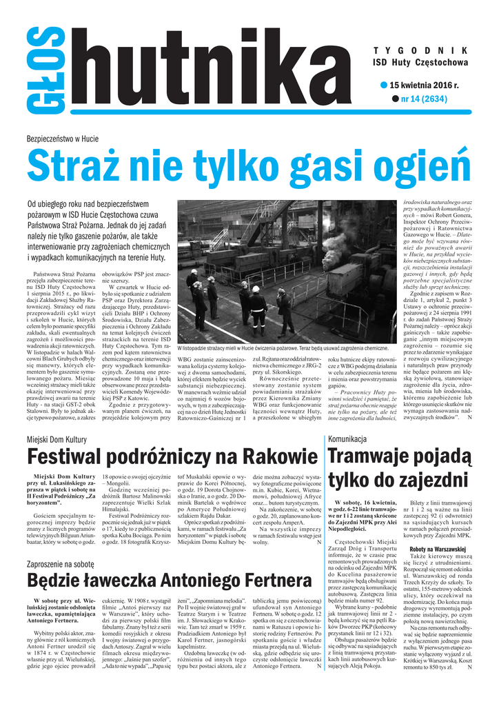 t y g o d n i k ISD Huty Częstochowa l 15 kwietnia 2016 r. l nr 14 (2634) Bezpieczeństwo w Hucie Straż nie tylko gasi ogień Od ubiegłego roku nad bezpieczeństwem pożarowym w ISD Hucie Częstochowa czuwa Państwowa Straż Pożarna. Jednak do jej zadań należy nie tylko gaszenie pożarów, ale także interweniowanie przy zagrożeniach chemicznych i wypadkach komunikacyjnych na terenie Huty. Państwowa Straż Pożarna przejęła zabezpieczenie terenu ISD Huty Częstochowa 1 sierpnia 2015 r., po likwidacji Zakładowej Służby Ratowniczej. Strażacy od razu przeprowadzili cykl wizyt i szkoleń w Hucie, których celem było poznanie specyfiki zakładu, skali ewentualnych zagrożeń i możliwości prowadzenia akcji ratowniczych. W listopadzie w halach Walcowni Blach Grubych odbyły się manewry, których elementem było gaszenie symulowanego pożaru. Miesiąc wcześniej strażacy mieli także okazję interweniować przy prawdziwej awarii na terenie Huty - na stacji GST-2 obok Stalowni. Były to jednak akcje typowo pożarowe, a zakres obowiązków PSP jest znacznie szerszy. W czwartek w Hucie odbyło się spotkanie z udziałem PSP oraz Dyrektora Zarządzającego Huty, przedstawicieli Działu BHP i Ochrony Środowiska, Działu Zabezpieczenia i Ochrony Zakładu na temat kolejnych ćwiczeń strażackich na terenie ISD Huty Częstochowa. Tym razem pod kątem ratownictwa chemicznego oraz interwencji przy wypadkach komunikacyjnych. Zostaną one przeprowadzone 10 maja i będą obserwowane przez przedstawicieli Komendy Wojewódzkiej PSP z Katowic. Zgodnie z przygotowywanym planem ćwiczeń, na przejeździe kolejowym przy W listopadzie strażacy mieli w Hucie ćwiczenia pożarowe. Teraz będą usuwać zagrożenia chemiczne. WBG zostanie zainscenizowana kolizja cysterny kolejowej z dwoma samochodami, której efektem będzie wyciek substancji niebezpiecznej. W manewrach weźmie udział co najmniej 6 wozów bojowych, w tym z zabezpieczającej na co dzień Hutę Jednostki Ratowniczo-Gaśniczej nr 1 z ul. Rejtana oraz oddział ratownictwa chemicznego z JRG-2 przy ul. Sikorskiego. Równocześnie przetestowany zostanie system powiadamiania strażaków przez Kierownika Zmiany WBG oraz funkcjonowanie łączności wewnątrz Huty, a przeszkolone w ubiegłym roku hutnicze ekipy ratownicze z WBG podejmą działania w celu zabezpieczenia terenu i mienia oraz powstrzymania gapiów. – Pracownicy Huty powinni wiedzieć i pamiętać, że straż pożarna obecnie reaguje nie tylko na pożary, ale też inne zagrożenia dla ludności, środowiska naturalnego oraz przy wypadkach komunikacyjnych – mówi Robert Gonera, Inspektor Ochrony Przeciwpożarowej i Ratownictwa Gazowego w Hucie. – Dlatego może być wzywana również do poważnych awarii w Hucie, na przykład wycieków niebezpiecznych substancji, rozszczelnienia instalacji gazowej i innych, gdy będą potrzebne specjalistyczne służby lub sprzęt techniczny. Zgodnie z zapisem w Rozdziale 1, artykuł 2, punkt 3 Ustawy o ochronie przeciwpożarowej z 24 sierpnia 1991 r. do zadań Państwoej Straży Pożarnej należy – oprócz akcji gaśniczych – także zapobieganie „innym miejscowym zagrożeniu – rozumie się przez to zdarzenie wynikające z rozwoju cywilizacyjnego i naturalnych praw przyrody nie będące pożarem ani klęską żywiołową, stanowiące zagrożenie dla życia, zdrowia, mienia lub środowiska, któremu zapobieżenie lub którego usunięcie skutków nie wymaga zastosowania nadzwyczajnych środków”. N Komunikacja Miejski Dom Kultury Festiwal podróżniczy na Rakowie Tramwaje pojadą Miejski Dom Kultury przy ul. Łukasińskiego zaprasza w piątek i sobotę na II Festiwal Podróżniczy „Za horyzontem”. Gościem specjalnym tegorocznej imprezy będzie znany z licznych programów telewizyjnych Bilguun Ariunbaatar, który w sobotę o godz. 18 opowie o swojej ojczyźnie – Mongolii. Godzinę wcześniej podróżnik Bartosz Malinowski zaprezentuje Wielki Szlak Himalajski. Festiwal Podróżniczy rozpocznie się jednak już w piątek o 17, kiedy to z publicznością spotka Kuba Bociąga. Po nim o godz. 18 fotografik Krzysz- tof Muskalski opowie o wyprawie do Korei Północnej, o godz. 19 Dorota Chojnowska o Iranie, a o godz. 20 Dominik Bartelak o wędrówce po Ameryce Południowej szlakiem Rajdu Dakar. Oprócz spotkań z podróżnikami, w ramach festiwalu „Za horyzontem” w piątek i sobotę Miejskim Domu Kultury bę- dzie można zobaczyć wystawy fotograficzne poświęcone m.in. Kubie, Korei, Wietnamowi, południowej Afryce oraz... butom turystycznym. Na zakończenie, w sobotę o godz. 20, zaplanowano koncert zespołu AmperA. Na wszystkie imprezy w ramach festiwalu wstęp jest wolny. N Zaproszenie na sobotę Będzie ławeczka Antoniego Fertnera W sobotę przy ul. Wieluńskiej zostanie odsłonięta ławeczka, upamiętniająca Antoniego Fertnera. Wybitny polski aktor, znany głównie z ról komicznych Antoni Fertner urodził się w 1874 r. w Częstochowie własnie przy ul. Wieluńskiej, gdzie jego ojciec prowadził cukiernię. W 1908 r. wystąpił filmie „Antoś pierwszy raz w Warszawie”, który uchodzi za pierwszy polski film fabularny. Znany był też z serii komedii rosyjskich z okresu I wojny światowej o przygodach Antoszy. Zagrał w wielu filmach okresu międzywojennego: „Jaśnie pan szofer”, „Ada to nie wypada”, „Papa się żeni”, „Zapomniana melodia”. Po II wojnie światowej grał w Teatrze Starym i w Teatrze im. J. Słowackiego w Krakowie. Tam też zmarł w 1959 r. Pradziadkiem Antoniego był Karol Fertner, jasnogórski kapelmistrz. Ozdobną ławeczkę (w odróżnieniu od innych tego typu bez postaci aktora, ale z tabliczką jemu poświeconą) ufundował syn Antoniego Fertnera. W sobotę o godz. 12 spotka on się z czestochowianami w Ratuszu i opowie historię rodziny Fertnerów. Po spotkaniu goście i władze miasta przejdą na ul. Wieluńską, gdzie odbędzie się uroczyste odsłonięcie ławeczki Antoniego F