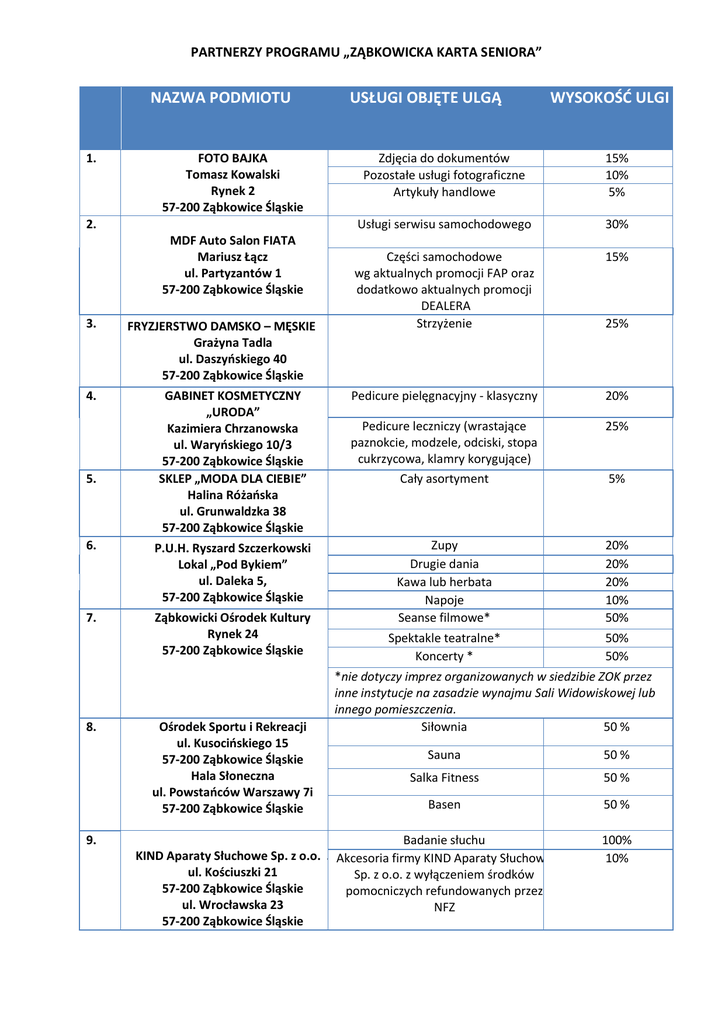 PARTNERZY PROGRAMU „ZĄBKOWICKA KARTA SENIORA” NAZWA PODMIOTU 1. FOTO BAJKA Tomasz Kowalski Rynek 2 57-200 Ząbkowice Śląskie 2. MDF Auto Salon FIATA Mariusz Łącz ul. Partyzantów 1 57-200 Ząbkowice Śląskie 3. 4. 5. FRYZJERSTWO DAMSKO – MĘSKIE Grażyna Tadla ul. Daszyńskiego 40 57-200 Ząbkowice Śląskie GABINET KOSMETYCZNY „URODA” Kazimiera Chrzanowska ul. Waryńskiego 10/3 57-200 Ząbkowice Śląskie SKLEP „MODA DLA CIEBIE” Halina Różańska ul. Grunwaldzka 38 57-200 Ząbkowice Śląskie 6. P.U.H. Ryszard Szczerkowski Lokal „Pod Bykiem” ul. Daleka 5, 57-200 Ząbkowice Śląskie 7. Ząbkowicki Ośrodek Kultury Rynek 24 57-200 Ząbkowice Śląskie 8. 9. Ośrodek Sportu i Rekreacji ul. Kusocińskiego 15 57-200 Ząbkowice Śląskie Hala Słoneczna ul. Powstańców Warszawy 7i 57-200 Ząbkowice Śląskie USŁUGI OBJĘTE ULGĄ WYSOKOŚĆ ULGI Zdjęcia do dokumentów Pozostałe usługi fotograficzne Artykuły handlowe 15% 10% 5% Usługi serwisu samochodowego 30% Części samochodowe wg aktualnych promocji FAP oraz dodatkowo aktualnych promocji DEALERA Strzyżenie 15% Pedicure pielęgnacyjny - klasyczny 20% Pedicure leczniczy (wrastające paznokcie, modzele, odciski, stopa cukrzycowa, klamry korygujące) Cały asortyment 25% Zupy Drugie dania Kawa lub herbata Napoje Seanse filmowe* 20% 20% 20% 10% 50% Spektakle teatralne* Koncerty * 50% 50% 25% 5% *nie dotyczy imprez organizowanych w siedzibie ZOK przez inne instytucje na zasadzie wynajmu Sali Widowiskowej lub innego pomieszczenia. Siłownia 50 % Sauna 50 % Salka Fitness 50 % Basen 50 % Badanie słuchu KIND Aparaty Słuchowe Sp. z o.o. . Akcesoria firmy KIND Aparaty Słuchowe ul. Kościuszki 21 Sp. z o.o. z wyłączeniem środków 57-200 Ząbkowice Śląskie pomocniczych refundowanych przez ul. Wrocławska 23 NFZ 57-200 Ząbkowice Śląskie 100% 10% PARTNERZY PROGRAMU „ZĄBKOWICKA KARTA SENIORA” 10. KANCELARIA RADCY PRAWNEGO Agnieszka Jurek ul. Spokojna 6 57-200 Ząbkowice Śląskie Porada prawna 50% Pismo procesowe 20%