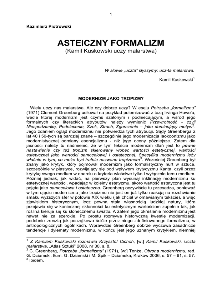 1 Kazimierz Piotrowski ASTEICZNY FORMALIZM (Kamil Kuskowski uczy malarstwa) W słowie „uczta” słyszymy: ucz-ta malarstwa. Kamil Kuskowski 1 MODERNIZM JAKO TROPIZM? Wielu uczy nas malarstwa. Ale czy dobrze uczy? W eseju Potrzeba „formalizmu” (1971) Clement Greenberg usiłował na przykład polemizować z tezą Irvinga Howe’a, wedle której modernizm jest czymś szalonym i podniecającym, a wśród jego formalnych czy literackich atrybutów należy wymienić Przewrotność - czyli Niespodziankę, Podniecenie, Szok, Strach, Zgorszenie – jako dominujący motyw 2 . Jego zdaniem ogląd modernizmu nie potwierdza tych atrybucji. Sądy Greenberga z lat 40 i 50-tych są bardziej znane – szczególnie jego modernizacja laokoonizmu jako modernistycznej odmiany esencjalizmu - niż jego oceny późniejsze. Zatem dla jasności należy tu nadmienić, że w tym tekście modernizm dlań jest to pewne nastawienie czy też tropizm skierowany wobec wartości estetycznej, wartości estetycznej jako wartości samocelowej i ostatecznej. Specyfika modernizmu leży właśnie w tym, co może być trafnie nazwane tropizmem 3 . Wcześniej Greenberg był znany jako krytyk, który pojmował modernizm jako formalistyczny nurt w sztuce, szczególnie w plastyce, rozwijający się pod wpływem krytycyzmu Kanta, czyli przez krytykę swego medium w oparciu o kryteria właściwe tylko i wyłącznie temu medium. Później jednak, jak widać, na pierwszy plan wysunął inklinację modernizmu ku estetycznej wartości, wpadając w koleiny estetyzmu, skoro wartość estetyczna jest tu pojęta jako samocelowa i ostateczna. Greenberg oczywiście tu przesadza, ponieważ w tym ujęciu modernizmu jako tropizmu nie jest on już tylko reakcją na rozchwianie smaku wyższych sfer w połowie XIX wieku (jak chciał w omawianym tekście), a więc zjawiskiem historycznym, lecz pewną stała własnością ludzkiej natury, która przejawia się w koniecznej skłonności ku estetycznym wartościom zupełnie tak, jak roślina kieruje się ku słonecznemu światłu. A zatem jego określenie modernizmu jest nawet nie za szerokie. Po prostu rozmywa historyczną kwestię modernizacji, podobnie zresztą jak początkowo ściśle przez niego zdefiniowanego formalizmu, w antropologicznych ogólnikach. Wprawdzie Greenberg dobrze wyczuwa zasadnicze tendencje i dylematy modernizmu, w końcu jest jego uznanym krytykiem, niemniej 1 Z Kamilem Kuskowski rozmawia Krzysztof Cichoń, [w:] Kamil Kuskowski. Uczta malarstwa, „Atlas Sztuki” 2008, nr 30, s. 8. 2 C. Greenberg, Potrzeba „formalizmu” (1971), [w:] Tenże, Obrona modernizmu, red. G. Dziamski, tłum. G. Dziamski i M. Śpik – Dziamska, Kraków 2006, s. 57 – 61, s. 57. 3 Ibidem. 2 antologia jego tekstów, którą ostatnio przygotował Grzegorz Dziamski, pokazuje, że mamy do czynienia nie tylko z pewną jednostronną wizją modernizmu jako specyficznego formalizmu, lecz ponadto z koncepcją uwieńczoną swoistym reakcjonizmem Greenberga jako estety. SAMO-ZASKAKIWANIE SIEBIE (asteiczny formalizm) Inspirując się krytycznie poglądami Greenberga, proponuję tu pewne ujęcie formalizmu, które – obce amerykańskiemu krytykowi – dziś wydaje się wiodące. Ciekawą grę z formalizmem można było obserwować na wystawie Jarosława Lubiaka Siła formalizmu w Muzeum Sztuki w Łodzi, chociaż nie wyrażono tam explicite tego, o co tu chodzi. A jako egzemplifikację tej tendencji – zwanej przeze mnie jako asteiczny formalizm - niech posłuży sztuka Kamila Kuskowskiego. Ten obsypywany nagrodami malarz – którego twórczość doczekała się wielu interesujących interpretacji czołowych naszych krytyków - również jest przywiązany do wartości estetycznych. To jest jego i zaleta, i słabość – jak kto woli. Wielekroć wyrażał opinię, że ceni wizualną perfekcję, zarówno w dziełach, w katalogach, jak i w aranżacjach wystaw, czym mnie nieco – nie ukrywam - irytował. W tym sensie podlega on - jak my wszyscy - wspomnianemu przez Greenberga tropizmowi. Jego obrazy są formalnie perfekcyjne, czyste, oszczędne, często geometryczne lub wykorzystujące gotowe motywy starych mistrzów. Kuskowski jest mocno przywiązany do formalistycznej tradycji sztuki nowożytnej, do métier, jak też do modernizmu, ale tę ostatnią tradycję szerzej, wszechstronniej pojmuje. Wiele zawdzięcza nie tylko polskiej awangardzie i formacji artystycznej, jaką uzyskał w Akademii Sztuki Pięknych w Łodzi, gdzie jest adiunktem. Podziwia malarzy amerykańskich, preferujących redukcyjne podejście do malarstwa, a zarazem potrafi inspirować się na przykład ekspresjonistycznym Grünewaldem lub flamandzkimi mistrzami martwych natur. Piękno w sztuce dawnej i modernistycznej bezwzględnie go urzeka, pociąga i hipnotyzuje. Lecz na tym tropiczne ograniczenia kończą się, bowiem w twórczości Kuskowskiego widzimy ogromną świadoma pracę, by dalej przełamywać wszelkie zastane rozumienia formalizmu, które dogmatycznie narzuciły nam opcje Greenberga, Strzemińskiego czy wcześniej Lessinga. Chodzi też o to, by nie poddać się bezwolnie tropizmowi, o jakim pisze Greenberg. Formalizm bowiem zostałby tu w końcu opacznie pojęty - wyłącznie jako swoista higiena myślenia i tworzenia, na co dziś nie możemy zgodzić się bez zastrzeżeń, gdyż prowadzi to do stagnacji i uwiądu akademickiego kształcenia. Kuskowski jako twórca, ale i pedagog, doskonale wie, czym grozi taki dogmatyczny formalizm: Szanuję warsztatowców, którzy zmagają się z materią i technika, ale zaczyna mi przeszkadzać, jeśli ktoś przedkłada coś nad coś 4 . Postawę tę należy docenić i uznać za pragmatyczną i dziś wręcz za ratunkową dla tradycji formalizmu. Kuskowski całym swym dotychczasowym dorobkiem usiłuje przeciwstawiać się tej wątpliwej higienie, postulując postawę samo-zaskakiwania siebie wbrew tej formalistycznej dyscyplinie. 4 Z Kamilem Kuskowski rozmawia Krzysztof Cichoń, op. cit., s