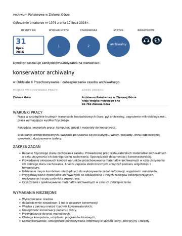 Archiwum Państwowe w Zielonej Górze Ogłoszenie o naborze nr 1376 z dnia 12 lipca 2016 r. OFERTY DO WYMIAR ETATU STANOWISKA 1 2 31 lipca 2016 STATUS DODATKOWE archiwalny Dyrektor poszukuje kandydatów\kandydatek na stanowisko: konserwator archiwalny w Oddziale II Przechowywania i zabezpieczania zasobu archiwalnego MIEJSCE WYKONYWANIA PRACY: ADRES URZĘDU: Zielona Góra Archiwum Państwowe w Zielonej Górze Aleja Wojska Polskiego 67a 65-762 Zielona Góra WARUNKI PRACY Praca w szczególnie trudnych warunkach środowiskowych (kurz, pył archiwalny, zagrożenie mikrobiologiczne), praca wymagająca wysiłku fizycznego. Narzędzia i materiały pracy: komputer, sprzęt i materiały do konserwacji. Brak barier architektonicznych: swoboda poruszania się po budynku, windy, podjazdy, drzwi odpowiedniej szerokości, dostosowane toalety. ZAKRES ZADAŃ Badanie fizycznego stanu zachowania zasobu. Prowadzenie prac restauratorskich materiałów archiwalnych w celu utrzymania ich dobrego stanu zachowania. Sporządzanie dokumentacji konserwatorskiej. Prowadzenie okresowych kontroli warunków przechowywania materiałów archiwalnych w celu utrzymania ich dobrego stanu zachowania. Analiza zapisów elektronicznych urządzeń pomiaru wilgotności i temperatury. Udzielanie innym komórkom niezbędnych do wykonywania zadań informacji, wyjaśnień i materiałów. Przygotowywanie materiałów archiwalnych do odkwaszania i innych zabiegów zabezpieczających, realizowanych przez podmioty zewnętrzne. Czyszczenie i opakowywanie materiałów archiwalnych w celu ich zabezpieczenia. WYMAGANIA NIEZBĘDNE Wykształcenie: średnie doświadczenie zawodowe: 1 rok w obszarze konserwacji Wiedza z zakresu metod i technik konserwatorskich, Umiejętność konserwacji papieru i skóry, Predyspozycje do prac manualnych, Obsługa komputera, urządzeń i programów biurowych, Komunikatywność, umiejętność przekazywania informacji w sposób jasny, precyzyjny i zwięzły. Umiejętność pracy w zespole. Posiadanie obywatelstwa polskiego albo obywatelstwa innego państwa Unii Europejskiej albo obywatelstwa innego państwa, którego obywatele na podstawie umów międzynarodowych lub przepisów prawa wspólnotowego posiadają prawo podjęcia zatrudnienia na terytorium Rzeczypospolitej Polskiej Korzystanie z pełni praw publicznych Nieskazanie prawomocnym wyrokiem za umyślne przestępstwo lub umyślne przestępstwo skarbowe WYMAGANIA DODATKOWE Wykształcenie: wyższe o specjalności konserwacja papieru i skóry doświadczenie zawodowe: w przypadku wykształcenia wyższego o specjalności konserwacja papieru i skóry doświadczenie zawodowe nie jest wymagane obsługa wewnętrznych baz danych DOKUMENTY I OŚWIADCZENIA NIEZBĘDNE Życiorys/CV i list motywacyjny Kopie dokumentów potwierdzających spełnienie wymagania niezbędnego w zakresie wykształcenia Kopie dokumentów potwierdzających spełnienie wymagania niezbędnego w zakresie doświadczenia zawodowego / stażu pracy Oświadczenie o posiadanym obywatelstwie albo kopia dokumentu potwierdzającego posiadane obywatelstwo W przypadku osób nieposiadających obywatelstwa polskiego - kopia dokumentu potwierdzającego znajomość języka polskiego zgodnie z rozporządzeniem Prezesa Rady Ministrów w sprawie określenia rodzajów dokumentów potwierdzających znajomość języka polskiego przez osoby nieposiadające obywatelstwa polskiego, ubiegające się o zatrudnienie w służbie cywilnej Oświadczenie o wyrażeniu zgody na przetwarzanie danych osobowych do celów naboru Oświadczenie o korzystaniu z pełni praw publicznych Oświadczenie o nieskazaniu prawomocnym wyrokiem za umyślne przestępstwo lub umyślne przestępstwo skarbowe DOKUMENTY I OŚWIADCZENIA DODATKOWE Kopie dokumentów potwierdzających spełnienie wymagania dodatkowego w zakresie wykształcenia Kopie dokumentów potwierdzających spełnienie wymagania dodatkowego w zakresie doświadczenia zawodowego / stażu pracy TERMINY I MIEJSCE SKŁADANIA DOKUMENTÓW Dokumenty należy złożyć do: 31 lipca 2016 r. Decyduje data: wpływu oferty do urzędu Miejsce składania dokumentów: Archiwum Państwowe w Zielonej Górze Aleja Wojska Polskiego 67a 65-762 Zielona Góra sekretariat p. 208 z dopiskiem na kopercie "nabór na stanowisko konserwatora" INNE INFORMACJE: W miesiącu poprzedzającym datę upublicznienia ogłoszenia wskaźnik zatrudnienia osób niepełnosprawnych w urzędzie, w rozumieniu przepisów o rehabilitacji zawodowej i społecznej oraz zatrudnianiu osób niepełnosprawnych, wynosi co najmniej 6%. Nasz urząd jest pracodawcą równych szans i wszystkie aplikacje są rozważane z równą uwagą bez względu na płeć, wiek, niepełnosprawność, rasę, narodowość, przekonania polityczne, przynależność związkową, pochodzenie etniczne, wyznanie, orientacje seksualną czy też jakąkolwiek inną cechę prawnie chronioną. Wynagrodzenie zasadnicze 2.354,00 zł brutto + dodatek z tytułu wysługi lat pracy (od 5% do 20% wynagrodzenia zasadniczego). Za datę nadesłania oferty uznaje się datę nadania, pod warunkiem, że wpłynie do urzędu w ciągu trzech dni roboczych od daty nadania. Kandydaci zakwalifikowani zostaną powiadomieni telefonicznie o terminie postępowania kwalifikacyjnego. Brak odpowiedzi jest równoznaczny z niezakwalifikowaniem kandydata. Oferty odrzucone mogą być odebrane w ciągu trzech miesięcy od daty ogłoszenia, nie odsyła się ofert. Oferty nieodebrane po tym terminie zostaną komisyjnie zniszczone. Regulamin naboru dostępny jest na stronie internetowej Archiwum w zakładce „Informacje – Ogłoszenia o wolnych stanowiskach pracy”. Dodatkowe informacje można uzyskać pod nr tel. 68 329 98 01. Legenda Pierwszeństwo dla osób z niepełnosprawnościami Ogłoszenie z tym symbolem oznacza, że pierwszeństwo w zatrudnieniu mają osoby z niepełnosprawnościami, które spełniają wszystkie następujące warunki: • złożyły w terminie ofertę wraz z dokumentem potwierdzaj