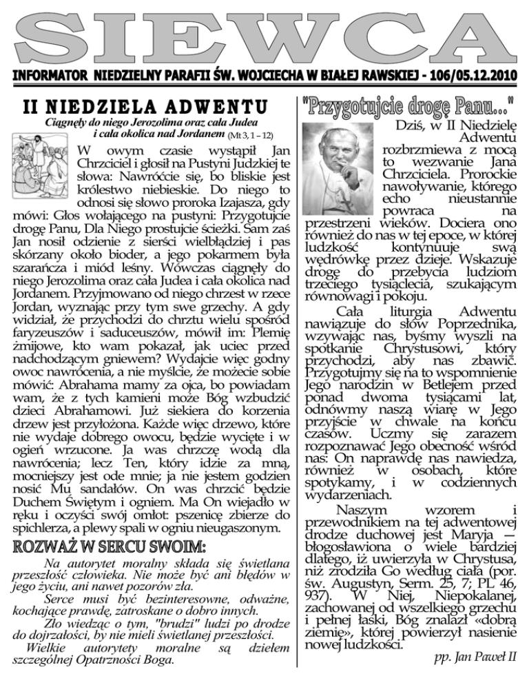Ciągnęły do niego Jerozolima oraz cała Judea i cała okolica nad Jordanem (Mt 3, 1 – 12) W owym czasie wystąpił Jan Chrzciciel i głosił na Pustyni Judzkiej te słowa: Nawróćcie się, bo bliskie jest królestwo niebieskie. Do niego to odnosi się słowo proroka Izajasza, gdy mówi: Głos wołającego na pustyni: Przygotujcie drogę Panu, Dla Niego prostujcie ścieżki. Sam zaś Jan nosił odzienie z sierści wielbłądziej i pas skórzany około bioder, a jego pokarmem była szarańcza i miód leśny. Wówczas ciągnęły do niego Jerozolima oraz cała Judea i cała okolica nad Jordanem. Przyjmowano od niego chrzest w rzece Jordan, wyznając przy tym swe grzechy. A gdy widział, że przychodzi do chrztu wielu spośród faryzeuszów i saduceuszów, mówił im: Plemię żmijowe, kto wam pokazał, jak uciec przed nadchodzącym gniewem? Wydajcie więc godny owoc nawrócenia, a nie myślcie, że możecie sobie mówić: Abrahama mamy za ojca, bo powiadam wam, że z tych kamieni może Bóg wzbudzić dzieci Abrahamowi. Już siekiera do korzenia drzew jest przyłożona. Każde więc drzewo, które nie wydaje dobrego owocu, będzie wycięte i w ogień wrzucone. Ja was chrzczę wodą dla nawrócenia; lecz Ten, który idzie za mną, mocniejszy jest ode mnie; ja nie jestem godzien nosić Mu sandałów. On was chrzcić będzie Duchem Świętym i ogniem. Ma On wiejadło w ręku i oczyści swój omłot: pszenicę zbierze do spichlerza, a plewy spali w ogniu nieugaszonym. Na autorytet moralny składa się świetlana przeszłość człowieka. Nie może być ani błędów w jego życiu, ani nawet pozorów zła. Serce musi być bezinteresowne, odważne, kochające prawdę, zatroskane o dobro innych. Zło wiedząc o tym, "brudzi" ludzi po drodze do dojrzałości, by nie mieli świetlanej przeszłości. Wielkie autorytety moralne są dziełem szczególnej Opatrzności Boga. Dziś, w II Niedzielę Adwentu rozbrzmiewa z mocą to wezwanie Jana Chrzciciela. Prorockie nawoływanie, którego echo nieustannie powraca na przestrzeni wieków. Dociera ono również do nas w tej epoce, w której ludzkość kontynuuje swą wędrówkę przez dzieje. Wskazuje drogę do przebycia ludziom trzeciego tysiąclecia, szukającym równowagi i pokoju. Cała liturgia Adwentu nawiązuje do słów Poprzednika, wzywając nas, byśmy wyszli na spotkanie Chrystusowi, który przychodzi, aby nas zbawić. Przygotujmy się na to wspomnienie Jego narodzin w Betlejem przed ponad dwoma tysiącami lat, odnówmy naszą wiarę w Jego przyjście w chwale na końcu czasów. Uczmy się zarazem rozpoznawać Jego obecność wśród nas: On naprawdę nas nawiedza, również w osobach, które spotykamy, i w codziennych wydarzeniach. Naszym wzorem i przewodnikiem na tej adwentowej drodze duchowej jest Maryja — błogosławiona o wiele bardziej dlatego, iż uwierzyła w Chrystusa, niż zrodziła Go według ciała (por. św. Augustyn, Serm. 25, 7; PL 46, 937). W Niej, Niepokalanej, zachowanej od wszelkiego grzechu i pełnej łaski, Bóg znalazł «dobrą ziemię», której powierzył nasienie nowej ludzkości. pp. Jan Paweł II W jednym mieszkaniu współżyją ze sobą trzy pokolenia. Przedstawicielem najstarszego jest babcia licząca 77 lat, najmłodsze reprezentują dwie wnuczki, jedna ma lat osiemnaście, druga dwadzieścia. Babcia nie może chodzić, więc co pewien czas przynoszę jej Komunię świętą. Z reguły zastawałem w mieszkaniu duży bałagan i nie znajdowałem ani ja, ani rodzice żadnych argumentów zdolnych przekonać młode dziewczęta, by zadbały o porządek. I oto pewnego razu wchodzę i zastaję zdumiewający ład. Wszystko na swoim miejscu, czyściutko, miło. Pytam, na kogo czekają. Tata tajemniczo się uśmiecha i powiada: „Najmłodsza córka się zakochała i odkąd do domu przychodzi jej chłopiec, wstaje wcześnie rano i robi porządki. Dla niego stać ją i na wysiłek, i na rezygnację z długiego snu”. Miłość dokonała w jej życiu nawrócenia. Przemieniła świat bałaganu, brudu, nieładu w miły, uporządkowany, piękny dom. Ten świat został nie tylko ubogacony wejściem innego człowieka, lecz gruntownie przemieniony – nastawiony na spotkanie, czekający na przeżycie czegoś, co jest piękne. Dotykamy tu tajemnicy nawrócenia. Człowiek najczęściej żyje w bałaganie, jeśli nie żyje dla kogoś. Trudno dla siebie samego podejmować trud upiększania swego świata, trudno w tym celu zmobilizować swe siły. A nawet jeśli się zdarzy, że ktoś dla siebie samego usiłuje idealnie poukładać swój świat, staje się on zimny, lodowaty. Porządek wprowadzony przez egoizm ostatecznie jest wielką klęską człowieka. Tysiące ludzi pragną się nawrócić, dostrzegają małość swego świata, potrzebę jego przemienienia i upiększenia, ale nie mają dla kogo tego uczynić. Stąd też nie posiadają dość siły, by tej zmiany dokonać. Istotnym elementem nawrócenia jest odkrycie prawdy, że moje życie ma sens jedynie wówczas, gdy na kogoś czekam, gdy dla kogoś żyję, gdy jestem komuś potrzebny. Chodzi o znalezienie kogoś, dla kogo mogę pracować, tworzyć, trudzić się i cierpieć. Kogoś, komu mogę być potrzebny nawet wówczas, gdy stracę siły, gdy świat zamknie się w granicach łoża boleści, gdy skleroza będzie utrudniać życie mnie i mojemu otoczeniu. Jeśli ten ktoś się znajdzie, w krótkim czasie w domu naszego serca zapanuje ład, zrobi się ciepło i jasno. Ojciec co drugie słowo rzucał klątwy. Upominała go żona, upominała matka – nic nie pomagało. Ale kiedy usłyszał, że jego synek uczący się mówić jako pierwsze słowo wypowiedział nie „mama” nie „tata” – ale słyszane od niego wulgarne przekleństwo, zaniemówił z wrażenia. W ciągu miesiąca wyrzucił wszystkie ordynarne słowa ze swego słownika. Uczynił to dla dziecka. To czego nie dokonały prośby ani matki, ani żony – dokonała miłość, prawdziwa troska o dobro maleńkiego 