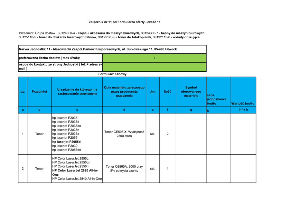 Za cznik nr 11 od Formularza oferty - cze 11 Przedmiot: Grupa dostaw 30124000-4 - cz ci i akcesoria do maszyn biurowych, 30124300-7 - bny do maszyn biurowych, 30125110-5 - toner do drukarek laserowych/faksów, 30125120-8 - toner do fotokopiarek, 30192113-6 - wk ady drukuj ce Nazwa Jednostki: 11 - Mazowiecki Zespó Parków Krajobrazowych, ul. Su kowskiego 11, 05-400 Otwock preferowana liczba dostaw ( max 4/rok): 1 osoba do kontaktu ze strony Jednostki ( tel. + adres email ) Formularz cenowy Lp. a 1 2 Przedmiot b Urz dzenie do którego ma zastosowanie asortyment c Toner hp laserjet P2035 hp laserjet P2035d hp laserjet P2035dn hp laserjet P2035n hp laserjet P2035x hp laserjet P2055 hp laserjet P2055d hp laserjet P2030 hp laserjet P2055dn Toner HP Color LaserJet 2550L HP Color LaserJet 2550Ln HP Color LaserJet 2550n HP Color LaserJet 2820 All-inOne HP Color LaserJet 2840 All-in-One Opis materia u zalecanego przez producenta urz dzenia d Toner CE505 X. Wydajno 2300 stron Toner Q3960A, 2000 przy 5% pokrycia czarny Jm. Ilo e f szt. 2 szt. 1 Symbol oferowanego materia u g cena jednostkowa brutto h Warto brutto i=f x h 3 Toner 4 Toner 5 Toner 6 ben 7 8 HP Color LaserJet 2550L HP Color LaserJet 2550Ln HP Color LaserJet 2550n HP Color LaserJet 2820 All-inOne HP Color LaserJet 2840 All-in-One Toner Q3961A , b kitny HP Color LaserJet 2550L HP Color LaserJet 2550Ln HP Color LaserJet 2550n Toner Q 3962A, ty HP Color LaserJet 2820 All-inOne HP Color LaserJet 2840 All-in-One HP Color LaserJet 2550L HP Color LaserJet 2550Ln HP Color LaserJet 2550n Toner Q 3963A, purpurowy HP Color LaserJet 2820 All-inOne HP Color LaserJet 2840 All-in-One HP Color LaserJet 2550L HP Color LaserJet 2550Ln B ben do drukarki kolorowej HP Color LaserJet 2550n Q3964 A, 20000 przy 5% HP Color LaserJet 2820 All-inpokrycia One HP Color LaserJet 2840 All-in-One szt. 1 szt. 1 szt. 1 szt. 1 Toner hp Color LaserJet 1600, hp Color LaserJet 2600, hp Color LaserJet 2600n, hp Color LaserJet 2605 hp Color LaserJet CM1015MFP, hp Color LaserJet CM1017MFP Toner Q6000A, czarny wydajno : 2500 str. A4 szt. 1 Toner hp Color LaserJet 1600, hp Color LaserJet 2600, hp Color LaserJet 2600n, hp Color LaserJet 2605 hp Color LaserJet CM1015MFP, hp Color LaserJet CM1017MFP Toner Q6001A (cyan), kitny szt. 1 Toner hp Color LaserJet 1600, hp Color LaserJet 2600, hp Color LaserJet 2600n, hp Color LaserJet 2605 hp Color LaserJet CM1015MFP, hp Color LaserJet CM1017MFP 10 Toner hp Color LaserJet 1600, hp Color LaserJet 2600, hp Color LaserJet 2600n, hp Color LaserJet 2605 hp Color LaserJet CM1015MFP, hp Color LaserJet CM1017MFP 11 Toner Drukarka Brother MFC - L2700DW 12 Toner drukarka HP Laser Jet P1505n 13 Toner drukarka Brother HI22500DN 14 Toner 15 9 Toner Q6003A (magenta), czerwony szt. 1 szt. 1 Toner TN2320, czarny szt. 3 Toner CB436A, czarny szt. 1 Toner TN-2210XN, czarny szt. 2 drukarka hp Laserjet 1200 Toner C7115A, czarny szt. 1 Toner Brother HL-2035 Toner tn-2005, czarny, wydajno 2 500 stron szt. 1 16 Toner HP laserJet 1200 toner 15n XL, szt. 1 17 Toner HP Color LaserJet CM1312 MFP Series PCL 6 Oryginalny toner CB540A (HP 125A), czarny szt. 2 18 Toner HP Color LaserJet CM1312 MFP Series PCL 6 Oryginalny toner CB541A (HP 125A) Niebieski szt. 2 19 Toner HP Color LaserJet CM1312 MFP Series PCL 6 Oryginalny toner CB542A (HP 125A) ty szt. 2 Toner Q6002A (yellow), ty 20 Toner HP Color LaserJet CM1312 MFP Series PCL 6 Oryginalny toner CB543A (HP 125A) Purpurowy szt. 2 21 Toner HP Laser Jet CP1025 Oryginalny toner CE310A (HP 126A) Czarny szt. 1 22 Toner HP Laser Jet CP1025 Oryginalny toner CE311A (HP 126A) Niebieski szt. 1 23 Toner HP Laser Jet CP1025 Oryginalny toner CE312A (HP 126A) ty szt. 1 24 Toner HP Laser Jet CP1025 Oryginalny toner CE313A (HP 126A) Purpurowy szt. 1 25 Toner HP Laser Jet P1005 szt. 2 26 Toner cannon Imagerunner 2318 Oryginalny toner Canon CEXV 14 szt. 3 27 Tusz HP Desk Jet 6520 HP 343 szt. 3 27a Tusz HP Desk Jet 6520 HP 339 szt. 3 Oryginalny toner czarny 35A H 28 Tusz HP dj 3550 HP 27 (czarny) szt. 3 28a Tusz HP dj 3550 HP 28 (kolor) szt. 3 29 Tusz drukarka Canon iX4000 Tusz 5 PGBK PGI-5BK, czarny szt. 3 30 Tusz drukarka Canon iX4000 Tusz 8C CLI-8C ,niebieski szt. 3 31 Tusz drukarka Canon iX4000 Tusz 8M CLI-8M, czerwony szt. 3 32 Tusz drukarka Canon iX4000 szt. 5 33 Tusz drukarka HP Oficcejet 6000 tusz HP 920 HL, czarny (zamiennik) szt. 2 34 Tusz drukarka HP Oficcejet 6000 tusz HP 920 HL, niebieski (zamiennik) szt. 2 35 Tusz drukarka HP Oficcejet 6000 tusz HP 920 HL, zó ty (zamiennik) szt. 2 36 Tusz drukarka HP Oficcejet 6000 tusz HP 920 HL, ró owy szt. 2 37 Tusz Hp Officejet Pro 8100 Oryginalny kartrid CN049A (HP 950) Czarny, szt. 2 38 Tusz Hp Officejet Pro 8100 Oryginalny kartrid CN050A (HP 951) Niebieski szt. 2 Tusz 8Y CLI-8Y, ty 39 Tusz Hp Officejet Pro 8100 Oryginalny kartrid CN052A (HP 951) ty szt. 2 40 Tusz Hp Officejet Pro 8100 Oryginalny kartrid CN051A (HP 951) Purpurowy szt. 2 41 Tusz canon iX 4000 szt. 2 42 Tusz canon iX 4000 szt. 2 43 Tusz canon iX 4000 szt. 2 44 Tusz canon iX 4000 szt. 2 45 Tusz Canon iX 6550 szt. 5 46 Tusz Canon iX 6550 szt. 5 47 Tusz Canon iX 6550 Oryginalny kartrid CLI-526Y ty (4543B001) szt. 5 48 Tusz Canon iX 6550 Oryginalny kartrid CLI-526M Purpurowy (4542B001) szt. 5 49 Tusz HP Officejet 4500 Wireless HP 901XL, HP-CC653AE szt. 4 50 Tusz HP Officejet 4500 Wireless HP901, HP-CC656AE szt. 4 51 Tusz urzadzenie wielofunkcyjne HP Photosmart Plus model B209c Tusz HP CB321E, czarny szt. 1 52 Tusz urz dzenie wielofunkcyjne HP Photosmart Plus model B209c Tusz HP CB323E, niebieski szt. 1 53 Tusz urz dzenie wielofunkcyjne HP Photosmart Plus model B209c Tusz HP CB324E, czerwony szt. 1 54 Tusz urz dzenie wielofunkcyjne HP Photosmart Plus model B209c szt. 2 55 Toner Ksero Olivetti d-copia 1600 szt. 2 Oryginalny kartrid PGI-5B Czarny (0628B001) Oryginalny kartrid CLI-8C Niebieski (0621B001) Oryginalny kartrid CLI-8Y ty (0623B001) Oryginalny kartrid CLI-8M Purpurowy (0622B001) Oryginalny kartrid CLI526Bk Photo Czar