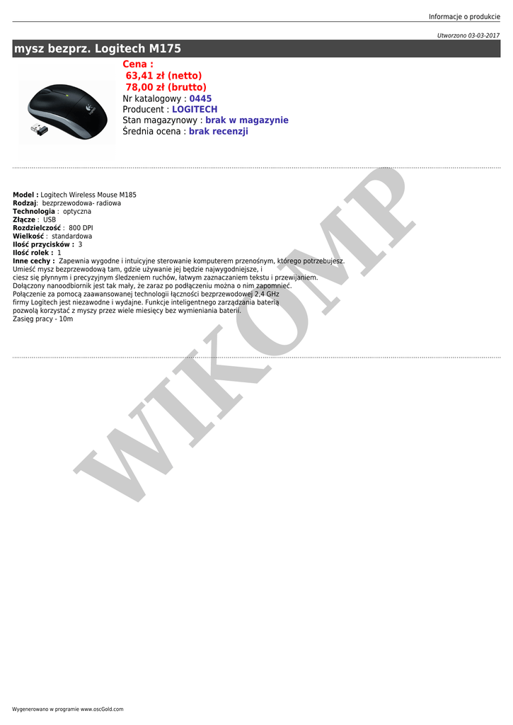 Informacje o produkcie Utworzono 03-03-2017 mysz bezprz. Logitech M175 Cena : 63,41 zł (netto) 78,00 zł (brutto) Nr katalogowy : 0445 Producent : LOGITECH Stan magazynowy : brak w magazynie Średnia ocena : brak recenzji W IK O M P Model : Logitech Wireless Mouse M185 Rodzaj: bezprzewodowa- radiowa Technologia : optyczna Złącze : USB Rozdzielczość : 800 DPI Wielkość : standardowa Ilość przycisków : 3 Ilość rolek : 1 Inne cechy : Zapewnia wygodne i intuicyjne sterowanie komputerem przenośnym, którego potrzebujesz. Umieść mysz bezprzewodową tam, gdzie używanie jej będzie najwygodniejsze, i ciesz się płynnym i precyzyjnym śledzeniem ruchów, łatwym zaznaczaniem tekstu i przewijaniem. Dołączony nanoodbiornik jest tak mały, że zaraz po podłączeniu można o nim zapomnieć. Połączenie za pomocą zaawansowanej technologii łączności bezprzewodowej 2,4 GHz firmy Logitech jest niezawodne i wydajne. Funkcje inteligentnego zarządzania baterią pozwolą korzystać z myszy przez wiele miesięcy bez wymieniania baterii. Zasięg pracy - 10m Wygenerowano w programie www.oscGold.com