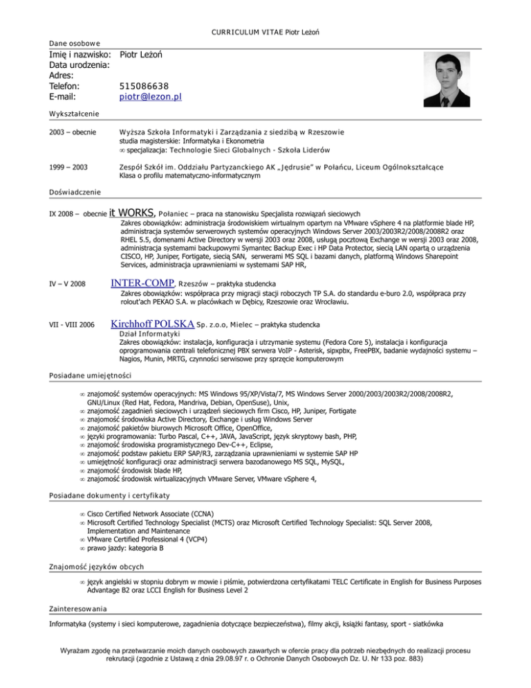 CURRICULUM VITAE Piotr Leżoń Dane osobowe Imię i nazwisko: Piotr Leżoń Data urodzenia: Adres: Telefon: 515086638 E-mail: [email protected] Wykształcenie 2003 – obecnie Wyższa Szkoła Informatyki i Zarządzania z siedzibą w Rzeszowie studia magisterskie: Informatyka i Ekonometria • specjalizacja: Technologie Sieci Globalnych - Szkoła Liderów 1999 – 2003 Zespół Szkół im. Oddziału Partyzanckiego AK „Jędrusie” w Połańcu, Liceum Ogólnokształcące Klasa o profilu matematyczno-informatycznym Doświadczenie IX 2008 – obecnie it WORKS, Połaniec – praca na stanowisku Specjalista rozwiązań sieciowych Zakres obowiązków: administracja środowiskiem wirtualnym opartym na VMware vSphere 4 na platformie blade HP, administracja systemów serwerowych systemów operacyjnych Windows Server 2003/2003R2/2008/2008R2 oraz RHEL 5.5, domenami Active Directory w wersji 2003 oraz 2008, usługą pocztową Exchange w wersji 2003 oraz 2008, administracja systemami backupowymi Symantec Backup Exec i HP Data Protector, siecią LAN opartą o urządzenia CISCO, HP, Juniper, Fortigate, siecią SAN, serwerami MS SQL i bazami danych, platformą Windows Sharepoint Services, administracja uprawnieniami w systemami SAP HR, IV – V 2008 INTER-COMP, Rzeszów – praktyka studencka Zakres obowiązków: współpraca przy migracji stacji roboczych TP S.A. do standardu e-buro 2.0, współpraca przy rolout'ach PEKAO S.A. w placówkach w Dębicy, Rzeszowie oraz Wrocławiu. VII - VIII 2006 Kirchhoff POLSKA Sp. z.o.o, Mielec – praktyka studencka Dział Informatyki Zakres obowiązków: instalacja, konfiguracja i utrzymanie systemu (Fedora Core 5), instalacja i konfiguracja oprogramowania centrali telefonicznej PBX serwera VoIP - Asterisk, sipxpbx, FreePBX, badanie wydajności systemu – Nagios, Munin, MRTG, czynności serwisowe przy sprzęcie komputerowym Posiadane umiejętności • znajomość systemów operacyjnych: MS Windows 95/XP/Vista/7, MS Windows Server 2000/2003/2003R2/2008/2008R2, GNU/Linux (Red Hat, Fedora, Mandriva, Debian, OpenSuse), Unix, • znajomość zagadnień sieciowych i urządzeń sieciowych firm Cisco, HP, Juniper, Fortigate • znajomość środowiska Active Directory, Exchange i usług Windows Server • znajomość pakietów biurowych Microsoft Office, OpenOffice, • języki programowania: Turbo Pascal, C++, JAVA, JavaScript, język skryptowy bash, PHP, • znajomość środowiska programistycznego Dev-C++, Eclipse, • znajomość podstaw pakietu ERP SAP/R3, zarządzania uprawnieniami w systemie SAP HP • umiejętność konfiguracji oraz administracji serwera bazodanowego MS SQL, MySQL, • znajomość środowisk blade HP, • znajomość środowisk wirtualizacyjnych VMware Server, VMware vSphere 4, Posiadane dokumenty i certyfikaty • Cisco Certified Network Associate (CCNA) • Microsoft Certified Technology Specialist (MCTS) oraz Microsoft Certified Technology Specialist: SQL Server 2008, Implementation and Maintenance • VMware Certified Professional 4 (VCP4) • prawo jazdy: kategoria B Znajomość języków obcych • język angielski w stopniu dobrym w mowie i piśmie, potwierdzona certyfikatami TELC Certificate in English for Business Purposes Advantage B2 oraz LCCI English for Business Level 2 Zainteresowania Informatyka (systemy i sieci komputerowe, zagadnienia dotyczące bezpieczeństwa), filmy akcji, książki fantasy, sport - siatkówka Wyrażam zgodę na przetwarzanie moich danych osobowych zawartych w ofercie pracy dla potrzeb niezbędnych do realizacji procesu rekrutacji (zgodnie z Ustawą z dnia 29.08.97 r. o Ochronie Danych Osobowych Dz. U. Nr 133 poz. 883)