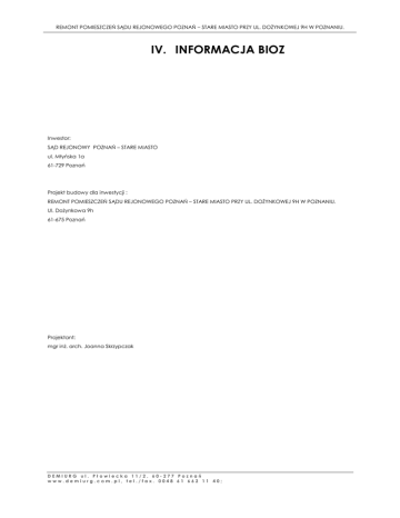 REMONT POMIESZCZEŃ SĄDU REJONOWEGO POZNAŃ – STARE MIASTO PRZY UL. DOŻYNKOWEJ 9H W POZNANIU. IV. INFORMACJA BIOZ Inwestor: SĄD REJONOWY POZNAŃ – STARE MIASTO ul. Młyńska 1a 61-729 Poznań Projekt budowy dla inwestycji : REMONT POMIESZCZEŃ SĄDU REJONOWEGO POZNAŃ – STARE MIASTO PRZY UL. DOŻYNKOWEJ 9H W POZNANIU. Ul. Dożynkowa 9h 61-675 Poznań Projektant: mgr inż. arch. Joanna Skrzypczak DEMIURG ul. Płowiecka 11/2, 60-277 Poznań www.demiurg.com.pl, tel./fax. 0048 61 662 11 40; REMONT POMIESZCZEŃ SĄDU REJONOWEGO POZNAŃ – STARE MIASTO PRZY UL. DOŻYNKOWEJ 9H W POZNANIU. 1 Podstawa opracowania: • Ustawy z dnia 7 lipca 1994 Prawo budowlane (Dz. U. z 2000 r., nr 106, poz. 1126, z późn. zm. 2). • Rozporządzenie Ministra Infrastruktury z dnia 23.06.2003r. w sprawie informacji dotyczącej bezpieczeństwa i • Rozporządzenie Ministra Budownictwa i Przemysłu Materiałów Budowlanych z dnia 28.03.1972r. w sprawie ochrony zdrowia oraz planu bezpieczeństwa i ochrony zdrowia (Dz.U.Nr 12, poz.1126); bezpieczeństwa i higieny pracy przy wykonywaniu robót budowlano-montażowych i rozbiórkowych (Dz.U. Nr 13, poz. 93); • Rozporządzenie Ministra Pracy i Polityki Socjalnej z dnia 26.09.1997 w sprawie ogólnych przepisów bezpieczeństwa i higieny pracy (Dz. U. Nr 129, poz. 844); • Rozporządzenie Ministra Pracy i Polityki Socjalnej z dnia 08.02.1994r. w sprawie wprowadzenia obowiązku stosowania niektórych Polskich Norm i norm branżowych dotyczących bezpieczeństwa i higieny pracy (Dz. U. Nr 37, poz.138); 2 Niniejsza informacja BIOZ zawiera: 1. Zakres robót całego zamierzenia budowlanego oraz kolejność realizacji robót. 2. Wskazanie elementów zagospodarowania działki lub terenu, które mogą stwarzać zagrożenie bezpieczeństwa i zdrowia ludzi. 3. Informacje dotyczące przewidywanych zagrożeń występujących podczas realizacji robót budowlanych, określające skalę i rodzaje zagrożeń oraz miejsce i czas ich wystąpienia. 4. Informacja o wydzieleniu i oznakowaniu miejsca prowadzenia robót budowlanych, stosownie do rodzaju zagrożenia. 5. Informacja o sposobie prowadzenia instruktażu pracowników przed przystąpieniem do realizacji robót szczególnie niebezpiecznych. 6. Wskazanie środków technicznych i organizacyjnych, zapobiegających niebezpieczeństwom wynikającym z wykonywania robót budowlanych w strefach szczególnego zagrożenia zdrowia lub w ich sąsiedztwie, w tym zapewniających bezpieczną i sprawną komunikację, umożliwiającą szybką ewakuację na wypadek pożaru, awarii i innych zagrożeń. 7. Wskazanie miejsca przechowywania dokumentacji budowy oraz dokumentów niezbędnych do prawidłowej eksploatacji maszyn i innych urządzeń technicznych. 8. Obowiązujące przepisy i normy prawne. 3 Zakres robót dla całego zamierzenia budowlanego oraz kolejność realizacji obiektu Przed rozpoczęciem robót budowlanych wykonawcę zobowiązuje się do: -wydzielenia i zabezpieczenia modernizowanych części obiektu i wyznaczenia stref niebezpiecznych, -zapewnienia energii elektrycznej oraz wody, zwanych dalej "mediami", oraz odprowadzania lub utylizacji ścieków -zapewnienia pomieszczeń higieniczno-sanitarnych i socjalnych -zapewnienia oświetlenia naturalnego i sztucznego -zapewnienia właściwej wentylacji Roboty będą wykonywane w następującej kolejności: - demontaż stolarki drzwiowej, istniejących podłóg i ścian działowych przeznaczonych do wymiany; - demontaż istniejącej armatury łazienkowej; - wykonanie nowych warstw podłogowych oraz podestów sędziowskich; - wykonanie ścianek działowych; - wykonanie prac instalacyjnych; - wykończenie powierzchni ścian i sufitów; - montaż stolarki drzwiowej i okiennej; - remont łazienek. DEMIURG ul. Płowiecka 11/2, 60-277 Poznań www.demiurg.com.pl, tel./fax. 0048 61 662 11 40; REMONT POMIESZCZEŃ SĄDU REJONOWEGO POZNAŃ – STARE MIASTO PRZY UL. DOŻYNKOWEJ 9H W POZNANIU. Po zakończeniu robót budowlanych teren zostanie uporządkowany. 4 Wskazanie elementów zagospodarowania bezpieczeństwa i zdrowia ludzi działki lub terenu, które mogą stwarzać zagrożenie Elementami zagospodarowania działki lub terenu, które mogą stwarzać zagrożenie bezpieczeństwa i zdrowia ludzi należy objąć wszelkie miejsca, w których istnieje zagrożenie spadania z wysokości przedmiotów 5 Informacje dotyczące przewidywanych zagrożeń występujących podczas realizacji robót budowlanych, określające skalę i rodzaje zagrożeń oraz miejsce i czas ich wystąpienia. Plan bezpieczeństwa i ochrony zdrowia sporządza się z uwagi na roboty, przy których wykonywaniu występuje ryzyko upadku z wysokości ponad 5,0 m oraz roboty wykonywane przy użyciu dźwigów. 6 Informacja o wydzieleniu i oznakowaniu miejsca prowadzenia robót budowlanych, stosownie do rodzaju zagrożenia. Przed rozpoczęciem robót budowlanych teren budowy należy ogrodzić (wysokość ogrodzenia min. 1,5 m) albo w inny sposób uniemożliwić wejście osób nieupoważnionych. Przewiduje się stały nadzór placu budowy. Na terenie budowy wyznaczyć ewentualne strefy niebezpieczne, np. miejsca w których istnieje zagrożenie spadania z wysokości przedmiotów. Strefy niebezpieczne ogrodzić i oznakować w sposób uniemożliwiający dostęp osobom postronnym. 7 Informacja o sposobie prowadzenia instruktażu pracowników przed przystąpieniem do realizacji robót szczególnie niebezpiecznych. Wykonawca przed przystąpieniem do wykonywania robót budowlanych opracuje instrukcję bezpiecznego ich wykonywania i zaznajomi z nią pracowników w zakresie wykonywanych przez nich robót. Zobowiązuje się do współdziałania ze sobą uczestników procesu budowlanego w zakresie bezpieczeństwa i higieny pracy w procesie przygotowania i realizacji budowy oraz stosowania środków ochrony indywidualnej. Pracodawca jest obowiązany udostępnić pracownikom, do stałego korzystania, aktualne instrukcje bezpieczeństwa i higieny prac