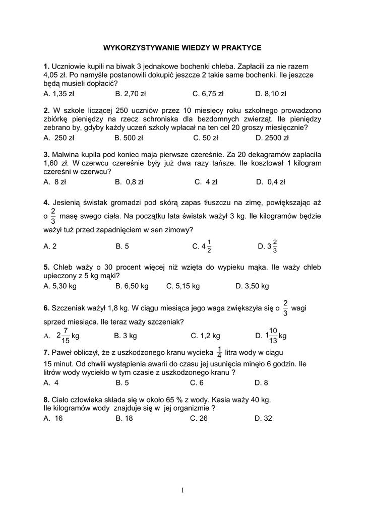 WYKORZYSTYWANIE WIEDZY W PRAKTYCE 1. Uczniowie kupili na biwak 3 jednakowe bochenki chleba. Zapłacili za nie razem 4,05 zł. Po namyśle postanowili dokupić jeszcze 2 takie same bochenki. Ile jeszcze będą musieli dopłacić? A. 1,35 zł B. 2,70 zł C. 6,75 zł D. 8,10 zł 2. W szkole liczącej 250 uczniów przez 10 miesięcy roku szkolnego prowadzono zbiórkę pieniędzy na rzecz schroniska dla bezdomnych zwierząt. Ile pieniędzy zebrano by, gdyby każdy uczeń szkoły wpłacał na ten cel 20 groszy miesięcznie? A. 250 zł B. 500 zł C. 50 zł D. 2500 zł 3. Malwina kupiła pod koniec maja pierwsze czereśnie. Za 20 dekagramów zapłaciła 1,60 zł. W czerwcu czereśnie były już dwa razy tańsze. Ile kosztował 1 kilogram czereśni w czerwcu? A. 8 zł B. 0,8 zł C. 4 zł D. 0,4 zł 4. Jesienią świstak gromadzi pod skórą zapas tłuszczu na zimę, powiększając aż 2 o masę swego ciała. Na początku lata świstak ważył 3 kg. Ile kilogramów będzie 3 ważył tuż przed zapadnięciem w sen zimowy? A. 2 B. 5 C. 4 1 2 D. 3 2 3 5. Chleb waży o 30 procent więcej niż wzięta do wypieku mąka. Ile waży chleb upieczony z 5 kg mąki? A. 5,30 kg B. 6,50 kg C. 5,15 kg D. 3,50 kg 6. Szczeniak ważył 1,8 kg. W ciągu miesiąca jego waga zwiększyła się o 2 wagi 3 sprzed miesiąca. Ile teraz waży szczeniak? 7 10 A. 2 kg B. 3 kg C. 1,2 kg D. 1 kg 15 13 1 7. Paweł obliczył, że z uszkodzonego kranu wycieka 4 litra wody w ciągu 15 minut. Od chwili wystąpienia awarii do czasu jej usunięcia minęło 6 godzin. Ile litrów wody wyciekło w tym czasie z uszkodzonego kranu ? A. 4 B. 5 C. 6 D. 8 8. Ciało człowieka składa się w około 65 % z wody. Kasia waży 40 kg. Ile kilogramów wody znajduje się w jej organizmie ? A. 16 B. 18 C. 26 D. 32 1 9. Jedna łyżeczka miodu waży przeciętnie 7,2 g. Pan Adam wypija codziennie szklankę wody z trzema łyżeczkami miodu, a jego żona – z dwiema. Na ile dni wystarczy im słoik zawierający 360 g miodu? A. Na 10 dni. B. Na 25 dni. C. Na 50 dni. D. Na 36 dni. 10. Mapa wykonana jest w skali 1:15 000 000. Oznacza to, że 1 centymetr na tej mapie to w terenie A. 15 000 km B. 15 km C. 1500 km D. 150 km 11. Z młyna do piekarni jest 150 m. Ile to centymetrów na planie w skali 1:5000? A. 3 B. 2 C. 10 D. 7,5 12. Na planie w skali 1:2000 odległość od ula do rosnącej na łące lipy jest równa 4 cm. Jaka jest odległość w terenie między ulem a tą lipą? A. 500 m B. 50 m C. 800 m D. 80 m 13. Na mapie w skali 1:500 000 odcinek łączący Hajnówkę z Białowieżą ma 3 cm długości. Jaka jest odległość w terenie, w linii prostej, między tymi miastami? A. 15 km B. 1,5 km C.150 km D. 1500 km Rysunek do zadania 14. Głębokość zanurzenia z zatrzymanym oddechem 14. Na głębokość większą niż 1 kilometr zanurza się A. żółw. B. delfin. C. kaszalot. D. słoń morski. 64 cm 15. Pudło po telewizorze ma wysokość 64 cm i podstawę o wymiarach 60 cm i 70 cm. Marek chce je wykorzystać, by zrobić z kartonu okrągłą tarczę do gry „w strzałki”. Ze ściany bocznej o największej powierzchni wyciął możliwie największe koło. Jaki jest promień tego koła? A. 60 cm B. 32 cm C. 64 cm D. 35 cm 70 cm 60 cm 2 16. Droga na szczycie Muru Chińskiego miała szerokość 5,5 m, co pozwalało na swobodne przemieszczanie się wojska. Ilu żołnierzy mogło stanąć w szeregu w poprzek tej drogi, jeżeli każdy z nich zajmował średnio 0,55 m? A. 5 B. 10 C. 20 D. 100 17. Turyści zorganizowali trzydniową wycieczkę drogą na szczycie Muru Chińskiego. Każdego dnia wędrowali przez 5 godzin ze średnią prędkością 4 km na godzinę. Ile kilometrów przeszli podczas całej wycieczki? A. 20 km B. 12 km C. 60 km D. 15 km Tekst do zadań 18. i 19. W Polsce buduje się drogi szybkiego ruchu. Hałas i spaliny samochodowe stają się uciążliwe dla mieszkańców pobliskich miast i wsi. W celu ochrony sąsiadujących z drogami szybkiego ruchu osiedli buduje się specjalne ściany zwane ekranami. 18. Szerokość jednego ekranu wynosi 112 m. Ile takich ekranów trzeba ustawić po obu stronach jezdni wzdłuż całego odcinka drogi o długości 1 km? A. 18 B. 16 C. 9 D. 8 19. Ekran widziany z drogi szybkiego ruchu jest prostokątną ścianą o wymiarach 5,5 m x 112 m. Ile metrów kwadratowych ma ta ściana? A. 616 m² B. 560 m² C. 235 m² D. 117,5 m² Tekst do zadań 20. i 21. Najwyższym szczytem Polski są Rysy (2499 m n.p.m.). Najniżej w Polsce leżą Raczki Elbląskie (1,8 m p.p.m.). 20. Jaka jest różnica wysokości między wierzchołkiem Rysów, a najniżej położonym miejscem w Polsce? A. 2497,2 m B. 2500,8 m C. 2500,2 m D. 2498,8 m 21. Raczki Elbląskie leżą na obszarze A. gór. B. wyżyn. C. nizin. D. depresji. 22. Jeden z największych dębów w Górach Świętokrzyskich nazywa się Bartek. Obwód jego pnia jest równy 13,50 m, czyli A. 1350 dm B. 135 dm C. 13500 cm D. 135 cm Informacja do zadania 23. [oC] Pewnego dnia w Letniewie przeprowadzano pomiary temperatury powietrza. Zanotowane wyniki pomiarów przedstawiono na wykresie. 16 12 8 4 0 00 8 10 00 12 00 14 00 16 00 18 00 20 3 00 22 00 23. Jaka jest różnica między najwyższą a najniższą temperaturą zanotowaną w tym dniu? A. 2°C B. 4°C C. 6°C D. 8°C 24. W zimowy dzień w środku ula było plus 24°C, a na zewnątrz ula minus 17,5°C. W środku ula było wtedy cieplej niż na zewnątrz o A. 6,5°C B. 7,5°C C. 40,5°C D. 41,5°C Informacja do zadania 25. • • • • W instrukcji obsługi telewizora znalazły się następujące ostrzeżenia: Wyjmuj wtyczkę z gniazdka sieciowego, jeśli nie używasz telewizora przez dłuższy czas. Nie zdejmuj tylnej pokrywy odbiornika, ponieważ odsłonięte elementy znajdują się pod napięciem. Nie narażaj telewizora na działanie deszczu lub nadmiernej wilgoci. Unikaj wystawiania odbiornika na bezpośrednie działanie promieni słońca lub innych źródeł ciepła. 25. Instrukcja ostrzega, że nie powinno się A. odłącza