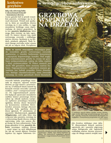 królestwo grzybów Jaką rolę odrywają huby w ekosystemach leśnych? – konsumenci drewna Liczne gatunki hub to przede wszystkim pasożyty, rozwijające się na żywych drzewach. Wśród nich spotkamy te, które po zasiedleniu drzewa rozwijają się w nim szybko, w ciągu stosunkowo krótkiego czasu doprowadzając do śmierci gospodarza. Są to tzw. pasożyty fakultatywne, które mogą dalej rozwijać się jako saprotrofy. Po śmierci drzewa żyją nadal wytwarzając owocniki i rozkładając martwe drewno. Spotkamy je na kłodach, pniakach, gałęziach. Ślady historii danego owocnika widać czasem tak jak na zdjęciu obok. Początkowo w świecie grzybów nadrzewnych grzybowa wspinaczka na drzewa Huby to nazwa zwyczajowa obejmująca przede wszystkim grzyby wytwarzające owocniki nadrzewne, o twardej, korkowatej konsystencji i najczęściej kopytowatego kształtu. Pod względem systematycznym grzyby te, zwane też grzybami poliporoidalnymi, należą do kilku rzędów z klasy podstawczaków. W Polsce znanych jest około 300 gatunków, które możemy nazwać hubami. Najpospolitszym i najbardziej znanym gatunkiem jest hubiak pospolity Fomes fomentarius, którego charakterystyczne, szare owocniki wyrastają na wielu gatunkach drzew liściastych. owocniki hubiaka pospolitego wyrastały na stojącym, zapewne żywym drzewie, po jego śmierci i przewróceniu się, w kolejnych latach zmienił się kierunek wzrostu owocnika i powstał osobliwy „twór” o nietypowym kształcie. Do najpoważniejszych pasożytów będących sprawcami stosunkowo szybkiej śmierci porażonego drzewa należy np. żółciak siarkowy Laetiporus suphureus powodujący brunatną zgniliznę drewna drzew liściastych czy korzeniowiec wieloletni Heterobasidion annosum, którego obecność powoduje białą zgniliznę drewna drzew iglastych. W odróżnieniu od pasożytów fakultatywnych, pasożyty obligatoryjne, czyli takie, które żyją wyłącznie jako pasożyty, rozwijają się i wykorzystują tkanki drzewa wolniej, zapewniając sobie tym samym długi dostęp do bazy pokarmowej. Duża grupa gatunków to tzw. pasożyty słabości, porażające wiekowe drzewa i często żyjące na nich kilkadziesiąt lat, jak np. ozorek dębowy Fistulina Jasnożółte, okazałe owocniki żółciaka siarkowego z daleka. Jego młode kapelusze są hepatica czy żagiew listkowata Gri- wypatrzymy jadalne. Ten malowniczo wyglądający gatunek jest jednym z najgroźniejszych pasożytów drzew liściastych. FOT. K. KUJAWA FOT. K. KUJAWA U podstawy starych dębów spotkać można chronionego ozorka dębowego przypominającego duży język lub... wątrobę. Zwany był „befsztykiem dla ubogich”, bo wyglądem i konsystencją przypomina też płat mięsa. FOT. G. DOMIAN fola frondosa infekujące stare dęby. W zbiorowiskach leśnych zarówno saprotrofy, jak i pasożyty odgrywają ważne biologicznie role. Saprotrofy rozkładają martwe drewno przywracając do obiegu materii związki zma- Połyskujące, gładkie kapelusze żagwi kasztanowej najczęściej wyrastają na wierzbach, dębach, grabach. Przeważnie tworzą duże, widoczne z daleka skupienia wachlarzowatych owocników. Gładkie, cienkie, błyszczące kapelusze żagwi kasztanowej mają barwę dojrzałych kasztanów. FOT. K. KUJAWA Wachlarzowiec olbrzymi tworzy u podstawy dębów i buków duże, rozłożyste, ciepłobrązowe owocniki widoczne z daleka. Ten chroniony gatunek dobrze przystosował się do siedlisk poza lasami, spotkamy go w starych parkach, na cmentarzach i w przydrożnych alejach. FOT. K. KUJAWA gazynowane przez lata w tkankach drzew. Pasożyty natomiast eliminując drzewa słabsze lub stare uczestniczą w procesie naturalnej sukcesji ekosystemów. W lasach gospodarczych są organizmami niepożądanymi (z punktu widzenia człowieka), bo wpływają negatywnie na jakość drewna. Wybredni smakosze i wszystkożercy czyli monofagi i polifagi Przyglądając się hubom zauważymy, że niektóre gatunki spotykamy tylko na brzozach, inne na dębach, a jeszcze inne na sosnach. To monofagi, zdolne do rozwoju wyłącznie na określonym gatunku gospodarza. Na modrzewiach mamy szansę spotkać bardzo rzadki już w Polsce gatunek – pniarka (modrzewnika) lekarskiego Fomitopsis officinalis, u podstawy starych dębów znajdziemy ozorka dębowego, na dębowych pniakach – konsolowate, grube owocniki gmatwka dębowego Daedalea quercina, wysoko, na żywych sosnach – wyrastać będzie czyreń sosnowy Phellinus pini, na brzozie spostrzeżemy białawe nerkowate białoporki brzozowe Piptoporus betulinus, w górach u podstawy jodeł znajdziemy jodłownicę górską Bondarzewia mezenterica, a na bukach smoluchę bukową Ischnoderma resinosum. Na świerkach wyrasta blisko z nią spokrewniona smolucha świerko- Kopytowate owocniki pniarków obrzeżonych rozpoznamy po jaskrawej, pomarańczowej obwódce na brzegu owocnika. FOT. K. KUJAWA Młode owocniki murszaka rdzawego wyglądają jak puchate żółte pluszaki, w miarę rozwoju ciemnieją i przybierają formę rozłożystego lejka. FOT. K. KUJAWA W Puszczy Białowieskiej na świerkach można znaleźć smoluchę świerkową, na bukach Gęstoporek cynobrowy tworzy jaskrawo zabar- wyrasta bardzo podobny gatunek: smolucha wione owocniki wyraźnie kontrastujące z podło- bukowa widoczna na fotografii. FOT. G. DOMIAN żem. Najczęściej wyrasta na opadłych gałęziach zagrzebanych w ściółce. Po jaskrawych pomarańczowoczerwonych rurkach rozpoznamy gęstoporka cynobrowego bezbłędnie. FOT. K. KUJAWA wa B. benzoinum. W przeciwieństwie do takich „wybrednych” gatunków, żółciaka siarkowego i żagiew łuskowatą Polyporus squamosus spotkamy na różnych gatunkach drzew liściastych – dębach, robiniach, czereśniach, wierzbach, jesionach, wiązach. Żółciak i żagiew to przykłady polifagów mających zdolność do zasiedlania drzew należących do różnych gatunków. Kopyta, konsole, wachlarze w... kolorach tęczy Huby odznaczają się rozm