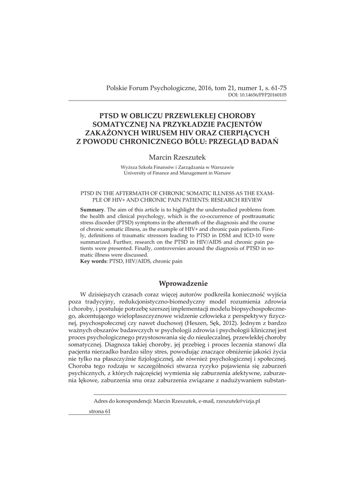 ptsd w obliczu przewlekłej choroby somatycznej na przykładzie