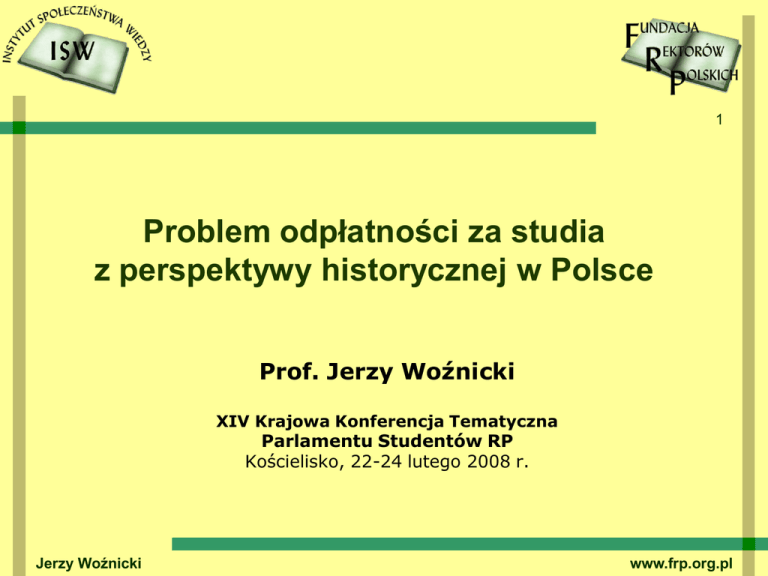 1 Problem odpłatności za studia z perspektywy historycznej w Polsce Prof. Jerzy Woźnicki XIV Krajowa Konferencja Tematyczna Parlamentu Studentów RP Kościelisko, 22-24 lutego 2008 r. Jerzy Woźnicki www.frp.org.pl Plan wystąpienia 2 1) 2) 3) 4) Motto. Rozwiązania historyczne. Uwarunkowania wynikające z Konstytucji RP z 1997 r. Różne zgłoszone propozycje dotyczące odpłatności za studia. 5) Argumentacja. 6) Konkluzja. 7) Współdziałanie FRP-PSRP Jerzy Woźnicki www.frp.org.pl MOTTO: Istota samorządności studenckiej 3 „…samorządność studencka (…) nie jest wywalczonym przez studentów (…) kłopotliwym dodatkiem do dostojnych reguł organizowania pracy i życia uniwersytetu przez uczonych. Jest ona istotną częścią samorządności akademickiej, a nawet jednym z warunków jej funkcjonowania (...) studenci (…) zrzeszeni w swych organizacjach, poprzez udział swej reprezentacji w pracach organów kolegialnych szkół wyższych (senatów i rad wydziałów), uczestniczą w kierowaniu uczelniami w pełnym zakresie - nie ograniczając się do swoich spraw bytowych - a za niektóre obszary działania szkół wyższych powierza się im odpowiedzialność”. _____________________________________________ Jerzy Woźnicki "Uczelnie akademickie jako instytucje życia publicznego" Warszawa 2007; s. 77, 228 Jerzy Woźnicki www.frp.org.pl WNIOSEK 4 Studenci powinni być aktywną stroną w debacie i w procesie projektowania nowych rozwiązań … kiedyś! Nasz kraj ma swój dorobek myśli w obszarze problematyki odpłatności za studia. Warto się z nim zapoznać, warto się na to powoływać. Jerzy Woźnicki www.frp.org.pl ROZWIĄZANIA HISTORYCZNE Rozporządz. Ministra Wyznań i Oświaty 12 VII 1850 5 Regulujące czesne od studentów na uniwersytetach (Wiedniu, Pradze, Lwowie, Krakowie, Gratzu i Insbruku) za każdy wykład na który się zapisali, na rzecz wykładowcy Profesorowie co trzecie półrocze obowiązani byli prowadzić wykłady bezpłatne, które miały ułatwić studentom wybór wykładów płatnych Jerzy Woźnicki www.frp.org.pl ROZWIĄZANIA HISTORYCZNE Ustawa z 13 lipca 1920 r. o szkołach akademickich 6 Art. 92: Każdy student i wolny słuchacz, po przyjęciu go do szkoły akademickiej opłaca wpisowe. Studenci i wolni słuchacze wnoszą nadto na początku roku szkolnego opłatę, której wysokość niezależna jest od liczby godzin wykładów na które się zapisali (…) Za ćwiczenia w pracowniach i seminariach studenci i wolni słuchacze uiszczają osobne opłaty, które są przeznaczone w całości na potrzeby pracowni i seminarjów; również za egzaminy uiszczają studenci osobną opłatę (…) Wysokość wszystkich opłat, uiszczanych przez studentów wolnych słuchaczów, ustanawia Ministerstwo Wyznań Religijnych i Oświecenia Publicznego. Jerzy Woźnicki www.frp.org.pl ROZWIĄZANIA HISTORYCZNE Ustawa z 1933 r. o szkołach akademickich 7 Art. 40: Szkoły akademickie mogą pobierać opłaty na cele, związane z nauczaniem, ze studentami i nauczającymi. Wysokość opłat, sposób pobierania, ich przeznaczenie i podział, oraz sposób zarządzania niemi ustala rozporządzenie Ministra Wyznań Religijnych i Oświecenia Publicznego. Jerzy Woźnicki www.frp.org.pl ROZWIĄZANIA HISTORYCZNE Już wówczas wiedziano, że … 8 Studenci płacący za studia inaczej je traktują. Może to oznaczać: Wybór kierunku bardziej przemyślany Bardziej odpowiedzialne traktowanie obowiązków Domaganie się jakości od uczelni Jerzy Woźnicki www.frp.org.pl ROZWIĄZANIA HISTORYCZNE Konstytucja „stalinowska” z 1952 9 Artykuł 72. 1. Obywatele Polskiej Rzeczypospolitej Ludowej mają prawo do nauki. 2. Prawo do nauki zapewniają w coraz szerszym zakresie: 1) bezpłatne szkolnictwo, 2) powszechne i obowiązkowe szkoły podstawowe, 3) upowszechnianie szkolnictwa średniego, 4) rozwój szkolnictwa wyższego, 5) pomoc państwa w podnoszeniu kwalifikacji obywateli zatrudnionych w zakładach przemysłowych i innych ośrodkach pracy w mieście i na wsi, 6) system stypendiów państwowych, rozbudowa burs, internatów i domów akademickich oraz innych form pomocy materialnej dla dzieci robotników, pracujących chłopów i inteligencji. Jerzy Woźnicki www.frp.org.pl Konstytucja RP z 1997 r. Art. 70 ust. 2 10 „Nauka w szkołach publicznych jest bezpłatna. Ustawa może dopuścić świadczenie niektórych usług edukacyjnych przez publiczne szkoły wyższe za odpłatnością.” Wersja pierwotna: „Ustawa może dopuścić odpłatność za niektóre świadczenia w publicznych szkołach wyższych.” Jerzy Woźnicki www.frp.org.pl Konstytucja RP z 1997 r. Opinia KRASP dla Trybunału Konstytucyjn. 11 „Konkludując możemy stwierdzić, że wprowadzenie zakazu pobierania przez uczelnie publiczne opłat za określone w ustawie formy studiów spowodowałoby w istniejących realiach zmniejszenie liczby miejsc na studiach, a w konsekwencji – zmniejszenie dostępności studiów. ” * ------------------* załącznik do Uchwały nr 33/II Zgromadzenia Plenarnego KRASP z 30 września 2000 r. Jerzy Woźnicki www.frp.org.pl Konstytucja RP z 1997 r. 12 Wartości konstytucyjne: dostępność równość szans powszechność wykształcenia. Pozostałe regulacje mają charakter instrumentalny, dotyczy to m.in.: bezpłatności nauki w szkołach publicznych, pomocy materialnej, itd. STĄD DZISIEJSZA OGRANICZONA MOŻLIWOŚĆ POBIERANIA OPŁAT ZA STUDIA. Jerzy Woźnicki www.frp.org.pl Historia dotychczasowych prac dotyczących odpłatności za studia 13 Kto ? Gdzie ? Kiedy ? Jerzy Woźnicki www.frp.org.pl Różne zgłoszone propozycje: Instytut Spraw Publicznych 14 Prace ISP w programie reformy szkolnictwa wyższego i badań: Monografie pt.: „Współpłatność za studia dzienne cz. I”, Warszawa 1997 „Współpłatność za studia dzienne cz. II”, Warszawa 1998 „Współpłatność za studia a Konstytucja RP”, Warszawa 1998 Jerzy Woźnicki www.frp.org.pl Różne zgłoszone propozycje: 