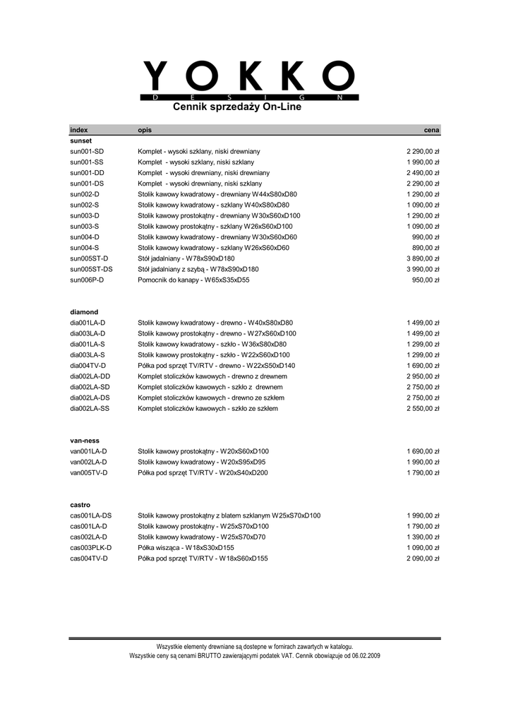 Cennik sprzedaży On-Line index opis cena sunset sun001-SD Komplet - wysoki szklany, niski drewniany 2 290,00 zł sun001-SS Komplet - wysoki szklany, niski szklany 1 990,00 zł sun001-DD Komplet - wysoki drewniany, niski drewniany 2 490,00 zł sun001-DS Komplet - wysoki drewniany, niski szklany 2 290,00 zł sun002-D Stolik kawowy kwadratowy - drewniany W44xS80xD80 1 290,00 zł sun002-S Stolik kawowy kwadratowy - szklany W40xS80xD80 1 090,00 zł sun003-D Stolik kawowy prostokątny - drewniany W30xS60xD100 1 290,00 zł sun003-S Stolik kawowy prostokątny - szklany W26xS60xD100 1 090,00 zł sun004-D Stolik kawowy kwadratowy - drewniany W30xS60xD60 990,00 zł sun004-S Stolik kawowy kwadratowy - szklany W26xS60xD60 890,00 zł sun005ST-D Stół jadalniany - W78xS90xD180 3 890,00 zł sun005ST-DS Stół jadalniany z szybą - W78xS90xD180 3 990,00 zł sun006P-D Pomocnik do kanapy - W65xS35xD55 950,00 zł diamond dia001LA-D Stolik kawowy kwadratowy - drewno - W40xS80xD80 1 499,00 zł dia003LA-D Stolik kawowy prostokątny - drewno - W27xS60xD100 1 499,00 zł dia001LA-S Stolik kawowy kwadratowy - szkło - W36xS80xD80 1 299,00 zł dia003LA-S Stolik kawowy prostokątny - szkło - W22xS60xD100 1 299,00 zł dia004TV-D Półka pod sprzęt TV/RTV - drewno - W22xS50xD140 1 690,00 zł dia002LA-DD Komplet stoliczków kawowych - drewno z drewnem 2 950,00 zł dia002LA-SD Komplet stoliczków kawowych - szkło z drewnem 2 750,00 zł dia002LA-DS Komplet stoliczków kawowych - drewno ze szkłem 2 750,00 zł dia002LA-SS Komplet stoliczków kawowych - szkło ze szkłem 2 550,00 zł van-ness van001LA-D Stolik kawowy prostokątny - W20xS60xD100 1 690,00 zł van002LA-D Stolik kawowy kwadratowy - W20xS95xD95 1 990,00 zł van005TV-D Półka pod sprzęt TV/RTV - W20xS40xD200 1 790,00 zł cas001LA-DS Stolik kawowy prostokątny z blatem szklanym W25xS70xD100 1 990,00 zł cas001LA-D Stolik kawowy prostokątny - W25xS70xD100 1 790,00 zł cas002LA-D Stolik kawowy kwadratowy - W25xS70xD70 1 390,00 zł cas003PLK-D Półka wisząca - W18xS30xD155 1 090,00 zł cas004TV-D Półka pod sprzęt TV/RTV - W18xS60xD155 2 090,00 zł castro Wszystkie elementy drewniane są dostepne w fornirach zawartych w katalogu. Wszystkie ceny są cenami BRUTTO zawierającymi podatek VAT. Cennik obowiązuje od 06.02.2009 Cennik sprzedaży On-Line index opis cena valencia val001LA-D Stolik kawowy kwadratowy - W29xS95xD95 1 690,00 zł val002LA-D Stolik kawowy prostokątny - W37xS60xD140 1 650,00 zł val017P-D Pomocnik do łóżka - W38xS30xD40 val005RTV-D Półka RTV - W28xS40xD160 699,00 zł 1 690,00 zł val006SZ-D "BOX" otwierany od góry - stojąca - W27xS35xD35 val007SZ-D "BOX" otwierany od góry - na kółkach - W35xS35xD35 950,00 zł val009ST-D Stół jadalniany - W78xS90xD160 2 890,00 zł val010LZK-Qs Łóżko podwójne "QueenSize" - S200xD220 (180x200) 3 800,00 zł val011LZK-Ss Łóżko pojedyncze - S110xD220 (90x200) 2 999,00 zł 999,00 zł valencia - zabudowa modularna val003TV-Sa Szafka - cokół stalowy - moduł A - W48xS60xD140 val012TV-Sb Szafka - cokół stalowy -moduł B - W48xS60xD115 3 290,00 zł 2 790,00 zł val013TV-Sc Szafka - cokół stalowyy -moduł C - W48xS60xD100 2 750,00 zł 3 190,00 zł val014TV-Sd Szuflady - cokół stalowy - moduł D - W30xS60xD140 val015TV-Se Szuflada - cokół stalowy - moduł E - W30xS60xD100 2 390,00 zł val003TV-Da Szafka - cokół drewniany - moduł A - W48xS60xD140 2 490,00 zł val012TV-Db Szafka - cokół drewniany -moduł B - W48xS60xD115 2 290,00 zł val013TV-Dc Szafka - cokół drewniany -moduł C - W48xS60xD100 2 250,00 zł val014TV-Dd Szuflady - cokół drewniany - moduł D - W30xS60xD140 2 490,00 zł val015TV-De Szuflada - cokół drewniany - moduł E - W30xS60xD100 1 990,00 zł opcja dodatkowa Druga szuflada przy modułach A i B 350,00 zł Ława prostokątna - W29xS60xD100 1 590,00 zł embarcadero emb001LA-D emb002LA-D Ława kwadratowa - W29xS90xD90 1 750,00 zł emb003ST-DD Stół jadalniany - blat dwuokleinowy - W78xS90xD160 2 990,00 zł emb004ST-D Stół jadalniany - blat jednookleinowy - W78xS90xD160 2 990,00 zł emb005TV-D Półka pod sprzęt TV/RTV W26xS40xD200 1 850,00 zł emb006P-D Pomocnik do stołu jadalnianego 50x50x50 1 299,00 zł Wszystkie elementy drewniane są dostepne w fornirach zawartych w katalogu. Wszystkie ceny są cenami BRUTTO zawierającymi podatek VAT. Cennik obowiązuje od 06.02.2009