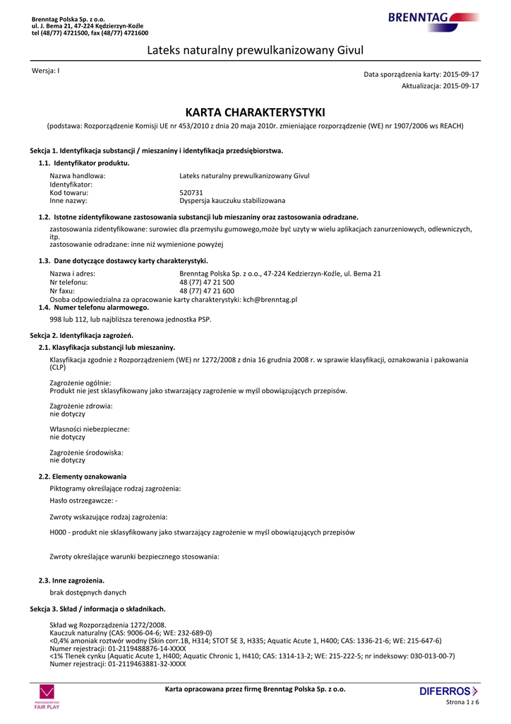 Brenntag Polska Sp. z o.o. ul. J. Bema 21, 47-224 Kędzierzyn-Koźle tel (48/77) 4721500, fax (48/77) 4721600 Lateks naturalny prewulkanizowany Givul Wersja: I Data sporządzenia karty: 2015-09-17 Aktualizacja: 2015-09-17 KARTA CHARAKTERYSTYKI (podstawa: Rozporządzenie Komisji UE nr 453/2010 z dnia 20 maja 2010r. zmieniające rozporządzenie (WE) nr 1907/2006 ws REACH) Sekcja 1. Identyfikacja substancji / mieszaniny i identyfikacja przedsiębiorstwa. 1.1. Identyfikator produktu. Nazwa handlowa: Identyfikator: Kod towaru: Inne nazwy: Lateks naturalny prewulkanizowany Givul 520731 Dyspersja kauczuku stabilizowana 1.2. Istotne zidentyfikowane zastosowania substancji lub mieszaniny oraz zastosowania odradzane. zastosowania zidentyfikowane: surowiec dla przemysłu gumowego,może być uzyty w wielu aplikacjach zanurzeniowych, odlewniczych, itp. zastosowanie odradzane: inne niż wymienione powyżej 1.3. Dane dotyczące dostawcy karty charakterystyki. Nazwa i adres: Brenntag Polska Sp. z o.o., 47-224 Kedzierzyn-Koźle, ul. Bema 21 Nr telefonu: 48 (77) 47 21 500 Nr faxu: 48 (77) 47 21 600 Osoba odpowiedzialna za opracowanie karty charakterystyki: [email protected] 1.4. Numer telefonu alarmowego. 998 lub 112, lub najbliższa terenowa jednostka PSP. Sekcja 2. Identyfikacja zagrożeń. 2.1. Klasyfikacja substancji lub mieszaniny. Klasyfikacja zgodnie z Rozporządzeniem (WE) nr 1272/2008 z dnia 16 grudnia 2008 r. w sprawie klasyfikacji, oznakowania i pakowania (CLP) Zagrożenie ogólnie: Produkt nie jest sklasyfikowany jako stwarzający zagrożenie w myśl obowiązujących przepisów. Zagrożenie zdrowia: nie dotyczy Własności niebezpieczne: nie dotyczy Zagrożenie środowiska: nie dotyczy 2.2. Elementy oznakowania Piktogramy określające rodzaj zagrożenia: Hasło ostrzegawcze: Zwroty wskazujące rodzaj zagrożenia: H000 - produkt nie sklasyfikowany jako stwarzający zagrożenie w myśl obowiązujących przepisów Zwroty określające warunki bezpiecznego stosowania: 2.3. Inne zagrożenia. brak dostępnych danych Sekcja 3. Skład / informacja o składnikach. Skład wg Rozporządzenia 1272/2008. Kauczuk naturalny (CAS: 9006-04-6; WE: 232-689-0) <0,4% amoniak roztwór wodny (Skin corr.1B, H314; STOT SE 3, H335; Aquatic Acute 1, H400; CAS: 1336-21-6; WE: 215-647-6) Numer rejestracji: 01-2119488876-14-XXXX <1% Tlenek cynku (Aquatic Acute 1, H400; Aquatic Chronic 1, H410; CAS: 1314-13-2; WE: 215-222-5; nr indeksowy: 030-013-00-7) Numer rejestracji: 01-2119463881-32-XXXX Karta opracowana przez firmę Brenntag Polska Sp. z o.o. Strona 1 z 6 Brenntag Polska Sp. z o.o. ul. J. Bema 21, 47-224 Kędzierzyn-Koźle tel (48/77) 4721500, fax (48/77) 4721600 Lateks naturalny prewulkanizowany Givul <1% bis(dibutyloditiokarbaminian) cynku (Eye irrit.2,H319; STOT SE 3, H335; Skin Irrit.2, H315; Skin Sens.1, H317; Aquatic Acute 1, H400; Aquate Chronic 1, H410; CAS: 136-23-2, WE: 205-232-8, nr indeksowy: 006-081-00-9) O ile wymienione są składniki niebezpieczne, znaczenie zwrotów H podane jest w p. 16 karty charakterystyki. Sekcja 4. Środki pierwszej pomocy. 4.1. Opis środków pierwszej pomocy. Wdychanie: W razie narażenia inhalacyjnego wyprowadzić poszkodowanego na świeże powietrze, zapewnić spokój. Kontakt ze skórą: Zdjąć zanieczyszczoną odzież i obuwie. W razie zanieczyszczenia skóry płukać wodą z mydłem. Kontakt z oczami: Usunąć soczewki kontaktowe (jeśli są noszone). W razie zanieczyszczenia oczu płukać dużą ilością wody, przytrzymując odchylone powieki. W przypadku objawów podrażnienia zapewnić pomoc lekarską. Spożycie: W razie spożycia przepłukać usta. Podać do wypicia dużą ilość wody. Niezwłocznie zapewnić pomoc medyczną. 4.2. Najważniejsze ostre i opóźnione objawy oraz skutki narażenia. brak dostępnych danych 4.3. Wskazania dotyczące wszelkiej natychmiastowej pomocy lekarskiej i szczególnego postępowania z poszkodowanym. brak dostępnych danych Sekcja 5. Postępowanie w przypadku pożaru. 5.1. Środki gaśnicze. Dwutlenek węgla, proszki gaśnicze, woda. Duże pożary gasić piana odporną na alkohol. 5.2. Szczególne zagrożenia związane z substancją lub mieszaniną. Produkty rozkładu termicznego/spalania zawierają tlenki azotu, tlenek i dwutlenek węgla. 5.3. Informacje dla straży pożarnej. Stosować niezależny aparat oddechowy oraz odzież ochronną Sekcja 6. Postępowanie w przypadku niezamierzonego uwolnienia do środowiska. 6.1. Indywidualne środki ostrożności, wyposażenie ochronne i procedury w sytuacjach awaryjnych. Stosować środki ochrony osobistej. Zapewnić odpowiednią wentylację. 6.2. Środki ostrożności w zakresie ochrony środowiska. Zapobiec rozprzestrzenianiu się lub dostaniu się do kanalizacji, rowów lub rzek używając piasku, ziemi lub innych odpowiednich barier. 6.3. Metody i materiały zapobiegające rozprzestrzenianiu się skażenia i służące do usuwania skażenia. Jeśli to możliwe zatrzymać wyciek. Rozlewy przysypać niepalnym materiałem chłonnym, zebrać do zamykanego pojemnika i przekazać do zniszczenia. 6.4. Odniesienia do innych sekcji. Informacje dotyczące odpowiedniego sprzętu ochrony osobistej podano w sekcji 8. Informacje dotyczące dodatkowej obróbki odpadów podano w sekcji 13. Sekcja 7. Postępowanie z substancjami i mieszaninami oraz ich magazynowanie. 7.1. Środki ostrożności dotyczące bezpiecznego postępowania. Unikać kontaktu ze skórą i oczami. Zapewnić odpowiednią wentylację. Może być konieczna wentylacja mechaniczna. Palenie, jedzenie i picie powinno być zabronione w miejscu stosowania. Myć ręce przed posiłkami i bezpośrednio po stosowaniu produktu. 7.2. Warunki bezpiecznego magazynowania, łącznie z informacjami dotyczącymi wszelkich wzajemnych niezgodności. Przechowywać w szczelnie zamkniętych oryginalnych opakowaniach w w chłodnym i suchym pomieszczeniu o dobrej wentylacji. Chronić przed mrozem. Zalecana temperatura przechowywania 5-35°C 7.3. Szczególne