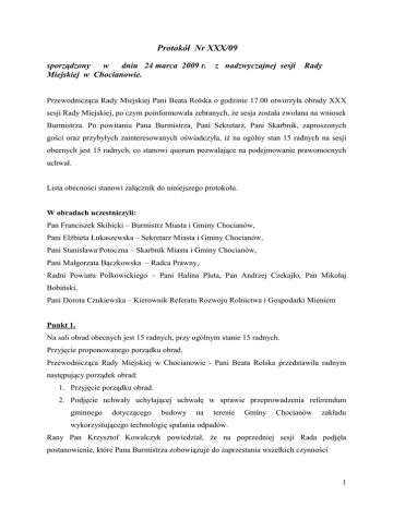 Protokół Nr XXX/09 sporządzony w dniu 24 marca 2009 r. Miejskiej w Chocianowie. z nadzwyczajnej sesji Rady Przewodnicząca Rady Miejskiej Pani Beata Rolska o godzinie 17.00 otworzyła obrady XXX sesji Rady Miejskiej, po czym poinformowała zebranych, że sesja została zwołana na wniosek Burmistrza. Po powitaniu Pana Burmistrza, Pani Sekretarz, Pani Skarbnik, zaproszonych gości oraz przybyłych zainteresowanych oświadczyła, iż na ogólny stan 15 radnych na sesji obecnych jest 15 radnych, co stanowi quorum pozwalające na podejmowanie prawomocnych uchwał. Lista obecności stanowi załącznik do niniejszego protokołu. W obradach uczestniczyli: Pan Franciszek Skibicki – Burmistrz Miasta i Gminy Chocianów, Pani Elżbieta Łukaszewska – Sekretarz Miasta i Gminy Chocianów, Pani Stanisława Potoczna – Skarbnik Miasta i Gminy Chocianów, Pani Małgorzata Bączkowska – Radca Prawny, Radni Powiatu Polkowickiego – Pani Halina Pluta, Pan Andrzej Czekajło, Pan Mikołaj Bobiński, Pani Dorota Czukiewska – Kierownik Referatu Rozwoju Rolnictwa i Gospodarki Mieniem Punkt 1. Na sali obrad obecnych jest 15 radnych, przy ogólnym stanie 15 radnych. Przyjęcie proponowanego porządku obrad. Przewodnicząca Rady Miejskiej w Chocianowie - Pani Beata Rolska przedstawiła radnym następujący porządek obrad: 1. Przyjęcie porządku obrad. 2. Podjęcie uchwały uchylającej uchwałę w sprawie przeprowadzenia referendum gminnego dotyczącego budowy na terenie Gminy Chocianów zakładu wykorzystującego technologię spalania odpadów. Rany Pan Krzysztof Kowalczyk powiedział, że na poprzedniej sesji Rada podjęła postanowienie, które Pana Burmistrza zobowiązuje do zaprzestania wszelkich czynności 1 i działań związanych z włączeniem się gminy w inwestycję powstania budowy na terenie gminy Chocianów zakładu wykorzystującego technologię spalania odpadów, do czasu rozstrzygnięcia wyników planowego referendum. Po czym dodał, że uważa że powinniśmy zaczekać na rozstrzygnięcie referendum i wówczas należy podejmować jakieś kroki, ponieważ to jest krok właśnie w tej sprawie – w sprawie budowy na terenie gminy zakładu wykorzystującego technologię spalania odpadów. Następnie dodał, że uważa tę sesję za nielegalną, wbrew prawomocnemu postanowieniu Rady, które Panu Burmistrzowi zakazała tego. Burmistrz Miasta i Gminy Chocianów Pan Franciszek Skibicki powiedział, że sesja została zwołana przez Panią Przewodniczącą w trybie ustawowym. Pani Małgorzata Bączkowska – Radca Prawny powiedziała, że można zwołać sesję Rady Miejskiej w tym temacie. Przystąpiono do głosowania nad zaproponowanym porządkiem obrad. Głosowanie: Za – 8 radnych, Przeciw – 5 radnych, Wstrzymało się – 2 radnych Porządek obrad został przyjęty. Punkt 2. Na sali obrad obecnych 15 radnych, przy ogólnym stanie 15 radnych. Podjęcie uchwały uchylającej uchwałę w sprawie przeprowadzenia referendum gminnego dotyczącego budowy na terenie Gminy Chocianów zakładu wykorzystującego technologię spalania odpadów. Burmistrz Miasta i Gminy Chocianów Pan Franciszek Skibicki zreferował uchwałę. Burmistrz Miasta i Gminy Chocianów Pan Franciszek Skibicki powiedział, że zasadniczą sprawą jest temat dotyczący budowy na terenie gminy Chocianów Zakładu Produkcji Energii Alternatywnej który rozpoczął się poprzez wniosek o wydanie decyzji środowiskowej – decyzji administracyjnej. Następnie wnioskodawca złożył wniosek o zamknięcie postępowania po czym temat został zamknięty poprzez wydanie decyzji umarzającej postępowanie w dniu 26 lutego 2009 r., decyzja jest ostateczna i tym samym nie ma żadnego 2 postępowania. W kwestii czy Rada ma wpływ na decyzje wydaną przez Burmistrza od tego są organy prawne. Po czym dodał, że dla Pana Burmistrza temat budowy zakładu jest zamknięty, w ramach postępowania był protest społeczny, wpłynęło ok. 1918 podpisów sprzeciwiających się budowie tegoż zakładu. Jeżeli kiedykolwiek Pan Burmistrz będzie miał wpływ na podejmowanie decyzji w sprawie budowy takiego zakładu zawsze będzie przeciwny budowie, gdyż taka jest wola mieszkańców gminy Chocianów wyrażona 1918 podpisami. W kwestii referendum w ocenie Pana Burmistrza nie ma znaczenia, ponieważ temat został zakończony. Kończąc swoją wypowiedź Pan Burmistrz powiedział, że wnioskuje o podjęcie uchwały uchylającej uchwałę w sprawie przeprowadzenia referendum gminnego dotyczącego budowy na terenie Gminy Chocianów zakładu wykorzystującego technologię spalania odpadów. Następnie Przewodnicząca Rady Miejskiej Pani Beata Rolska udzieliła głosu Radnemu Krzysztofowi Kowalczykowi, który powiedział, że sprawa nie zaczęła się od złożenia wniosku przez firmę Energy Technology, ale od zaktualizowania planu gospodarki odpadami Powiatu Polkowickiego opracowanego w maju 2008 r. gdzie na str. 84 jest napisane, że wskazane jest wspieranie inwestycji służących zagospodarowaniu różnych rodzajów odpadów. Inwestycjami takimi mogą być np. instalacja związana z produkcją energii w ramach odzysku lub unieszkodliwiania odpadów na terenie gminy Chocianów działka nr 1856. Więc od tego się zaczęło. Wiedział o tym Pan Burmistrz i Radni Powiatowi. Plan gospodarki odpadami został uchwalony przez Radę Powiatu w grudniu 2008 roku wiedzieli o tym wszyscy zainteresowani, natomiast nie wiedziała o tym rada i nie wiedziało o tym społeczeństwo. Po czym dodał, że na drugi dzień po sesji na której uchwalono referendum Pan Burmistrz złożył sprzeciw do Pana Wojewody z winsokiem o uchylenie tego, następnie poprosił Panią Przewodniczącą o odczytanie odpowiedzi Pana Wojewody na pismo, bo jeżeli nie to odczyta to radny. Burmistrz Miasta i Gminy Chocianów Pan Franciszek Skibicki powiedział, że to nie jest tematem porządku obrad. Radny Pan Krzysztof Kowalczyk powiedział, że wiąże się to z tematem, ponieważ Pan