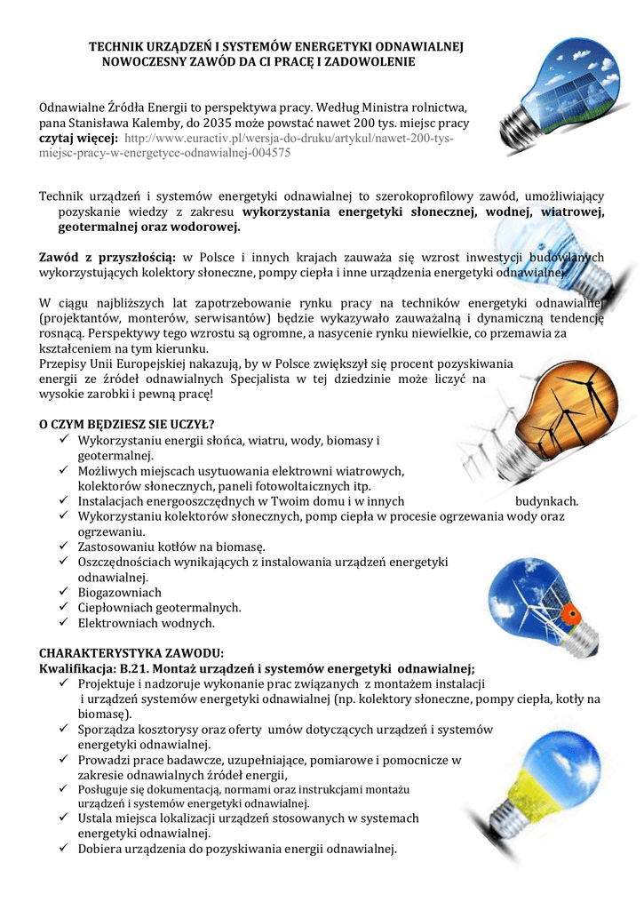 TECHNIK URZĄDZEŃ I SYSTEMÓW ENERGETYKI ODNAWIALNEJ NOWOCZESNY ZAWÓD DA CI PRACĘ I ZADOWOLENIE Odnawialne Źródła Energii to perspektywa pracy. Według Ministra rolnictwa, pana Stanisława Kalemby, do 2035 może powstać nawet 200 tys. miejsc pracy czytaj więcej: http://www.euractiv.pl/wersja-do-druku/artykul/nawet-200-tysmiejsc-pracy-w-energetyce-odnawialnej-004575 Technik urządzeń i systemów energetyki odnawialnej to szerokoprofilowy zawód, umożliwiający pozyskanie wiedzy z zakresu wykorzystania energetyki słonecznej, wodnej, wiatrowej, geotermalnej oraz wodorowej. Zawód z przyszłością: w Polsce i innych krajach zauważa się wzrost inwestycji budowlanych wykorzystujących kolektory słoneczne, pompy ciepła i inne urządzenia energetyki odnawialnej. W ciągu najbliższych lat zapotrzebowanie rynku pracy na techników energetyki odnawialnej (projektantów, monterów, serwisantów) będzie wykazywało zauważalną i dynamiczną tendencję rosnącą. Perspektywy tego wzrostu są ogromne, a nasycenie rynku niewielkie, co przemawia za kształceniem na tym kierunku. Przepisy Unii Europejskiej nakazują, by w Polsce zwiększył się procent pozyskiwania energii ze źródeł odnawialnych Specjalista w tej dziedzinie może liczyć na wysokie zarobki i pewną pracę! O CZYM BĘDZIESZ SIE UCZYŁ? Wykorzystaniu energii słońca, wiatru, wody, biomasy i geotermalnej. Możliwych miejscach usytuowania elektrowni wiatrowych, kolektorów słonecznych, paneli fotowoltaicznych itp. Instalacjach energooszczędnych w Twoim domu i w innych budynkach. Wykorzystaniu kolektorów słonecznych, pomp ciepła w procesie ogrzewania wody oraz ogrzewaniu. Zastosowaniu kotłów na biomasę. Oszczędnościach wynikających z instalowania urządzeń energetyki odnawialnej. Biogazowniach Ciepłowniach geotermalnych. Elektrowniach wodnych. CHARAKTERYSTYKA ZAWODU: Kwalifikacja: B.21. Montaż urządzeń i systemów energetyki odnawialnej; Projektuje i nadzoruje wykonanie prac związanych z montażem instalacji i urządzeń systemów energetyki odnawialnej (np. kolektory słoneczne, pompy ciepła, kotły na biomasę). Sporządza kosztorysy oraz oferty umów dotyczących urządzeń i systemów energetyki odnawialnej. Prowadzi prace badawcze, uzupełniające, pomiarowe i pomocnicze w zakresie odnawialnych źródeł energii, Posługuje się dokumentacją, normami oraz instrukcjami montażu urządzeń i systemów energetyki odnawialnej. Ustala miejsca lokalizacji urządzeń stosowanych w systemach energetyki odnawialnej. Dobiera urządzenia do pozyskiwania energii odnawialnej. Kwalifikacja B.22. Eksploatacja urządzeń i systemów energetyki odnawialnej. Monitoruje prace związane z montażem, demontażem, konserwacją oraz eksploatacją, Kontroluje prace urządzeń i systemów energetyki odnawialnej. instalacji wyposażonych w urządzenia do pozyskiwania energii odnawialnej: słonecznej, geotermalnej, wiatru, wody, biopaliw, wodoru. Ocenia stan techniczny systemów energetyki odnawialnej. Uruchamia urządzenia i systemy energetyki odnawialnej. Sporządza dokumentację dotyczącą eksploatacji urządzeń i systemów energetyki odnawialnej. Wykonuje pomiary i szkice inwentaryzacyjne urządzeń i systemów energetyki odnawialnej CYKL KSZYAŁCENIA: Nauka w technikum trwa 4 lata. Uczniowie mają prawo przystąpienia do egzaminu: maturalnego i egzaminu potwierdzającego kwalifikacje zawodowe: B.21. Montaż urządzeń i systemów energetyki odnawialnej; B.22. Eksploatacja urządzeń i systemów energetyki odnawialnej. Po zdaniu kwalifikacji otrzymują dyplom potwierdzający kwalifikacje zawodowe, suplement do dyplomu potwierdzający kwalifikacje zawodowe – EUROPASS Po ukończeniu szkoły Absolwenci mogą podjąć studia związane z energetyką odnawialną, energetyką, ochroną środowiska. KWALIFIKACJE ABSOLWENTA: Absolwent – technik urządzeń i systemów energetyki odnawialnej – nabędzie kwalifikacje i umiejętności: wykonywania montażu i konserwacji urządzeń i systemów energetyki odnawialnej, eksploatacji i konserwacji urządzeń i systemów energetyki odnawialnej, monitorowania i nadzoru systemów energetyki odnawialnej, wykorzystania programów komputerowych wspomagających proces związanych systemami energii odnawialnej, sporządzania kosztorysów oraz ofert przetargowych i umów dotyczących urządzeń i systemów energetyki odnawialnej. KARIERA ZAWODOWA Firmy i przedsiębiorstwa zajmujące sie instalacją i produkcją kolektorów słonecznych, pomp ciepła ogniw fotowoltaicznych, pieców na biomasę i urządzeń technicznych energii odnawialnej. Biura projektowe zajmujące się energetyką odnawialną. Serwisy obsługi urządzeń energetyki odnawialnej, Zakłady wytwarzające, przetwarzające i przesyłające energię elektryczną, Elektrownie, organizacje i instytucje zajmujące się energetyką odnawialną. Centra ekologiczne systemów grzewczych, Własna działalności usługową, montując instalacje słoneczne, pompy ciepła i kotły na biomasę. Grafika: www.biogspot.com, www.termoistal.pl, www.elektroonline.pl, www.globenenergia.pl