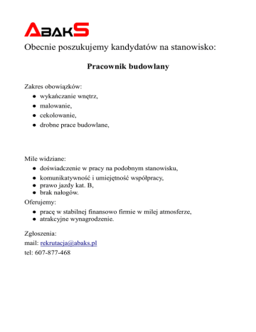 Obecnie poszukujemy kandydatów na stanowisko: Pracownik budowlany Zakres obowiązków: ● wykańczanie wnętrz, ● malowanie, ● cekolowanie, ● drobne prace budowlane, Mile widziane: ● doświadczenie w pracy na podobnym stanowisku, ● komunikatywność i umiejętność współpracy, ● prawo jazdy kat. B, ● brak nałogów. Oferujemy: ● pracę w stabilnej finansowo firmie w milej atmosferze, ● atrakcyjne wynagrodzenie. Zgłoszenia: mail: [email protected] tel: 607-877-468