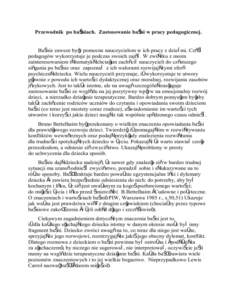 Przewodnik po baśniach. Zastosowanie baśni w pracy pedagogicznej. Baśnie zawsze były pomocne nauczycielom w ich pracy z dziećmi. Część pedagogów wykorzystuje je podczas swoich zajęć. W związku z moim zainteresowaniem tą tematyką chciałam zachęcić nauczycieli do częstszego sięgania po baśnie oraz zapoznać z ich walorami rozwijającymi sferę psychiczną dziecka. Wielu nauczycieli przyznaje, iż wykorzystuje te utwory głównie z powodu ich wartości dydaktycznej oraz moralnej, rozwijania zasobów językowych. Jest to także istotne, ale na uwagę szczególną zasługuje zastosowanie baśni ze względu na jej pozytywny wpływ na emocjonalny rozwój dzieci, a nierzadko działanie terapeutyczne. Bardzo dobrym pomysłem byłoby także zachęcenie rodziców uczniów do czytania i opowiadania swoim dzieciom baśni (co teraz jest niestety coraz rzadsze), uświadomienie im wartości tych utworów i korzyści jakie dzieci mogą z tak wspólnie spędzonego czasu odnieść. Bruno Bettelhaim był przekonany o wielkim znaczeniu opowiadania baśni dla prawidłowego rozwoju dzieci. Twierdził, iż pomagają im w rozwiązywaniu konfliktów wewnętrznych oraz podają przykłady znalezienia rozwiązania dla trudności spotykających dziecko w życiu. Pokazują, że warto stawiać czoło przeszkodom, a odniesie się zwycięstwo. Ukazują problemy w prosty do uchwycenia dla dziecka sposób. Baśnie dają dziecku nadzieję, że nawet gdy znalazło się w bardzo trudnej sytuacji ma szansę odnieść zwycięstwo, poradzić sobie i są ukazywane na to różne sposoby. Baśń traktuje bardzo poważnie egzystencjalne lęki i dylematy dziecka „i zawiera bezpośrednie odniesienia do nich: do potrzeby, aby być kochanym i lęku, że się jest uważanym za kogoś pozbawionego wartości; do miłości życia i lęku przed śmiercią” ( B.Bettelhaim „Cudowne i pożyteczne. O znaczeniach i wartościach baśni” PIW, Warszawa 1985 r., s.50,51) Ukazuje jak ważna jest prawdziwa więź z drugim człowiekiem (chociażby przez typowe baśniowe zakończenia „i żyli odtąd długo i szczęśliwie”). Ciekawym zagadnieniem dotyczącym znaczenia baśni jest to, iż dla każdego słuchającego dziecka istotny w danym okresie może być inny fragment baśni. Dziecko zwróci uwagę na to, co teraz dla niego jest ważne, sprzyjające jego rozwojowi, rozstrzygające jakiś jego obecny dylemat, konflikt. Dlatego rozmowa z dzieckiem o baśni powinna być ostrożna i „podążająca za słuchaczem”, by niczego nie sugerować, nie interpretować, oczywiście jeśli mamy na względzie terapeutyczne działanie baśni. Każda baśń zawiera wiele poziomów znaczeniowych i to jej wielkie bogactwo. Nieprzypadkowo Lewis Carrol nazwał baśń „darem miłości”. Dzieci przeżywają wiele nieświadomych napięć wewnętrznych, a baśniowe opowieści pomagają im je przetworzyć wyzwalająco w sferze fantazji. Poza tym „(...) baśnie pomagają dziecku wierzyć, że jego niewielkie osiągnięcia mają dużą wagę, choć ono samo może tego jeszcze nie dostrzegać.”(tamże, s. 148,149) Baśniowy bohater zawsze otrzymuje potrzebną pomoc, a jego długie wysiłki zostają wynagrodzone. Próby i cierpienia prowadzą do dojrzałości wewnętrznej. Bettelhaim podkreśla, iż „(...) baśnie przydadzą wartości doniosłym przeżyciom dziecka, pomogą mu rozumieć siebie, wzmocnią nadzieję, osłabią lęki, a przez to zarówno w danym momencie, jak w perspektywie lat wzbogacą jego życie”(tamże, s.283). Dzieci pojmują treść baśni intuicyjnie i przyswajając je lepiej rozumieją własne doświadczenia emocjonalne. Mogą „przepracować” różne wewnętrzne konflikty, gdyż baśń oprócz działania bezpośredniego, odkrytego dla dziecka, oddziałuje także w sposób ukryty, docierając do podświadomości. W swojej pracy z uczniami z cechami zahamowania emocjonalnego opierałam się szczególnie na tradycyjnych baśniach wierząc w ich leczące działanie. Jednak pomocne mi były także współczesne bajki terapeutyczne i zachęcam również do sięgnięcia po nie, gdy pojawia się konkretny problem w życiu dziecka. Mogą one pomóc obniżać napięcie, radzić sobie z lękiem, motywują do działania i dokonania zmian, dostarczają wzorów osobowych. Mogą także wspierać dziecko w budowaniu zasobów osobistych, działać relaksująco. Bajki terapeutyczne można podzielić na: relaksacyjne, psychoedukacyjne oraz psychoterapeutyczne. Bajki relaksacyjne służą uspokojeniu, odprężeniu się dziecka i posługujemy się wtedy wizualizacją (czyli obrazowaniem wewnętrznym).Bajka taka powinna trwać od 3 do 7 minut. Osoba opowiadająca (sama odprężona) mówi cichym, spokojnym głosem, uwzględniając trzy struktury: słuchową (np. szum drzew), wzrokową (np. latające motyle) i czuciową (np. ciepło promieni słonecznych). Dziecko słuchając wyobraża sobie treść bajki. Bajki psychoedukacyjne mają pomóc dziecku znajdującemu się w trudnej dla niego sytuacji, ale mogą działać profilaktycznie. Bohater ma podobny do dziecka problem. W bajce tej są przedstawione emocje w konkretnej sytuacji, więc dziecko uczy się je rozpoznawać i nazywać. Pokazane są także wzory strategii zachowań pomocnych w poradzeniu sobie. W bajce takiej znajdują się metafory, symbole znane dziecku, zachowania jednak są propozycjami, nie powinny być narzucane. Są raczej krótkie, mogą dotyczyć np. lęku dziecka przed ciemnością, bałaganienia, trudności w nauce. Po ich przeczytaniu warto zachęcić uczniów do uzewnętrznienia emocji poprzez narysowanie ilustracji, rozmowę o uczuciach bohaterów. Dzieci mogą, jeśli chcą, opowiedzieć o swoich doświadczeniach. Najlepiej nie interpretować takiej bajki, a pozwolić na to dzieciom, wtedy opowieść zyska dla nich osobistą wartość. Bajki psychoterapeutyczne mają bardziej rozbudowaną fabułę. Inspiracją do ich tworzenia były baśnie. Uzupełniane 