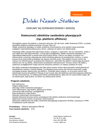 Szkolenia DZIELIMY SIĘ DOŚWIADCZENIEM I WIEDZĄ Stateczność obiektów swobodnie pływających (np. platform offshore) Szczególnie ważna dla statków o niedużym stosunku L/B, jak kutry, statki dostawcze (PSV), a przede wszystkim platformy półzanurzeniowe czy typu "jack up". Statek swobodnie pływający to statek wzdłużnie zrównoważony przy każdym kącie przechyłu względem odpowiedniej płaszczyzny obrotu, zależnej od wyboru osi referencyjnej. Orientację statku opisują dwa kąty Eulera (trzeci, związany z azymutem, nie ma znaczenia). Jeden z tych kątów gra rolę kąta przechyłu, a drugi kąta przegłębienia. Statek swobodnie pływający ma najmniejszą stateczność w sensie pola pod krzywą ramion. Pole to nie zależy od wyboru osi referencyjnej, przechyły odbywają się wokół chwilowej głównej osi bezwładności wodnicy, a same krzywe są ze sobą ściśle powiązane wg zasady równości pracy. Dla statków krzywe ramion dla różnych osi referencyjnych są praktycznie identyczne, natomiast dla platform zaznaczają się pewne różnice lecz nie są wielkie, zilustrowane przykładami obliczeniowymi. Krzywe ramion dla statku z ustalonym przegłębieniem mają znacznie zawyżone wartości, po wejściu pokładu do wody. Dla statku swobodnie pływającego jest tylko jedna krzywa ramion dla przechyłów wokół głównej osi bezwładności wodnicy. Inaczej mówiąc, nie istnieją krzywe ramion dla różnych azymutów, czego wymagają przepisy stateczności dla platform. Powstaje zatem pytanie, co za krzywe ramion były dotychczas liczone dla platform? Muszą to być krzywe albo dla platformy niezrównoważonej wzdłużnie lub źle równoważonej. To ostatnie jest bardzo prawdopodobne, gdyż nikt nie używa takich pojęć, jak oś referencyjna, kąty Eulera, oś obrotu czy płaszczyzna obrotu. Program szkolenia: Rys historyczny Pojęcie stateczności Dlaczego obiekt swobodnie pływający? Osie referencyjne, kąty Eulera, płaszczyzny obrotu Znaczenie kąta przechyłu i przegłębienia Kąty analityczne a kąty Eulera Sposoby wzdłużnego równoważenia Zasada obliczania krzywej ramion prostujących dla obiektu wzdłużnie zrównoważonego Zależność krzywej ramion od sposobu równoważenia Obliczanie stateczności dla statku swobodnie pływającego programem WinSea, używanym w PRS Przykładowe wyniki obliczeń Prowadzący: Główny Specjalista PRS SA Czas trwania szkolenia: 2,5h Kontakt: Anna Stajewska Koordynator szkoleń Pion Naukowo Badawczy Polski Rejestr Statków SA Tel: 58 75 11 383 Kom: 601 650 409 e-mail: [email protected]