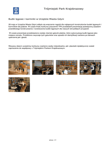Trójmiejski Park Krajobrazowy Budki lęgowe i karmniki w Urzędzie Miasta Gdyni 28 maja w Urzędzie Miasta Gdyni odbyło się wręczenie nagród dla najlepszych konstruktorów budek lęgowych i karmników dla ptaków. W czasie finału konkursu pracownik TPK przedstawił prezentację poświęconą zasadom prawidłowego konstruowania i rozwieszania budek lęgowych dla naszych skrzydlatych przyjaciół. W czasie prezentacji przedstawione zostały również gatunki ptaków, które wykorzystują budki lęgowe jako miejsce rozrodu. Przybliżono zwyczaje tych gatunków oraz sposób ich identyfikacji zarówno po barwach upierzenia jak i głosie. Wszyscy obecni uczestnicy konkursu (zarówno osoby indywidualne, jak i placówki dydaktyczne) zostali zaproszenie do współpracy z Trójmiejskim Parkiem Krajobrazowym. strona 1/1 Powered by TCPDF (www.tcpdf.org)