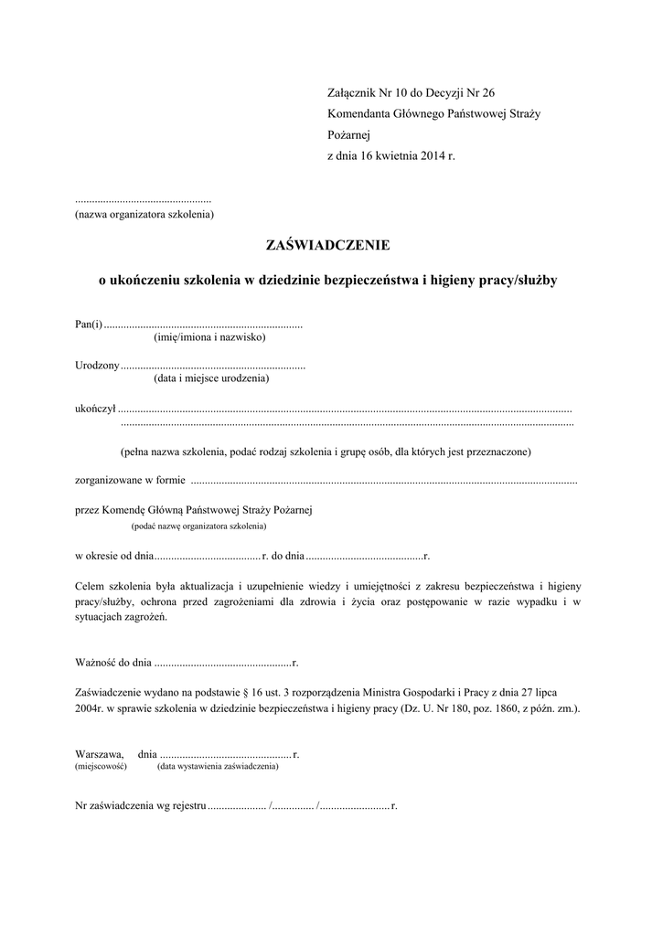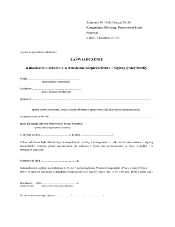 Załącznik Nr 10 do Decyzji Nr 26 Komendanta Głównego Państwowej Straży Pożarnej z dnia 16 kwietnia 2014 r. ................................................. (nazwa organizatora szkolenia) ZAŚWIADCZENIE o ukończeniu szkolenia w dziedzinie bezpieczeństwa i higieny pracy/służby Pan(i) ....................................................................... (imię/imiona i nazwisko) Urodzony .................................................................. (data i miejsce urodzenia) ukończył .................................................................................................................................................................. ................................................................................................................................................................... (pełna nazwa szkolenia, podać rodzaj szkolenia i grupę osób, dla których jest przeznaczone) zorganizowane w formie .......................................................................................................................................... przez Komendę Główną Państwowej Straży Pożarnej (podać nazwę organizatora szkolenia) w okresie od dnia ...................................... r. do dnia ..........................................r. Celem szkolenia była aktualizacja i uzupełnienie wiedzy i umiejętności z zakresu bezpieczeństwa i higieny pracy/służby, ochrona przed zagrożeniami dla zdrowia i życia oraz postępowanie w razie wypadku i w sytuacjach zagrożeń. Ważność do dnia ................................................. r. Zaświadczenie wydano na podstawie § 16 ust. 3 rozporządzenia Ministra Gospodarki i Pracy z dnia 27 lipca 2004r. w sprawie szkolenia w dziedzinie bezpieczeństwa i higieny pracy (Dz. U. Nr 180, poz. 1860, z późn. zm.). Warszawa, dnia ............................................... r. (miejscowość) (data wystawienia zaświadczenia) Nr zaświadczenia wg rejestru ..................... /............... / ......................... r. (pieczęć i podpis osoby upoważnionej przez organizatora) Tematyka szkolenia Lp. Tematyka szkolenia 1. 2. 3. 4 4. 5. 6. 7. 8. 9. 10. 11. 12. 13. 14. Razem: 1 godzina lekcyjna = 45 minut Liczba godzin zajęć teoretycznych (wykładów) Liczba godzin zajęć praktycznych (ćwiczeń)