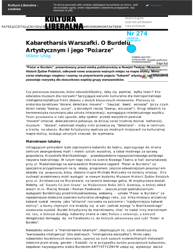 Ta strona gromadzi pliki cookies ułatwiające korzystanie ze strony. Jeśli nie wyrażasz zgody, zmień odpowiednio ustawienia przeglądarki, aby blokować te pliki. Kultura Liberalna cookies Continue PATRZĄCCZYTAJĄCSŁYSZĄCSMAKUJĄCFELIETONY O NASARCHIWUMKONTAKTNEWSLETTER Nr 274 Z centrum widać najwięcej (16/2014) 08.04.2014 Kabaretharsis Warszafki. O Burdelu Artystycznym i jego "Pożarze" Wiktor Uhlig POBIERZ JAKO PDF / WYŚLIJ E-MAIL Projekt graficzny: POWIADOM MAILEM Edgar Bąk "Pożar w Burdelu", prezentowany przed wielką publicznością w Nowym Teatrze i Muzeum Partner technologiczny: Historii Żydów Polskich, odkrywał nowe znaczenia ważnych miejsc na mapie stolicy. Mimo coraz większego rozgłosu i szansy na przywrócenie pojęciu "kabaret" artystycznego znaczenia pozostaje rozrywką dla stosunkowo wąskiej grupy warszawiaków. Czy pierwszym miejscem, które odwiedzilibyśm y , żeby się pośmiać, byłby teatr? Kto odwiedza muzeum dla rozrywki? Sprzyjające warunki kulturalne dla metropolitalnego inteligenta kształtuje front złożony z dwóch klasycznych elementów. Pierwszy to oratorska dyrektywa "docere, delectare, movere" - "nauczać, bawić, wzruszać" (przy czym dzieci należy "bawiąc, uczyć" , a dorosłych raczej "bawiąc, wzruszać" ) . Drugi składnik to hermeneutyka rozumiana jako sztuka interpretacji, wymagająca intelektualnego wysiłk u . Teatr przemawia w taki sposób, żeby spełnić przede wszystkim postulat "movere" (chociaż doświadczenie pokazuje, że dzisiaj coraz trudniej doznać katharsis), muzeum - "docere", natomiast między nimi przewija się "delectare" - niby w centrum, a trochę na uboczu. Burdel Artystyczny wędruje po modnych miejscach na kulturalnej mapie stolicy, szukając ukrytych znaczeń do wyśmiania. Mainstream lokalny Intrygującym pomysłe m b yło zaproszenie kabaretu do teatru, aspirującego do miana centrum awangardowej myśli i mekki sztuki wysokiej, a także modnego za sprawą gospodarza, Krzysztofa Warlikowskiego - prawdopodobnie najpopularniejszego polskiego reżysera teatralnego. W lutym tego roku na scenie Nowego Teatru w hali warsztatowej przy ul. Madalińskiego na warszawskim Mokotowie zagościł "Poża r w B u r d e l u " z e specjalnie przygotowanym na tę okazję programem. Jeszcze odważniejszym posunięc i e m okazała s ię propozycja, którą złożono trupie Michała Walczaka na kolejny miesiąc . O t o zuchwali prześmiewcy mieli wystąpić w nowym budynku Muzeum Historii Żydów Polskich przy ul. Anielewicza na Muranowie, na terenie dawnego getta. W międzyczasie dostali Wdechę od "Gazety Co Jest Grane" za Wydarzenie Roku 2013. Komisja, w której skła d weszli m.in. Maciej Nowak i Roman Pawłowski - jeszcze przed spektakularnymi występami Burdeltrupy przed kilkusetosobową widownią - uznała "Poża r w B u r d e l u " z a najważniejsze stołeczne zjawisko kulturalne ubiegłego roku. Już kilka miesięcy wcześn i e j kabaret zyskał renomę jako "elitarna" rozrywka na poziomie i "najsłynniejszy kabaret stolicy", a tłumy chętnych nie mieściły s ię w sali. Jednak występ "u Warlikowskiego" ostatecznie wyniósł Burdel Artystyczny do mainstreamu, choć to nadal inny mainstream niż ten, w którym działają kabarety znane w całej Polsce z telewizji, a których delegalizacji domagają się na Facebooku ci, do których adresowany jest cykl "Poża r w Burdelu". Należałoby mówić o "mainstreamie lokalnym", obejmującym to, czym delektuje się "warszawska inteligencja" (dla złośliwych: "inteligencka warszafka"). Mimo całe j rubaszności burdelowych dowcipów, opartej na tych samych wyświechtanych motywach (obecnie prym wiodą gender i Kościół) co w przypadku żartów przeciętnych kabaretów, zespołowi nazywającemu siebie Burdelem ARTYSTYCZNYM udaje się wytworzyć wśr ó d widzów poczucie, że obcują ze sztuką. Przyczynia się do tego idea powrotu do korzeni. Scenki, zwane "numerkami", odgrywają zawodowi, dobrze śpiewając y a k t o r z y z warszawskich teatrów. Teksty piszą: Michał Walczak, autor dramatów nagradzanych na festiwalach i wystawianych m.in. w Teatrze Narodowym (oprócz tego zawodowy reżyser), oraz Maciej "Max" Łubieński, dziennikarz, varsavianista i muzyk. Sił ą kolejnych odcinków są liczne, skomponowane przez Wiktora Stokowskiego piosenki, a nic nie dodaje przedstawieniu energii tak jak żywy multiinstrumentalny band. Profesjonalizm - t o wywołuje zwilżo n e łezką z o k a skojarzenia z legendami polskiego kabaretu, takimi jak Dudek czy STS. Tymczasem korzenie, do których sięga Burdeltrupa, dotykają samej skały macierzystej, jaką jest pierwszy w historii kabaret, paryski Chat Noir. Pośrodku rozległej sceny stoi okrągły podest. Za okalającą go bordową zasłoną kryje się miniświat perwersyjnej bohemy, bawiącej się pod francuskojęzycznym szyldem "Le Bordel Artistique". Odsłonięcie kurtyny zapowiada, że za moment historia miejsca, w którym właśnie rozłożył się burdel, zacznie współżyć z n a jświeższą teraźniejszością. Swojskie chwalicie Po opuszczeniu Klubu Komediowego Chłodna 25 Burdel Artystyczny postanowił ruszyć w miasto z misją opowiadania o Warszawie. Żeby nie zamykać się w " słoikach" ani śmianiu wyłącznie z aktualności, które między pierwszą próbą a ostatnim pokazem mogą się zdezaktualizować, postanowili dotkną ć niezmiennie bolesnej historii miasta. I tak, w barze Studio, mieszczącym się pod adresem plac Defilad 1, zagrali "socrealistyczną rock operę o P ałacu Kultury", Duchu Stalina i radzieckich robotnikach. Na początku sierpnia ubiegłego roku zaryzykowali z powstaniem warszawskim, co okazało s ię sukcesem. W Nowym Teatrze misji stało s ię zadość, kiedy to przybliży l i warszawiakom historię mniej znaną - dzieje Mokotowa od Teatru Nowego do Nowego Teatru. "Docere, delectare, movere" par excellence! W u b i e głym wieku nieopodal, przy Puławskiej, działał Teatr Nowy, kt