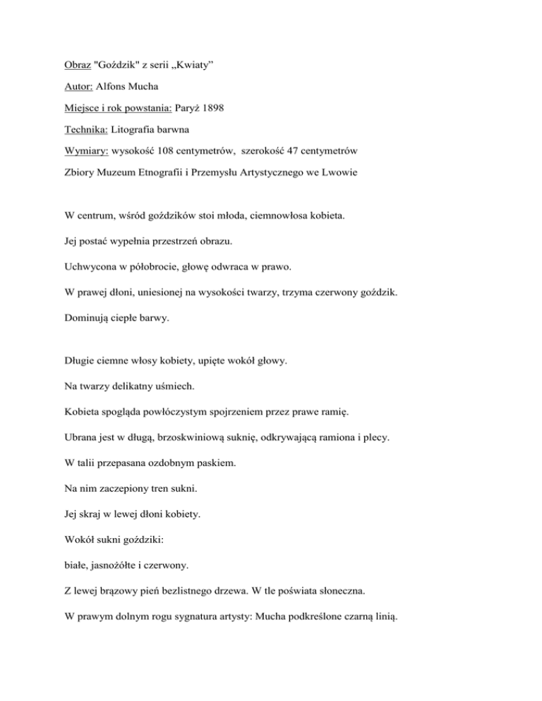 Obraz "Goździk" z serii „Kwiaty” Autor: Alfons Mucha Miejsce i rok powstania: Paryż 1898 Technika: Litografia barwna Wymiary: wysokość 108 centymetrów, szerokość 47 centymetrów Zbiory Muzeum Etnografii i Przemysłu Artystycznego we Lwowie W centrum, wśród goździków stoi młoda, ciemnowłosa kobieta. Jej postać wypełnia przestrzeń obrazu. Uchwycona w półobrocie, głowę odwraca w prawo. W prawej dłoni, uniesionej na wysokości twarzy, trzyma czerwony goździk. Dominują ciepłe barwy. Długie ciemne włosy kobiety, upięte wokół głowy. Na twarzy delikatny uśmiech. Kobieta spogląda powłóczystym spojrzeniem przez prawe ramię. Ubrana jest w długą, brzoskwiniową suknię, odkrywającą ramiona i plecy. W talii przepasana ozdobnym paskiem. Na nim zaczepiony tren sukni. Jej skraj w lewej dłoni kobiety. Wokół sukni goździki: białe, jasnożółte i czerwony. Z lewej brązowy pień bezlistnego drzewa. W tle poświata słoneczna. W prawym dolnym rogu sygnatura artysty: Mucha podkreślone czarną linią. Znakiem rozpoznawczym Muchy są grafiki kobiet w stylu belle epoque. Jeden z czołowych przedstawicieli secesji. Twórczość i filozofia Muchy opiera się na przekonaniu, że powinna ona służyć upiększaniu życia człowieka. Sztuka ma być kierowana do przeciętnego człowieka. Kobieta Muchy jest pełna witalności, piękna i optymizmu. Czerwony goździk symbolizuje – podziw, pociąg seksualny, biały – niewinność i kobiecość. Żółty symbolizuje pogardę i ironię.