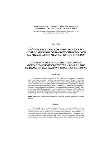 Główne kierunki rozwoju… INFRASTRUKTURA I EKOLOGIA TERENÓW WIEJSKICH INFRASTRUCTURE AND EKOLOGY OF RURAL AREAS Nr 2/2007, POLSKA AKADEMIA NAUK, Oddział w Krakowie, s. 51–60 Komisja Technicznej Infrastruktury Wsi Ewa Pałka GŁÓWNE KIERUNKI ROZWOJU SPOŁECZNO-GOSPODARCZEGO OBSZARÓW CHRONIONYCH NA PRZYKŁADZIE MIASTA I GMINY CHĘCINY ____________ THE MAIN COURSES OF SOCIO-ECONOMIC DEVELOPMENT OF PROTECTED AREAS BY THE EXAMPLE OF THE CHĘCINY TOWN AND COMMUNE Streszczenie Podstawowym celem opracowania jest próba oceny wybranych elementów środowiska przyrodniczego i społeczno-gospodarczego gminy Chęciny oraz wskazanie głównych kierunków rozwoju społeczno-gospodarczego badanego obszaru. Gmina zaliczana jest w województwie świętokrzyskim do obszarów o najsłabszych warunkach przyrodniczych rozwoju rolnictwa, a jednocześnie charakteryzuje się wysokim stopniem urbanizacji i uprzemysłowienia. Gminę Chęciny można traktować jako obszar modelowy, ponieważ jej powierzchnia w 85% należy do Chęcińsko-Kieleckiego Parku Krajobrazowego oraz jego otuliny. Zatem jej rozwój gospodarczy winien być podporządkowany wymogom środowiskowym. Słowa kluczowe: środowisko geograficzne, rozwój terenów wiejskich, kierunki rozwoju Summary The article shows a characteristic of nature-economic conditions in the Chęciny commune. The author attempts to describe the main non-agricultural sectors and their role in farther socio-economic development of the commune. The undertaken analysis proves, that the area in multi-functionality. This paper presents some important actual problems that restain the socio-economic development of the Chęciny town and commune. It has proved that rural areas are strongly 51 Ewa Pałka diverse as regards both conditions and disproportions in social-economic development. The natural and landscape conditions of this region are propitious to development of some forms of rural enterprises. The possibilities of rural areas multifunctional development are connected with using the geographical environment terms and favourable location and also human work resources. Creating the new places of work out of agriculture is an important factor of agriculture restructuring and modernization. The main aim of this paper was also to describe the current stage and the main factors effecting the social-economical development of Chęciny commune. The development of agrotourism and tourism could be an alternative form of activities for rural areas, not only in Chęciny commune. At present the development of agrotourism and tourism is one of the most popular ways of economical restructurisation. The development of this activity brings some incomes and possibilities of getting other profits of social and economical character. There is a big potential for the development of touristic and recreation sectors because of attractive nature, goods touristic base and other factors. WSTĘP Obiektem badań jest gmina Chęciny położona w środkowej części województwa świętokrzyskiego w odległości 14 km od Kielc. Ogólnie gmina i miasto Chęciny zajmują obszar 127,28 km2, co stanowi 1,3% powierzchni województwa świętokrzyskiego. Badana gmina zaliczana jest w województwie do obszarów o najsłabszych warunkach rozwoju rolnictwa, a jednocześnie charakteryzuje się wysokim stopniem urbanizacji i uprzemysłowienia. Rozwój rolnictwa determinują wymogi ochrony środowiska określone w planie ochrony Chęcińsko-Kieleckiego Parku Krajobrazowego. Ponadto gmina Chęciny posiada wysokie walory przyrodniczo-krajobrazowe objęte prawną ochroną przyrody ożywionej i nieożywionej. Korzystne warunki środowiska przyrodniczego, kulturowego, położenie i dostępność komunikacyjna to podstawowe elementy sprzyjające uaktywnieniu gminy jako ośrodka turystyczno-wypoczynkowego w skali województwa [Pałka 2003]. Pierwsze informacje o tym terenie pochodzą z przełomu XII i XIII wieku. Najwięcej źródeł historycznych dotyczy miasta Chęciny, wiodącego ośrodka osadniczego na tym terenie. Pozostały obszar gminy, charakteryzowany jako tereny rolnicze i górnicze, wraz z wioskami wchodził w skład chęcińskiego starostwa grodowego. Ludność zajmowała się bartnictwem, rolnictwem, hutnictwem metali kolorowych. Kwitło rzemiosło i handel. Gmina Chęciny znana była już Piastom dzięki rudom miedzi, srebra, ołowiu oraz wapieniom chęcińskim nazywanym marmurami. Na przestrzeni XIV–XVII wieku dobrze rozwinęło się tu górnictwo. Okoliczne kamieniołomy dostarczały „marmuru” na budowę nagrobków i dekoracji kościelnych [Kosik 1996]. Miasto, które kiedyś spełniało funkcję starostwa grodowego, następnie powiatu 52 Główne kierunki rozwoju… województwa sandomierskiego, a także było centrum przemysłowym regionu, obecnie jest miastem turystycznym, zaś tereny wiejskie są bogate w osobliwości geologiczne, przyrodnicze i archeologiczne. Gmina Chęciny znana jest ze swych walorów historycznych i geograficznych w całym kraju [Kosik 1996]. Opracowanie stanowi próbę oceny wybranych elementów środowiska przyrodniczego i społeczno-gospodarczego miasta i gminy Chęciny oraz wskazania głównych kierunków rozwoju społeczno-gospodarczego. ŚRODOWISKO PRZYRODNICZE GMINY CHĘCINY Pod względem fizyczno-geograficznym badany obszar należy do subregionu chęcińskiego. Jego wyodrębnienie wynika z charakterystycznego układu litologicznego skał budujących ten obszar. W orografii terenu gminy zaznaczają się podłużne pasma równoległych wzgórz określane mianem skib, grzyw lub grząb. Ten charakterystyczny układ wapiennych grzbietów, ciągnących się na przestrzeni kilometrów, przyczynił się do określenia tutejszego krajobrazu jako skibowego, a do okolicznych wzgórz na stałe przyległy nazwy typu „grzywy bolmińskie”, czy „grzywy korzeckowskie”. Gminę Chęciny można traktować jako obszar modelowy do badań terenów chronionych, ponieważ jej p