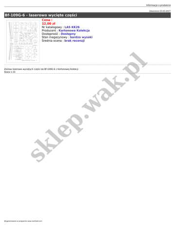 Informacje o produkcie Utworzono 03-03-2017 Bf-109G-6 - laserowo wycięte części Cena : 12,00 zł sk le p. w ak . Zestaw laserowo wyciętych części do Bf-109G-6 z Kartonowej Kolekcji Skala 1:33 pl Nr katalogowy : LAS KK26 Producent : Kartonowa Kolekcja Dostępność : Dostępny Stan magazynowy : bardzo wysoki Średnia ocena : brak recenzji Wygenerowano w programie www.oscGold.com