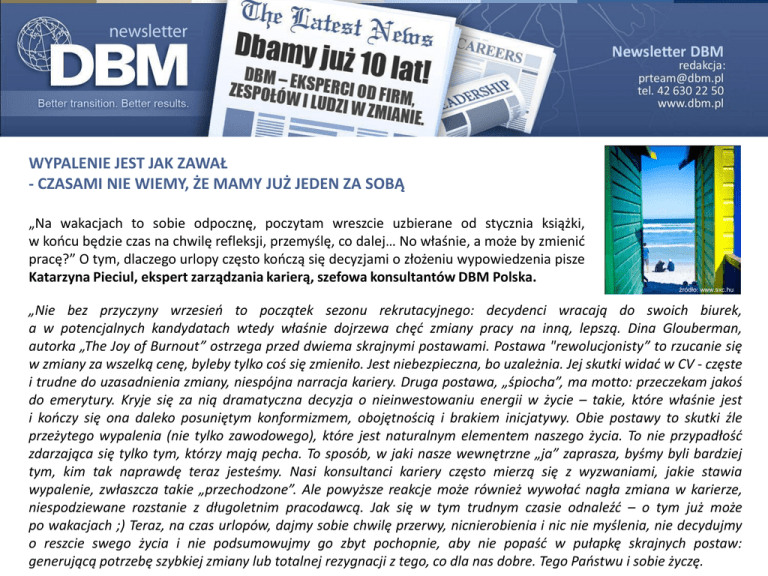 WYPALENIE JEST JAK ZAWAŁ - CZASAMI NIE WIEMY, ŻE MAMY JUŻ JEDEN ZA SOBĄ „Na wakacjach to sobie odpocznę, poczytam wreszcie uzbierane od stycznia książki, w koocu będzie czas na chwilę refleksji, przemyślę, co dalej… No właśnie, a może by zmienid pracę?” O tym, dlaczego urlopy często kooczą się decyzjami o złożeniu wypowiedzenia pisze Katarzyna Pieciul, ekspert zarządzania karierą, szefowa konsultantów DBM Polska. źródło: www.sxc.hu „Nie bez przyczyny wrzesieo to początek sezonu rekrutacyjnego: decydenci wracają do swoich biurek, a w potencjalnych kandydatach wtedy właśnie dojrzewa chęd zmiany pracy na inną, lepszą. Dina Glouberman, autorka „The Joy of Burnout” ostrzega przed dwiema skrajnymi postawami. Postawa "rewolucjonisty” to rzucanie się w zmiany za wszelką cenę, byleby tylko coś się zmieniło. Jest niebezpieczna, bo uzależnia. Jej skutki widad w CV - częste i trudne do uzasadnienia zmiany, niespójna narracja kariery. Druga postawa, „śpiocha”, ma motto: przeczekam jakoś do emerytury. Kryje się za nią dramatyczna decyzja o nieinwestowaniu energii w życie – takie, które właśnie jest i kooczy się ona daleko posuniętym konformizmem, obojętnością i brakiem inicjatywy. Obie postawy to skutki źle przeżytego wypalenia (nie tylko zawodowego), które jest naturalnym elementem naszego życia. To nie przypadłośd zdarzająca się tylko tym, którzy mają pecha. To sposób, w jaki nasze wewnętrzne „ja” zaprasza, byśmy byli bardziej tym, kim tak naprawdę teraz jesteśmy. Nasi konsultanci kariery często mierzą się z wyzwaniami, jakie stawia wypalenie, zwłaszcza takie „przechodzone”. Ale powyższe reakcje może również wywoład nagła zmiana w karierze, niespodziewane rozstanie z długoletnim pracodawcą. Jak się w tym trudnym czasie odnaleźd – o tym już może po wakacjach ;) Teraz, na czas urlopów, dajmy sobie chwilę przerwy, nicnierobienia i nic nie myślenia, nie decydujmy o reszcie swego życia i nie podsumowujmy go zbyt pochopnie, aby nie popaśd w pułapkę skrajnych postaw: generującą potrzebę szybkiej zmiany lub totalnej rezygnacji z tego, co dla nas dobre. Tego Paostwu i sobie życzę. ZWOLNID PRACOWNIKÓW CZY SZUKAD NOWEGO POMYSŁU NA BIZNES Mieli świetny pomysł na innowacyjny projekt, byli kreatywni i pracowali po nocach. Kryzys w branży przekreślił jednak szanse na sukces. Organizacja została ze świetnym zespołem, który nie miał co robid. Zwolnid? Szkoda pozbywad się ludzi, którzy wykazali się determinacją, znajomością branży i zapałem… Co zatem zrobid? Jeśli firma prowadzi wiele projektów, może „przerzucid” zespół do jednego z nich. Gorzej, gdy takich możliwości nie ma, a budżet nie pozwala opłacid przestojowego. „Doświadczenie pokazuje, że opłaca się dołożyd starao i poszukad pomysłu na zagospodarowanie zespołu, który już mamy na pokładzie i w który prawdopodobnie firma sporo już zainwestowała. Odejście jakiegoś zespołu na ogół negatywnie wpływa na ducha innych grup, które pozostają ze świadomością, że firma nie potrafiła w sposób trwały i stabilny zagospodarowad ludzi, których zaprosiła do współpracy - mówi Piotr Kociołek, Partner Zarządzający DBM Polska - Niedawny pozytywny przypadek: firma będąca własnością gminy starała się o finansowanie unijne dużego projektu rozbudowy infrastruktury komunalnej. Skala przedsięwzięcia uzasadniała zbudowanie zespołu, który miał napisad wniosek i administrowad funduszami. Po zakooczeniu inwestycji zarząd zdecydował o pozostawieniu zespołu z zadaniem znalezienia jako komercyjnych klientów innych gmin, które mogłyby skorzystad z jego ekspertyzy. Dziś zespół prowadzi równolegle trzy projekty związane z pisaniem aplikacji i obsługą funduszy, nie tylko sam się w ten sposób finansując, ale pozytywnie dokładając się do rachunku wyników całej firmy.” źródło: www.sxc.hu W TURCJI TAK SAMO JAK W POLSCE Jak osiągnąwszy już praktycznie wszystko dalej się rozwijad i jednocześnie pracowad na tym samych standardach w Polsce, na Węgrzech, w Czechach, Słowacji i Turcji? W trakcie dwudniowych warsztatów obszarów rozwoju i motywacji do zmiany szukał zespół firmy Alfa Laval - Dyrektor polskiego oddziału, HR Manager oraz 12 menedżerów wyższego szczebla. O przyczynach i efektach projektu mówi Jolanta Wilczyoska, Human Resources Manager Central & Eastern Europe Alfa Laval. źródło: www.sxc.hu „Nasi pracownicy mają bardzo duże doświadczenie i przeszli szereg szkoleo z umiejętności osobistych i zawodowych. Ich wiedza jest obszerna, ale najważniejsza jest chęd ciągłego rozwoju. Pewnie najłatwiej byłoby wybrad jakiś gotowy program szkoleniowy oferowany na rynku, ale prawdopodobnie nie spełniłby ich oczekiwao ani nie przyniósł wartości dodanej dla firmy. Dlatego uznaliśmy, że najskuteczniejszym programem, jaki możemy im zaproponowad jest coaching zespołu. Właśnie taka forma pozwala wybrad najważniejsze w danym momencie obszary rozwoju. A w konsekwencji możemy liczyd na wymierne rezultaty, a nie na krótkotrwałą euforię po mile spędzonym czasie na szkoleniu.” Coachowie DBM Polska przeprowadzą podobne warsztaty w innych oddziałach firmy: w Turcji, na Węgrzech, w Czechach i na Słowacji – czy tam przed pracownikami Alfa Laval stoją podobne wyzwania? „Warsztaty mają ułatwid współpracę wewnątrz zespołów, a przez to zwiększyd ich efektywnośd. Pomimo różnic kulturowych pomiędzy zespołami pracujemy przecież w tej samej firmie, kierujemy się tymi samymi zasadami, mamy te same wartości i oczywiście te same cele. Wszyscy, bez względu na narodowośd chcemy wzmocnid pozycję lidera w branży. Ten sam prowadzący w różnych lokalizacjach zapewnia spójnośd przekazywanych informacji, a sam przy tym coraz lepiej poznaje kulturę firmy i łatwiej mu jest rozpoznad nasze potrzeby.” MINI WYWIAD EMERYTU