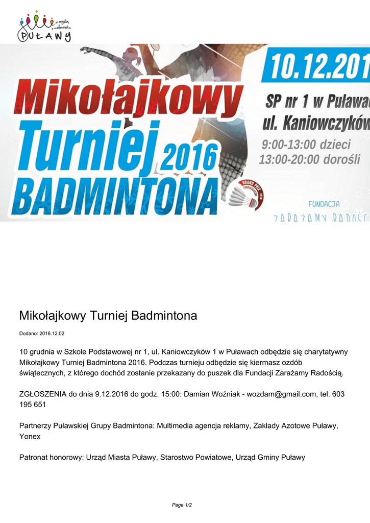 Mikołajkowy Turniej Badmintona Dodano: 2016.12.02 10 grudnia w Szkole Podstawowej nr 1, ul. Kaniowczyków 1 w Puławach odbędzie się charytatywny Mikołajkowy Turniej Badmintona 2016. Podczas turnieju odbędzie się kiermasz ozdób świątecznych, z którego dochód zostanie przekazany do puszek dla Fundacji Zarażamy Radością. ZGŁOSZENIA do dnia 9.12.2016 do godz. 15:00: Damian Woźniak - [email protected], tel. 603 195 651 Partnerzy Puławskiej Grupy Badmintona: Multimedia agencja reklamy, Zakłady Azotowe Puławy, Yonex Patronat honorowy: Urząd Miasta Puławy, Starostwo Powiatowe, Urząd Gminy Puławy Page 1/2 Źródło: Page 2/2