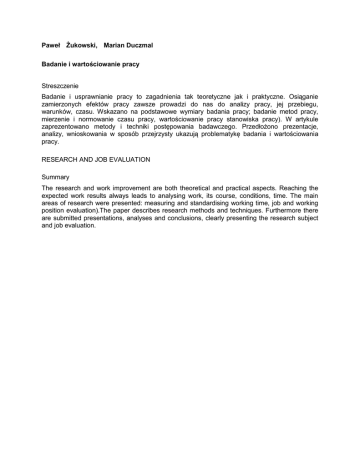 Paweł Żukowski, Marian Duczmal Badanie i wartościowanie pracy Streszczenie Badanie i usprawnianie pracy to zagadnienia tak teoretyczne jak i praktyczne. Osiąganie zamierzonych efektów pracy zawsze prowadzi do nas do analizy pracy, jej przebiegu, warunków, czasu. Wskazano na podstawowe wymiary badania pracy; badanie metod pracy, mierzenie i normowanie czasu pracy, wartościowanie pracy stanowiska pracy). W artykule zaprezentowano metody i techniki postępowania badawczego. Przedłożono prezentacje, analizy, wnioskowania w sposób przejrzysty ukazują problematykę badania i wartościowania pracy. RESEARCH AND JOB EVALUATION Summary The research and work improvement are both theoretical and practical aspects. Reaching the expected work results always leads to analysing work, its course, conditions, time. The main areas of research were presented: measuring and standardising working time, job and working position evaluation).The paper describes research methods and techniques. Furthermore there are submitted presentations, analyses and conclusions, clearly presenting the research subject and job evaluation. Tadeusz Pokusa Logistyka i marketing jako dualna koncepcja zintegrowanego zarządzania przedsiębiorstwem Streszczenie W artykule podejmuje się próbę sformułowania nowego podejścia, założeń logistyki i marketingu. Przedstawiono ogólne uporządkowanie zasadniczych definicji rozważanego tematu. Określono koncepcje zintegrowanego zarządzania przedsiębiorstwem. Wyodrębniono podstawowe wymiary efektów zintegrowanego zarządzania logistyczno-marketingowego oraz środki ich realizacji. LOGISTICS AND MARKETING AS A DUAL CONCEPTION OF INTEGRATED COMPANY MANAGEMENT Summary The paper attempts to form new attitude, logistic assumptions and marketing. General order of the main definitions of the discussed subject was presented. Furthermore the concepts of integrated company management were determined. Yet, the main dimensions of integrated logistic-marketing management effects were separated and the methods of putting them into practice. Kazimierz M. Czarnecki Psychiczna aktywność prozawodowa studentów szkół wyższych (zarys problemu) Streszczenie Opracowanie jest zarysem problemu psychicznej aktywności prozawodowej studentów, ze szczególnym scharakteryzowaniem aktywności intelektualnej. Wyniki badań psychicznej aktywności studentów wyrażającej się w postaci ocen z osiągnięć w studiach wskazują, że 22,2% studentów nie wykazało się oczekiwanym przez nauczycieli akademickich zadowalającym poziomem intelektualnej aktywności w studiach wyższych. PSYCHOLOGICAL PRO-VOCATIONAL ACTIVITY OF STUDENTS OF HIGHER EDUCATION INSTITUTIONS (PROBLEM OUTLINE) Summary The paper pro vide s the outline of psychological pro-vocational activity of students, especially characterising intellectual activity. The results of psychological activity of students expressed in the form of academic records prove that, 22.2% of them have not achieved expected by academic teachers satisfactory result of intellectual activity at higher studies. Anna Szczęsna Sieć wsparcia w środowisku zawodowym nauczycieli Streszczenie Artykuł stanowi zarysowanie odpowiedzi na pytanie: w jaki sposób można optymalizować funkcjonowanie zawodowe nauczyciela, W dobie współczesnych zagrożeń tej profesji, poprzez aktywizowanie profesjonalnych sieci wsparcia społecznego nauczycieli. Przedstawione zostają pojęcia wsparcia społecznego i sieci wsparcia w środowisku zawodowym nauczycieli. Artykuł zawiera również wyniki badań przeprowadzonych w grupie 359 respondentów, dotyczące poczucia wsparcia oraz struktur profesjonalnych sieci wsparcia społecznego w środowiskach nauczycieli. SUPPORT NETWORK IN TEACHER'S VOCATIONAL ENVIRONMENT Summary The paper attempts to answer the question: how to optimise the vocational functioning of a teacher facing contemporary dangers of this profession, by activating professional networks of teachers' social support. Yet, the following concepts are presented: social support and support network in teachers' vocational environment. The paper informs us also about the results of research conducted in the group of 359 respondents referring to feeling of support and the structure of professional networks of social support in teachers' environment. Eunika Baron-Polańczyk Desygnaty kompetencji zawodowych nauczycieli Streszczenie Artykuł rozpatruje desygnaty kompetencji zawodowych nauczycieli i podejmuje dyskusję w następujących obszarach tematycznych: 1) eksplikacja terminu kompetencje; 2) różnorodność klasyfikacji kompetencji nauczycielskich; 3) przejawy kompetencji zawodowych nauczycieli. Wskazano na złożoność i wielowymiarowość kompetencji jako dyspozycji osobowościowych oraz na nowe zadania zawodowe w obszarze nauczycielskich kompetencji. REFERENTS OF THE PROFESSIONAL COMPETENCES OF TEACHERS Summary The articIe considers referents of the professional Competences of teachers and undertakes the discussion in the following subject fields: 1) explanation of the competences term; 2) the variety of the cIassification of teacher's cornpetences; 3) indications of the professional competences of teachers. One evidenced the complexity and the multidimensionality of the competences as the individualistic dispositions and the new professional assignments in the area of teacher's competences. Beata Joksz-Skibińska System kształcenia nauczycieli techniki Streszczenie Nauczyciel wprowadzając ucznia w świat techniki ułatwia jemu radzenie w posługiwaniu się narzędziami życia codziennego oraz elementarną obsługą urządzeń technicznych, a ponadto uświadamia nasycenie współczesnego środowiska - w tym domowego otoczenia, bliższego i dalszego - techniką. Efektywność kształcenia, w tym również poziom realizacji programu nauczania, zależy w dużej mierze od kwalifikacji nauczyciela i jego przygotowania do pracy w szkole. W artykule przedstawione są wy