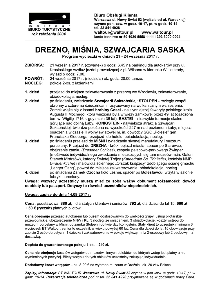 Biuro Obsługi Klienta BIURO TURYSTYCZNE rok założenia 2004 Warszawa ul. Nowy Świat 53 (wejście od ul. Wareckiej) czynne pon.-czw. w godz. 10-17, pt. w godz. 10-14 tel. 22 841 4928 [email protected] www.waltour.pl konto bankowe nr 50 1020 5558 1111 1393 3000 0004 ______________________________________________________________________________ DREZNO, MIŚNIA, SZWAJCARIA SASKA Program wycieczki w dniach 21 - 24 września 2017 r. ZBIÓRKA: POWRÓT: NOCLEG: 21 września 2017 r. (czwartek) o godz. 6.45 na parkingu dla autokarów przy ul. Krasińskiego wzdłuż jezdni prowadzącej z pl. Wilsona w kierunku Wisłostrady, wyjazd o godz. 7.00. 24 września 2017 r. (niedziela) ok. godz. 20.00 tamże. pokoje 2-os. z łazienkami 1. dzień przejazd do miejsca zakwaterowania z przerwą we Wrocławiu, zakwaterowanie, obiadokolacja, nocleg. 2. dzień po śniadaniu, zwiedzanie Szwajcarii Saksońskiej: STOLPEN - rozległy zespół obronny z czterema dziedzińcami, usytuowany na wulkanicznym wzniesieniu. Zamek wiąże się z losami hrabiny Cosel - najsłynniejszej faworyty polskiego króla Augusta II Mocnego, która więziona była w wieży zamkowej przez 49 lat (osadzona tam w Wigilię 1716 r. gdy miała 36 lat). BASTEI – niezwykłe formacje skalne górujące nad doliną Łaby, KONIGSTEIN - największa atrakcja Szwajcarii Saksońskiej, twierdza położona na wysokości 247 m nad poziomem Łaby, miejsca osadzenia w czasie II wojny światowej m. in. dowódcy SGO „Polesie” gen. Franciszka Kleeberga, przejazd do hotelu, obiadokolacja, nocleg. 3. dzień po śniadaniu przejazd do MIŚNI i zwiedzanie słynnej manufaktury i muzeum porcelany. Przejazd do DREZNA - krótki objazd miasta, spacer po Starówce, obejrzenie zamku (Dresdner Schloss), zespołu pałacowo-parkowego Zwinger (możliwość indywidualnego zwiedzania mieszczących się tam muzeów m.in. Galerii Starych Mistrzów), katedry Świętej Trójcy (Kathedrale Ss. Trinitatis), kościoła NMP (Frauenkirche) i malowidła ściennego „Orszak książęcy” zdobiącego ścianę gmachu „Langer Gang”, powrót do miejsca zakwaterowania, obiadokolacja, nocleg 4. dzień po śniadaniu Zamek Czocha koło Leśnej, spacer po Bolesławcu, wizyta w salonie fabryki porcelany. Uwaga: wszyscy uczestnicy muszą mieć ze sobą ważny dokument tożsamości: dowód osobisty lub paszport. Dotyczy to również uczestników niepełnoletnich. Uwaga: zapisy do dnia 14.09.2017 r. Cena: podstawowa: 880 zł, dla stałych klientów i seniorów: 792 zł, dla dzieci do lat 15: 660 zł + 50 € (ryczałt) płatnych pilotowi Cena obejmuje przejazd autokarem lub busem dostosowanym do wielkości grupy, usługi pilotarskie i przewodnickie, ubezpieczenie NNW i KL, 3 noclegi ze śniadaniem, 3 obiadokolacje, koszty wstępu do muzeum porcelany w Miśni, do zamku Stolpen i do twierdzy Königstein. Stały klient to uczestnik minimum 3 wycieczek BT Waltour, senior to uczestnik w wieku powyżej 60 lat. Cena dla dzieci do lat 15 obowiązuje przy zapisie 2 osób dorosłych i 1 dziecka i zakwaterowaniu w pokoju większym niż 2-osobowy lub 2 osobowym z dostawką. Dopłata do gwarantowanego pokoju 1.os. – 240 zł. Cena nie obejmuje kosztów wstępów do muzeów i innych obiektów, do których wstęp jest płatny a nie wymienionych powyżej. Bilety wstępu do tych obiektów uczestnicy zakupują indywidualnie. Dodatkowy koszt wstępów – ok. 8-20 € na wybrane muzeum w Dreźnie i ok. 20 zł w Polsce. Zapisy, informacje: BT WALTOUR Warszawa ul. Nowy Świat 53 czynne w pon.-czw. w godz. 10-17, pt. w godz. 10-14. Rezerwacje telefoniczne pod nr tel. 22 841 4928 przyjmowane są w godzinach pracy Biura. Biuro Obsługi Klienta BIURO TURYSTYCZNE rok założenia 2004 Warszawa ul. Nowy Świat 53 (wejście od ul. Wareckiej) czynne pon.-czw. w godz. 10-17, pt. w godz. 10-14 tel. 22 841 4928 [email protected] www.waltour.pl konto bankowe nr 50 1020miejsca 5558 1111 1393 3000 0004 Rezerwacje drogą mailową są ważne po potwierdzeniu dostępności przez Biuro. Rezerwacje bez wpłaty zaliczki są ważne o ile nie ustalono innego terminu przez 7 dni i w tym czasie należy wpłacić zaliczkę. Dopłaty należy dokonać najpóźniej na 21 przed wycieczką zagraniczną, na 14 dni przed wycieczką wielodniową krajową i na 7 dni przed wycieczką jednodniową krajową. W przypadku braku zaliczki bądź dopłaty w terminach ustalonych z Klientem, Biuro zastrzega sobie prawo do anulowania rezerwacji bez powiadamiania Klienta. Wpłat można dokonywać gotówką w siedzibie Biura lub przelewem na konto BT Waltour Zalecamy wykupienie u dowolnego ubezpieczyciela ubezpieczenia kosztów rezygnacji z uczestnictwa w imprezie turystycznej przed datą jej rozpoczęcia przez uczestnika z przyczyn od niego niezależnych. Zajmowanie miejsc w autokarze rozpoczyna się najwcześniej 15 min. przed odjazdem, wg kolejności wpłat. W przypadku niskiej frekwencji wycieczka może być odwołana. Biuro zastrzega sobie prawo do dokonywania drobnych zmian w programie w trakcie jego realizacji w tym zmiany kolejności odwiedzanych obiektów - wynikających z przyczyn niezależnych od Biura. O ostatecznej kolejności zwiedzania obiektów decyduje pilot/przewodnik prowadzący wycieczkę. Biuro nie gwarantuje wejścia do wnętrz wszystkich oglądanych obiektów. Pilot/przewodnik prowadzący wycieczkę nie oprowadza po ekspozycjach muzealnych. Biuro nie gwarantuje realizacji zgłoszeń dotyczących diet specjalistycznych przy organizacji posiłków będących w cenie wycieczki. Przy powrocie z wycieczki, w Warszawie, obowiązuje jeden przystanek dla wysiadających. Prosimy o zapoznanie się z informacjami organizacyjnymi dotyczącymi wycieczek. BT WALTOUR jest wpisane do Rejestru Organizatorów Turystyki i Pośredników Turystycznych Województwa Mazowieckiego pod numerem 740. SERDECZNIE ZAPRASZAMY