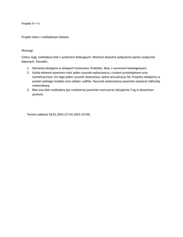 Projekt IV + V Projekt stołu z rozkładanym blatem. Wymogi: Cztery nogi, rozkładany blat z systemem blokującym. Możliwe dowolne połączenia oprócz wyłącznie klejonych. Ponadto: 1. Elementy dostępne w sklepach Castorama, Praktiker, Ikea, z numerami katalogowymi. 2. Każdy element powinien mieć jeden rysunek wykonawczy z rzutem prostokątnym oraz izometrycznym. Do tego jeden rysunek złożeniowy i jedna wizualizacja 3d. Projekty oddajemy w postaci jednego modelu oraz układu i pdfów. Rysunek wykonawczy powinien zawierać tabliczkę materiałową. 3. Blat oraz blat rozkładany (po rozłożeniu) powinien wytrzymać obciążenie 2 kg w dowolnym punkcie. Termin oddania 18.01.2015 (17.01.2015 23:59).