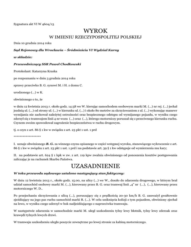 Sygnatura akt VI W 4604/13 WYROK W IMIENIU RZECZYPOSPOLITEJ POLSKIEJ Dnia 10 grudnia 2014 roku Sąd Rejonowy dla Wrocławia – Śródmieścia VI Wydział Karny w składzie: Przewodniczący SSR Paweł Chodkowski Protokolant: Katarzyna Kraska po rozpoznaniu w dniu 3 grudnia 2014 roku sprawy przeciwko B. G. synowi M. i H. z domu C. urodzonego (...) w K. obwinionego o to, że w dniu 12 kwietnia 2013 r. około godz. 14:58 we W. kierując samochodem osobowym marki M. (...) nr rej. (...) jechał jezdnią ul. (...) od strony ul. (...) w kierunku ul. (...) i około 80 metrów za skrzyżowaniem z ul. (...) wykonując manewr wymijania nie zachował należytej ostrożności oraz bezpiecznego odstępu od wymijanego pojazdu, w wyniku czego zderzył się z tramwajem linii 4 nr wozu (...) oraz (...), którego motorniczy poruszał się z przeciwnego kierunku ruchu. Czynem swoim spowodował zagrożenie bezpieczeństwa w ruchu drogowym. tj. o czyn z art. 86 § 1 kw w związku z art. 23 pkt 1 ust. 1 prd ****************** I. uznaje obwinionego B. G. za winnego czynu opisanego w części wstępnej wyroku, stanowiącego wykroczenie z art. 86 § 1 kw w związku z art. 23 pkt 1 ust. 1 prd i na podstawie art. 39 § 1 kw odstępuje od wymierzenia mu kary; II. na podstawie art. 624 § 1 kpk w zw. z art. 119 kpw zwalnia obwinionego od ponoszenia kosztów postępowania zaliczając je na rachunek Skarbu Państwa. UZASADNIENIE W toku przewodu sądowego ustalono następujący stan faktyczny: W dniu 12 kwietnia 2013 r., około godz. 15.00, na ulicy (...) we W., doszło do zdarzenia drogowego, w którym brał udział samochód osobowy marki M. (...), kierowany przez B. G. oraz tramwaj linii „4” nr (...), (...), kierowany przez motorniczego W. D.. Po przejechaniu skrzyżowania z ulicą (...), poruszający się z prędkością 20-30 km/h B. G. zauważył gwałtownie zjeżdżający na jego pas ruchu samochód marki R. (...). W celu uniknięcia kolizji z tym pojazdem, obwiniony zjechał na lewo, w wyniku czego uderzył w bok nadjeżdżającego z naprzeciwka tramwaju. W następstwie zdarzenia w samochodzie marki M. uległ uszkodzeniu tylny lewy błotnik, tylny lewy zderzak oraz krawędź tylnych lewych drzwi. W tramwaju uszkodzeniu uległo poszycie zewnętrzne po lewej stronie za kabiną motorniczego. dowód: zeznania świadka W. D. k. 85, 122 akt; wyjaśnienia obwinionego k.23-24,75 akt;; notatka urzędowa o kolizji drogowej k.3 akt; opinia biegłego zakresu rekonstrukcji wypadków drogowych k. 87-97 akt; zeznania biegłego J. D. k. 104,22 akt; dokumentacja fotograficzna k, 81-83 akt; notatka urzędowa k. 3akt; informacja (...) k. 78-79 akt. B. G. nie przyznał się do popełnienia zarzucanego mu czynu. W złożonych wyjaśnieniach potwierdził okoliczności faktyczne zdarzenia podnosząc, że w sytuacji drogowej, w której się znalazł, wykonany przez niego manewr, był „najlepszym i najbardziej bezpiecznym”(k.75), jaki mógł wykonać. W szczególności wskazał, że gwałtowne hamowanie doprowadziłoby do uderzenia w jego samochód przez pojazd jadący bezpośrednio za nim. Oceniając zgromadzony w sprawie materiał dowodowy stwierdzić należy, że w zakresie okoliczności przedmiotowych zdarzenia, to w zasadniczej mierze wyjaśnienia obwinionego stanowiły podstawę dokonanych przez Sąd ustaleń faktycznych. Znajdują one bowiem częściowe odzwierciedlenie w zeznaniach motorniczego W. D. oraz bezspornych ustaleniach, odnoszących się do miejsca kolizji i powstałych w jej następstwie uszkodzeniach w uczestniczących w zdarzeniu pojazdach. Sąd podzielił zatem twierdzenia obwinionego, że wykonany przez niego skręt w lewo, był następstwem nieprawidłowego zachowania na drodze kierowcy samochodu marki R. (...), który zajechał drogę kierującemu samochodem M. (...). Rzecz jednak w tym, że manewr ten był błędny. Odmienne twierdzenia w tym zakresie B. G., (określającego manewr ten „najlepszym i najbardziej bezpiecznym”), są niczym nieuzasadnione, gołosłowne, mają wręcz charakter życzeniowy, zmierzają bowiem do usprawiedliwienia niewłaściwej decyzji jaką podjął wjeżdżając na pas ruchu przeznaczony dla tramwaju i uderzając w niego, w miejsce oczekiwanej i uzasadnionej w zaistniałej sytuacji drogowej reakcji- hamowania. Ten właśnie manewr obronny winien wykonać on, zamiast dywagować na temat możliwego zachowania kierowcy pojazdu jadącego za jego samochodem. Hamowanie nie powoduje zatrzymania pojazdu natychmiastowo, lecz jest poprzedzone sukcesywnym zmniejszaniem prędkości, a co za tym idzie umożliwia osobom jadącym z tyłu na rozeznanie sytuacji i wykonanie identycznego manewru. Do ich zatem obowiązku należało utrzymanie takiego odstępu, aby nie najechać na tył hamującego przed nimi pojazdu, nie zaś rozważanie przez obwinionego, co by było, gdyby było inaczej. Przedstawione przy tym przez obwinionego czynności, jakie wykonał w celu uniknięcia kolizji (wykonanie obserwacji ruchu pojazdów poruszających się za nim, podjęcie decyzji o skręcie i wykonanie skrętu) wydłużyło podjęcie prawidłowej decyzji i zajęło mu więcej czasu, niż poprawnie wykonany manewr wyhamowania. Na podniesione wyżej okoliczności wskazał również w swojej opinii biegły sądowy z zakresu rekonstrukcji wypadków drogowych i w tym zakresie sporządzona przez niego opinia stanowiła podstawę dokonanych przez Sąd ustaleń. Opinia biegłego jest bowiem w tym zakresie - rzetelna, jasna, pełna i zachowuje walor przydatności w niniejszym postępowaniu. Opinia ta nie zawiera wewnętrznych sprzeczności. Posługuje się logicznymi argumentami. Opinii nie można postawić zarzutu niejasności-nie można uznać jej wniosków końcowych za nielogiczne, nieścisłe lub obwarowane takimi zastrzeżeniami, iż nie można ustalić, jaki ostatecznie pogląd przyjmuje biegły, a także, gdy sformułowana jest tak zawiłe, że jest niezrozumiała, względnie, gdy jej wnioski końcowe nie