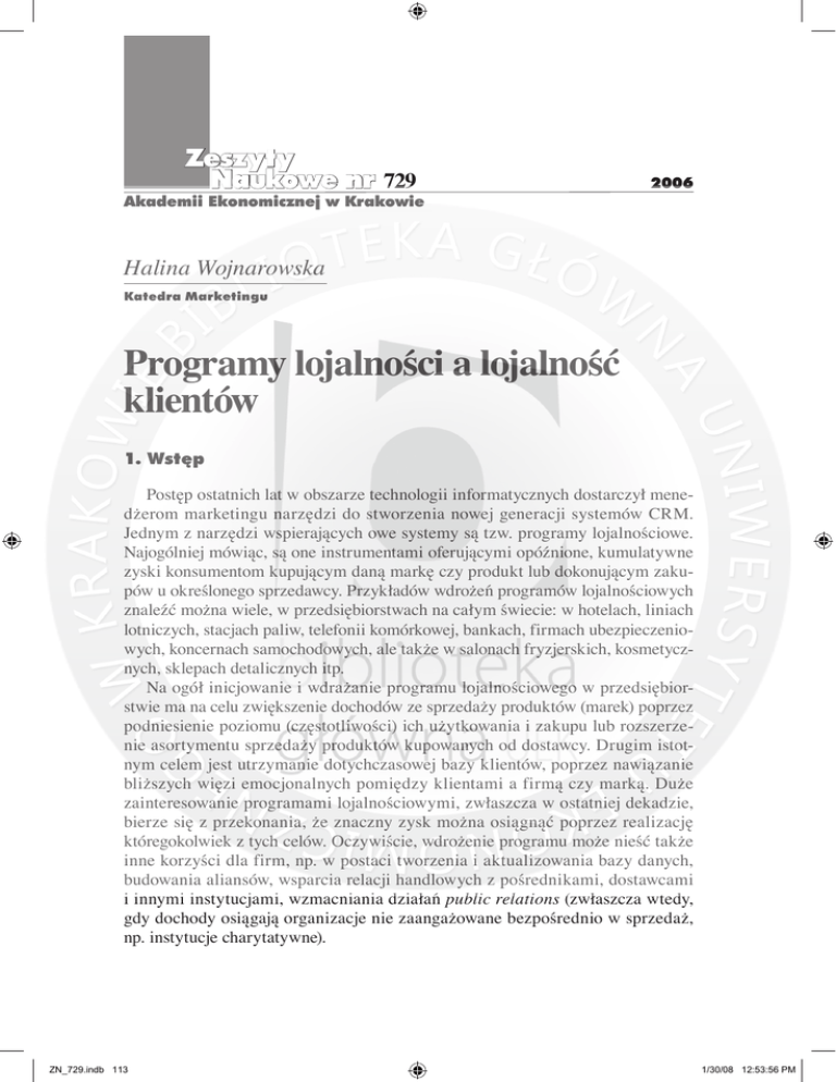 Zeszyty Naukowe nr 729 Akademii Ekonomicznej w Krakowie 2006 Halina Wojnarowska Katedra Marketingu Programy lojalności a lojalność klientów 1. Wstęp Postęp ostatnich lat w obszarze technologii informatycznych dostarczył menedżerom marketingu narzędzi do stworzenia nowej generacji systemów CRM. Jednym z narzędzi wspierających owe systemy są tzw. programy lojalnościowe. Najogólniej mówiąc, są one instrumentami oferującymi opóźnione, kumulatywne zyski konsumentom kupującym daną markę czy produkt lub dokonującym zakupów u określonego sprzedawcy. Przykładów wdrożeń programów lojalnościowych znaleźć można wiele, w przedsiębiorstwach na całym świecie: w hotelach, liniach lotniczych, stacjach paliw, telefonii komórkowej, bankach, firmach ubezpieczeniowych, koncernach samochodowych, ale także w salonach fryzjerskich, kosmetycznych, sklepach detalicznych itp. Na ogół inicjowanie i wdrażanie programu lojalnościowego w przedsiębiorstwie ma na celu zwiększenie dochodów ze sprzedaży produktów (marek) poprzez podniesienie poziomu (częstotliwości) ich użytkowania i zakupu lub rozszerzenie asortymentu sprzedaży produktów kupowanych od dostawcy. Drugim istotnym celem jest utrzymanie dotychczasowej bazy klientów, poprzez nawiązanie bliższych więzi emocjonalnych pomiędzy klientami a firmą czy marką. Duże zainteresowanie programami lojalnościowymi, zwłaszcza w ostatniej dekadzie, bierze się z przekonania, że znaczny zysk można osiągnąć poprzez realizację któregokolwiek z tych celów. Oczywiście, wdrożenie programu może nieść także inne korzyści dla firm, np. w postaci tworzenia i aktualizowania bazy danych, budowania aliansów, wsparcia relacji handlowych z pośrednikami, dostawcami i innymi instytucjami, wzmacniania działań public relations (zwłaszcza wtedy, gdy dochody osiągają organizacje nie zaangażowane bezpośrednio w sprzedaż, np. instytucje charytatywne). ZN_729.indb 113 1/30/08 12:53:56 PM 114 Halina Wojnarowska Rozważania w niniejszym artykule koncentrują się na istocie i charakterystyce modeli kształtowania lojalności klientów oraz wynikających z nich możliwości oddziaływania na postawy i zachowania klientów w formie programów lojalności. Artykuł zawiera także prezentację najnowszych badań w zakresie wdrażania programów lojalności w polskich przedsiębiorstwach. 2. Pojęcie lojalności klienta W literaturze przedmiotu można znaleźć wiele prób definiowania czy określania istoty lojalności klientów. Znanych jest kilka koncepcji, które zdobyły dużą popularność i są akceptowane przez badaczy. Jedna z nich ujmuje lojalność jako postawę będącą wynikiem subiektywnych odczuć klientów, które z czasem prowadzą do ich indywidualnego przywiązania, a nawet oddania marce (lub firmie). Taka postawa pełnej akceptacji krystalizuje się poprzez doznania emocjonalne i stan świadomości. Niezwykle trafnie, reprezentując ten pogląd, istotę lojalności sprecyzował R. Olivier, który po wielu wcześniejszych modyfikacjach ostatecznie określił ją jako „głęboką potrzebę ponownego zakupu i ciągłego popierania ulubionego produktu (marki) w przyszłości, prowadzącą do jego zakupu, mimo wpływów sytuacyjnych i marketingowego działania firm konkurencyjnych, skłaniającego do zmiany tego zachowania”. Istnieją empiryczne dowody na poparcie takiego stanowiska. Między innymi udowodniono, że klienci lojalni w stosunku do marki, dzięki swemu pozytywnemu nastawieniu, są dużo mniej podatni na negatywne informacje o niej, a możliwy do wygenerowania zysk, dzięki wzmocnieniu ich wierności, staje się bardziej przewidywalny. Ponadto badania wykazują, że lojalność oparta na pozytywnej postawie i akceptacji, a w konsekwencji nawet oddaniu marce, może być wzmacniana poprzez różnorodne działania przedsiębiorstw, np. przez członkostwo w pewnej „społeczności konsumpcyjnej”, „wiosce” – grupie osób popierających te same wartości konsumpcyjne i zachowania. Otwiera się więc tu duże pole dla programów lojalnościowych ukierunkowanych na ten sposób kreowania wierności klientów. G.S. Day, A Two-dimensional Concept of Brand Loyalty, „Journal of Advertising Research” 1969, vol. 9, s. 29–35. R.L. Olivier, Whence Consumer Loyalty?, „Journal of Marketing” 1999, vol. 63 (Special Issue), s. 33–44. R. Ahluwalia, H.R. Unnava, R.E. Brunkrant, Towards Understanding the Value of a Loyal Customer: An Information-Processing Perspective, „Marketing Science Institute Report”, Cambridge, Ma 1999, nr 99–116. ZN_729.indb 114 1/30/08 12:53:56 PM Programy lojalności a lojalność klientów 115 Jednakże istnieje nadal wiele wątpliwości i krytycznych poglądów dotyczących tego podejścia. Uważa się, że ten model „powstawania” lojalności nie jest właściwy dla klientów nabywających produkty tzw. impulsywnego zakupu, produkty o dużej częstotliwości zakupu, a zatem o małym ryzyku związanym z ich nabywaniem, i nie jest on zasadny w przypadku występowania u konsumentów silnej potrzeby poszukiwania różnorodności. Wydaje się natomiast, że może być bardziej odpowiedni dla wyjaśniania mechanizmu powstawania lojalności klientów raczej na rynkach produktów epizodycznego zakupu i towarów wybieralnych. Kolejna koncepcja pojmuje lojalność jako zachowanie, które przejawia się w powtarzaniu zakupu określonych dóbr i usług, zwiększaniu wielkości ich zamówień. Staje się ona, w wielkim uproszczeniu, wynikiem odczuwania kolejnych stanów satysfakcji z konsumpcji (użytkowania) nabywanego produktu, a w konsekwencji jest skutkiem oszczędności czasu i energii niezbędnych do poszukiwania ofert alternatywnych, a więc może być wynikiem wygody, inercji, obaw przez ryzykiem czy nawyku. Konsumenci w tym modelu są motywowani do zakupu głównie tymi przyczynami, nie zaś głębokim przywiązaniem czy silnym przekonaniem. Jeśli, z jaki