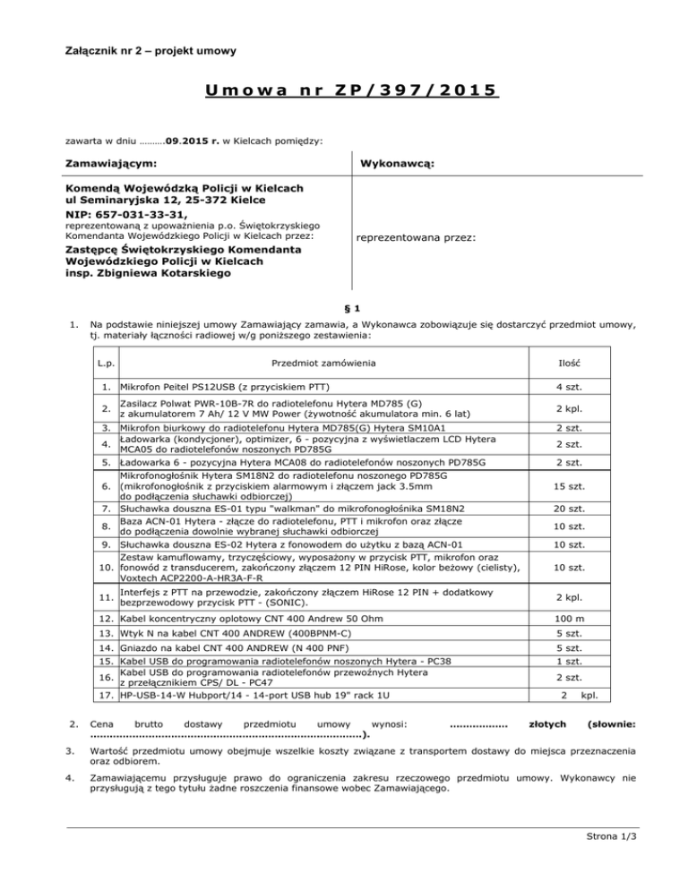 Załącznik nr 2 – projekt umowy Umowa nr ZP/397/2015 zawarta w dniu ……….09.2015 r. w Kielcach pomiędzy: Zamawiającym: Wykonawcą: Komendą Wojewódzką Policji w Kielcach ul Seminaryjska 12, 25-372 Kielce NIP: 657-031-33-31, reprezentowaną z upoważnienia p.o. Świętokrzyskiego Komendanta Wojewódzkiego Policji w Kielcach przez: reprezentowana przez: Zastępcę Świętokrzyskiego Komendanta Wojewódzkiego Policji w Kielcach insp. Zbigniewa Kotarskiego §1 1. Na podstawie niniejszej umowy Zamawiający zamawia, a Wykonawca zobowiązuje się dostarczyć przedmiot umowy, tj. materiały łączności radiowej w/g poniższego zestawienia: L.p. Przedmiot zamówienia Ilość 1. Mikrofon Peitel PS12USB (z przyciskiem PTT) 2. 4 szt. Zasilacz Polwat PWR-10B-7R do radiotelefonu Hytera MD785 (G) z akumulatorem 7 Ah/ 12 V MW Power (żywotność akumulatora min. 6 lat) 3. Mikrofon biurkowy do radiotelefonu Hytera MD785(G) Hytera SM10A1 Ładowarka (kondycjoner), optimizer, 6 - pozycyjna z wyświetlaczem LCD Hytera 4. MCA05 do radiotelefonów noszonych PD785G 5. Ładowarka 6 - pozycyjna Hytera MCA08 do radiotelefonów noszonych PD785G Mikrofonogłośnik Hytera SM18N2 do radiotelefonu noszonego PD785G 6. (mikrofonogłośnik z przyciskiem alarmowym i złączem jack 3.5mm do podłączenia słuchawki odbiorczej) 7. Słuchawka douszna ES-01 typu "walkman" do mikrofonogłośnika SM18N2 Baza ACN-01 Hytera - złącze do radiotelefonu, PTT i mikrofon oraz złącze 8. do podłączenia dowolnie wybranej słuchawki odbiorczej 9. Słuchawka douszna ES-02 Hytera z fonowodem do użytku z bazą ACN-01 Zestaw kamuflowamy, trzyczęściowy, wyposażony w przycisk PTT, mikrofon oraz 10. fonowód z transducerem, zakończony złączem 12 PIN HiRose, kolor beżowy (cielisty), Voxtech ACP2200-A-HR3A-F-R 11. 2. Interfejs z PTT na przewodzie, zakończony złączem HiRose 12 PIN + dodatkowy bezprzewodowy przycisk PTT - (SONIC). 2 kpl. 2 szt. 2 szt. 2 szt. 15 szt. 20 szt. 10 szt. 10 szt. 10 szt. 2 kpl. 12. Kabel koncentryczny oplotowy CNT 400 Andrew 50 Ohm 100 m 13. Wtyk N na kabel CNT 400 ANDREW (400BPNM-C) 5 szt. 14. Gniazdo na kabel CNT 400 ANDREW (N 400 PNF) 5 szt. 15. Kabel USB do programowania radiotelefonów noszonych Hytera - PC38 Kabel USB do programowania radiotelefonów przewoźnych Hytera 16. z przełącznikiem CPS/ DL - PC47 17. HP-USB-14-W Hubport/14 - 14-port USB hub 19" rack 1U 1 szt. Cena brutto dostawy przedmiotu umowy wynosi: …………………………………………………………………………). ……………… 2 szt. 2 złotych kpl. (słownie: 3. Wartość przedmiotu umowy obejmuje wszelkie koszty związane z transportem dostawy do miejsca przeznaczenia oraz odbiorem. 4. Zamawiającemu przysługuje prawo do ograniczenia zakresu rzeczowego przedmiotu umowy. Wykonawcy nie przysługują z tego tytułu żadne roszczenia finansowe wobec Zamawiającego. Strona 1/3 §2 1. Przedmiot umowy należy dostarczyć w terminie do 23.10.2015 r., do magazynu Wydziału Łączności i Informatyki KWP w Kielcach, ul. Seminaryjska 12. 2. Osobami do kontaktu są; 3. ze strony Zamawiającego: Ryszard Czubek, Paweł Kluziak, ze strony Wykonawcy: ………………………………………. Wykonawca zobowiązany jest powiadomić Zamawiającego z (2) dwu dniowym wyprzedzeniem o dokładnym terminie dostawy przedmiotu umowy. 4. Wykonawca gwarantuje, że dostarczony towar będzie fabrycznie nowy, wolny od wad uniemożliwiających jego użycie zgodnie z przeznaczeniem, zabezpieczony przed uszkodzeniami mechanicznymi. 5. Strony ustalają, że odbiór przedmiotu umowy, w przypadku braku uwag, potwierdzony zostanie podpisanym przez Strony protokołem odbioru, który stanowić będzie podstawę do wystawienia przez Wykonawcę faktury VAT. W przypadku uwag Strony podpiszą protokół z zastrzeżeniami. 6. W przypadku ustalenia przy odbiorze, że dostarczony towar jest niezgodny z postanowieniami niniejszej umowy, Wykonawca w terminie nie przekraczającym 2 dni roboczych licząc od dnia sporządzenia protokołu odbioru z zastrzeżeniami, ale nie później niż w terminie, o którym mowa w ust.1 zobowiązany jest do wymiany asortymentu na nowy, wolny od wad lub do uzupełnienia braków. §3 1. Wykonawca udziela Zamawiającemu gwarancji na okres ……. miesięcy licząc od daty odbioru przedmiotu umowy przez Zamawiającego. 2. Okres gwarancji rozpoczyna się od dnia podpisania protokołu odbioru, o którym mowa w § 2 ust 5. 3. Gwarancja przedmiotu umowy obejmuje: - wady materiałowe i konstrukcyjne, a także nie spełnienie deklarowanych przez producenta parametrów i/lub funkcji użytkowych, - naprawę wykrytych uszkodzeń. 4. Zgłoszenia reklamacji Zamawiający będzie przekazywał telefonicznie na numer +48 ……………………. lub na nr +48 …………………… lub pocztą elektroniczną na e-mail: ……………………………………... faxem 5. Wszelkie koszty transportu związane ze świadczeniem usług gwarancyjnych ponosi Wykonawca. 6. Wykonawca powiadomi Zamawiającego pisemnie o każdorazowej zmianie danych tj.: numer telefonu, numer faxu lub adres e-mail, na które będą składane reklamacje. §4 Zapłata za dostarczony przedmiot umowy nastąpi w terminie do 14 dni po otrzymaniu faktury, przelewem na rachunek Wykonawcy. §5 Zamawiającemu przysługuje prawo odstąpienia od umowy w następujących sytuacjach, gdy: 1) wystąpi istotna zmiana okoliczności powodująca, że wykonanie umowy nie leży w interesie publicznym, czego nie można było przewidzieć w chwili zawarcia umowy, Zamawiający może odstąpić od umowy w terminie 7 dni od powzięcia wiadomości o powyższym; 2) Wykonawca nie dostarczył przedmiotu umowy w terminie, o którym mowa w §2 ust. 1; 3) zostanie ogłoszona upadłość lub nastąpiło rozwiązanie firmy Wykonawcy albo zostanie wydany nakaz zajęcia całego majątku Wykonawcy. §6 1. Wykonawca zobowiązuje się zapłacić Zamawiającemu kary umowne w wysokości: a)