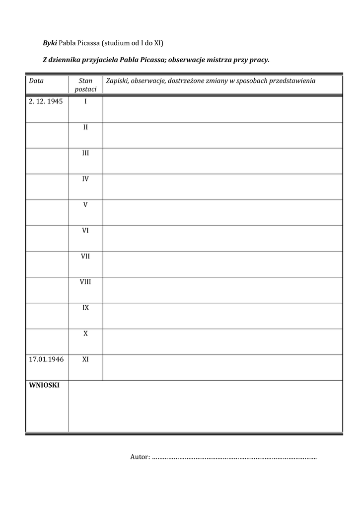 Byki Pabla Picassa (studium od I do XI) Z dziennika przyjaciela Pabla Picassa; obserwacje mistrza przy pracy. Data 2. 12. 1945 Stan postaci Zapiski, obserwacje, dostrzeżone zmiany w sposobach przedstawienia I II III IV V VI VII VIII IX X 17.01.1946 XI WNIOSKI Autor: ………………………………………………………………………………. Uwaga. Ilość miejsca na wpisanie informacji, komentarzy powinna być dostosowana do wieku, klasy i umiejętności uczniów. Warto zwrócić im uwagę na poprawność językową i merytoryczną. Prace uczniów mogą być zebrane tuż po obejrzeniu wystawy lub po ich korekcie w domu (wg uznania nauczyciela). Podczas wypełniania kart pracy uczniowie powinni dostrzec zmiany w sposobie ujęcia byka – od realistycznego do geometryzacji i uproszczeń. Lekcja daje możliwość przypomnienia (wyjaśnienia) pojęć, np.: realistyczny, barokowy, kubistyczny; stawia na inwencję twórczą dzieci i młodzieży (wejście w rolę) i ćwiczenia językowe. Pomocą w realizacji zadań może być tablica informacyjna o cyklu Byków (patrz niżej): Pablo Picasso pracował nad serią jedenastu litografii z wizerunkami byków między 5 grudnia 1945 a 17 stycznia 1946 roku, wydając swoje dzieło w osiemnastu kopiach. Procesowi twórczemu oddał się w zaciszu paryskiego warsztatu litograficznego Fernanda Mourlota, naprzemiennie wprawiając w osłupienie i przerażenie zatrudniony tam personel. Cykl Byki to swoista wizualizacja jednej z głównych myśli przyświecających artyście, który zwykł był mawiać, że „nie ma abstrakcyjnej sztuki. Zawsze trzeba od czegoś zacząć. Potem można usunąć wszelkie ślady rzeczywistości”. Picasso rozpoczął swoją pracę od wykonania rysunku byka – dumnego i silnego zwierzęcia, nakreślonego ze wszystkimi szczegółami. Po tygodniu powrócił do studia i zabrał się do pracy przy drugim kamieniu litograficznym. Przy trzecim rysunku zmienił technikę jego nanoszenia – wyskrobał zarys byka i podkreślił kontury lawowaniem. Zwierzę ulegało stopniowemu odrealnieniu i na każdym kolejnym etapie nabierało coraz bardziej geometrycznych kształtów. Picasso deformował postać byka wydłużając jego zarys, eliminując modelunek światłocieniowy i modyfikując poszczególne członki jego ciała, które zyskiwało na smukłości i lekkości. Tym samym dążył do uzyskania absolutnej esencji kształtu zwierzęcia i odkrycia istoty jego ducha oraz fizyczności wraz z towarzyszącymi jej głównymi cechami: muskularnością i siłą. Zdaniem obserwującego go z coraz większym zdumieniem personelu warsztatu Picasso zakończył swoją pracę w momencie, w którym, ich zdaniem, powinien był zacząć. Poszukując źródeł inspiracji służących twórcy w procesie powstawania tej serii litografii często wymienia się jaskinie Lascaux, Altamira czy też Niaux, których ściany przepełniają wizerunki pozbawionych jakiegokolwiek ciężaru zwierząt, ukazanych przy pomocy prostych, syntetycznych linii. Istnieje nawet legenda mówiąc, że na widok paleolitycznych malowideł Picasso miał zachwycony zakrzyknąć: „Niczego nie wynaleźliśmy!”. Niestety, nie istnieją niezbite dowody na obecność artysty w którejkolwiek ze słynnych jaskiń. Przygotowały: Elżbieta Kazańska Ewa Obara–Grączewska