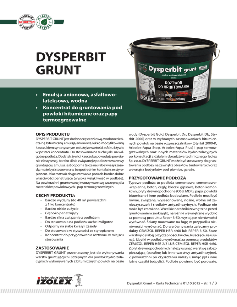 DYSPERBIT GRUNT • Emulsja anionowa, asfaltowolateksowa, wodna • Koncentrat do gruntowania pod powłoki bitumiczne oraz papy termozgrzewalne OPIS PRODUKTU DYSPERBIT GRUNT jest drobnocząsteczkową, wodorozcieńczalną bitumiczną emulsją anionową lekko modyfikowaną kauczukiem syntetycznym o dużej zawartości asfaltu i żywic w postaci koncentratu. Do stosowania na suche jak i na wilgotne podłoża. Dodatek żywic i kauczuku powoduje powstanie elastycznej, bardzo silnie związanej z podłożem warstwy gruntującej. Emulsja jest odporna także na słabe kwasy i zasady, może być stosowana w bezpośrednim kontakcie ze styropianem. Jako roztwór do gruntowania posiada bardzo dobre właściwości penetrujące (wysoka wsiąkliwość w podłoże). Na powierzchni gruntowanej tworzy warstwę szczepną dla materiałów powłokowych i pap termozgrzewalnych. CECHY PRODUKTU: • Bardzo wydajny (do 40 m2 powierzchni z 1 kg koncentratu) • Bardzo niskie zużycie • Głęboko penetrujący • Bardzo silna związanie z podłożem • Do stosowania na podłoża suche i wilgotne • Odporny na słabe kwasy i zasady • Do stosowania w styczności ze styropianem • Koncentrat do przygotowania roztworu w miejscu stosowania ZASTOSOWANIE DYSPERBIT GRUNT przeznaczony jest do wykonywania warstw gruntujących i sczepnych dla powłok hydroizolacyjnych wykonywanych z bitumicznych powłok na bazie wody (Dysperbit Gold, Dysperbit Dn, Dysperbit Db, Styrbit 2000) oraz w wybranych zastosowaniach bitumicznych powłok na bazie rozpuszczalników (Styrbit 2000-K, Arbolex-Aqua Stop, Arbolex-Aqua Plus) i pap termozgrzewalnych oraz innych materiałów hydroizolacyjnych po konsultacji z działem doradztwa technicznego Izolex Sp. z o.o. DYSPERBIT GRUNT może być stosowany do gruntowania podłoży na zewnątrz obiektów budowlanych oraz wewnątrz budynków pod piwnice, garaże. PRZYGOTOWANIE PODŁOŻA Typowe podłoża to podłoża cementowe, cementowo-wapienne, beton, cegły, bloczki gipsowe, beton komórkowy, płyty drewnopochodne (OSB, MDF), papy, powłoki bitumiczne i inne podłoża budowlane. Podłoże musi być równe, związane, wysezonowane, nośne, wolne od zanieczyszczeń i środków antyadhezyjnych. Podłoże nie może być zmrożone. Wszelkie narożniki zewnętrzne przed gruntowaniem zaokrąglić, narożniki wewnętrzne wyoblić za pomocą produktu Reper 3-50, wystające nierówności wyrównać. Ściany murowane na fugę w przypadku nierówności wyrównać. Do wyrównywania zalecamy produkty CEMIZOL REPER HSR 4/60 lub REPER 3-50. Stare warstwy o słabej przyczepności, kruche, łuszczące się usunąć. Ubytki w podłożu wyrównać za pomocą produktów CEMIZOL REPER HSR 2/5 LUB CEMIZOL REPER HSR 4/60. Z płyt drewnopochodnych należy usunąć warstwę zabezpieczającą (parafinę lub inne warstwy antyadhezyjne). Z powierzchni po czyszczeniu należy usunąć pył i inne luźne cząstki (odpylić). Podłoże powinno być porowate. Dysperbit Grunt – Karta Techniczna 01.10.2015 – str. 1 / 3 Podłoża gładkie zmatować. Jakość podłoża ma ogromne znaczenie dla przyczepności kolejnych warstw hydroizolacyjnych. W przypadku nierówności podłoża wyraźnie wzrasta zużycie materiałów powłokowych. PRZYGOTOWANIE PRODUKTU Przed przystąpieniem do wykonania roztworu DYSPERBITU GRUNT ocenić potrzebną ilość koncentratu uwzględniając zużycie roztworu przy odpowiednim rozcieńczeniu koncentratu z wodą (patrz tabela „DANE TECHNICZNE”) oraz przeznaczoną do gruntowania powierzchnię. Przygotować tylko niezbędną ilość roztworu na założoną powierzchnię podłoża do gruntowania. Do odpowiedniej wielkości czystego naczynia wlać niewielką ilość wody (około 5% założonej ilości) i włożyć potrzebną ilość koncentratu. Wymieszać mieszadłem wolnoobrotowym i po uzyskaniu jednorodnej konsystencji wlać resztę wody nadal mieszając roztwór przez około minutę. Do rozcieńczania używać czystej, chłodnej wody. Tak przygotowany roztwór nadaje się do aplikacji. WYKONANIE Roztwór DYSPERBITU GRUNT nanosić na podłoże w jednej warstwie, równomiernie szczotką, pędzlem, wałkiem malarskim dobrze wcierając w podłoże lub urządzeniem natryskowym. W przypadku podłoży bardzo chłonnych nanieść dwie warstwy gruntu. Warstwy hydroizolacji powłokowej nakładać bezpośrednio po związaniu (wyschnięciu) DYSPERBITU GRUNT. WARUNKI WYKONANIA Prace prowadzić w temperaturze otoczenia i podłoża +5°C do +35°C. Świeżo zagruntowane podłoże chronić podczas wiązania (schnięcia) przed deszczem, silną mgłą i mrozem. Nakładanie kolejnych powłok hydroizolacyjnych wykonywać bezpośrednio po związaniu gruntu, nie dopuszczać do zabrudzenia warstwy gruntu przez kurz i inne środki antyadhezyjne. Niska temperatura oraz wysoka wilgotność powietrza i podłoża znacznie wydłuża czas wiązania gruntu. DYSPERBITU GRUNT nie stosować w pomieszczeniach przeznaczonych na pobyt ludzi. NARZĘDZIA: Mieszadło wolnoobrotowe, pędzel, szczotka, wałek malarski, urządzenie natryskowe. CZYSZCZENIE NARZĘDZI Narzędzia w czasie i po zakończeniu prac myć wodą pozostawić do wyschnięcia. W przypadku zaschnięcia masy czyścić z użyciem rozpuszczalników organicznych. Urzą- dzenie natryskowe czyścić natychmiast po zakończeniu prac zgodnie z zaleceniami producenta urządzenia. SKŁADOWANIE I TRANSPORT DYSPERBITU GRUNT przechowywać w suchych i chłodnych pomieszczeniach w szczelnie zamkniętych opakowaniach. Podczas przechowywania i transportu nie dopuszczać do przemrożenia produktu oraz długotrwałego narażenia na oddziaływanie wysokich temperatur. OPAKOWANIA • Wiadro plastikowe 1; 3; 5; 10; 20 kg UWAGI • Prace prowadzić zgodnie z zasadami sztuki budowlanej, instrukcją producenta, normami i właściwymi przepisami BHP. • Stosować odpowiednie środki ochrony osobistej wymagane podczas prac z produktami bitumicznymi. • Produkt chronić przed dziećmi. W razie zabrudzeni